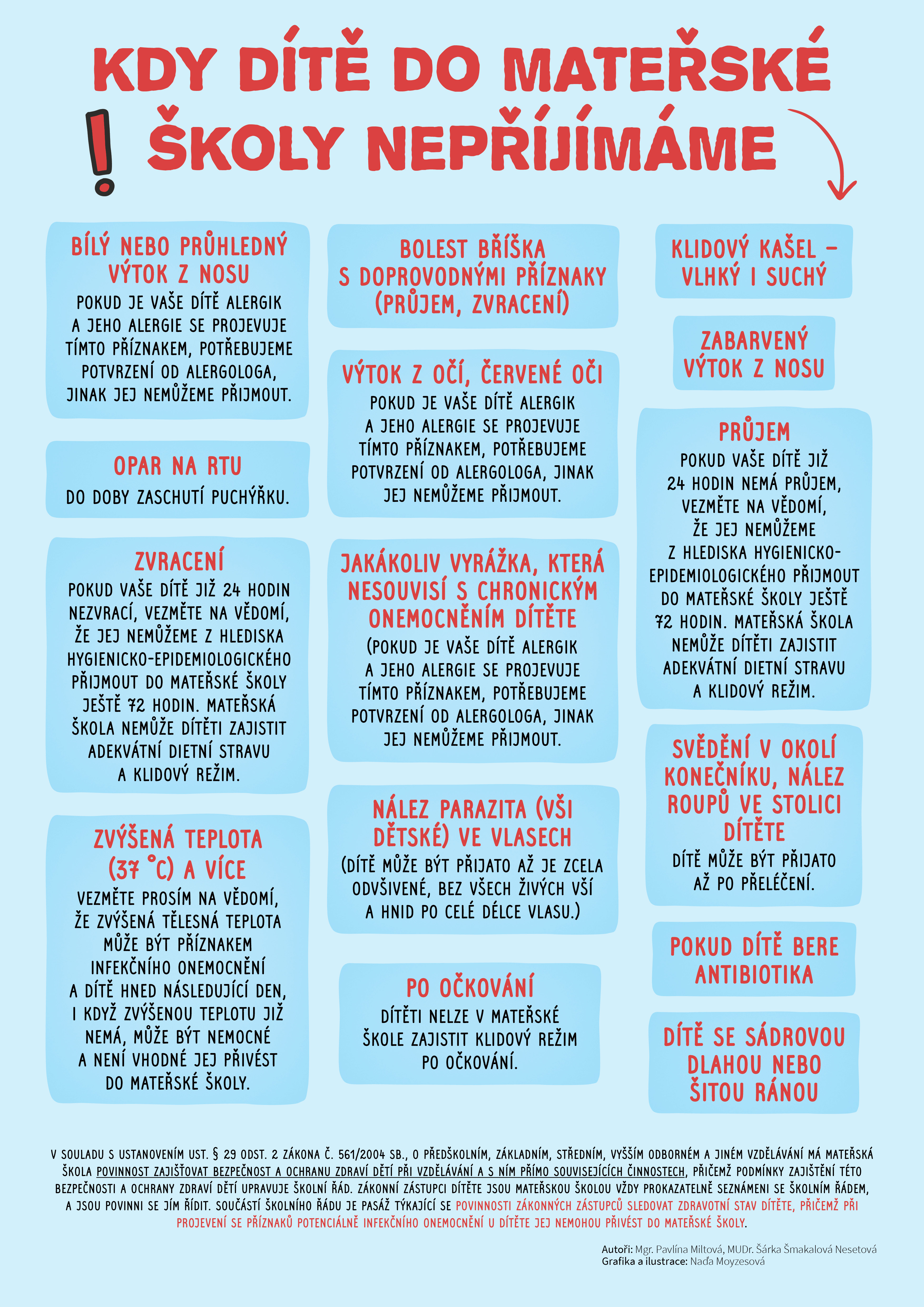 Dětem v předškolním věku se teprve buduje imunita a při zvýšené nemocnosti dětí je pro nás nesmírně důležité, aby do kolektivu přicházely skutečně jen zdravé děti. I zdánlivě „malá rýma“ nebo kašel může být na začátku infekčního onemocnění, které se velmi rychle šíří mezi ostatní děti – a často i mezi dospělé.