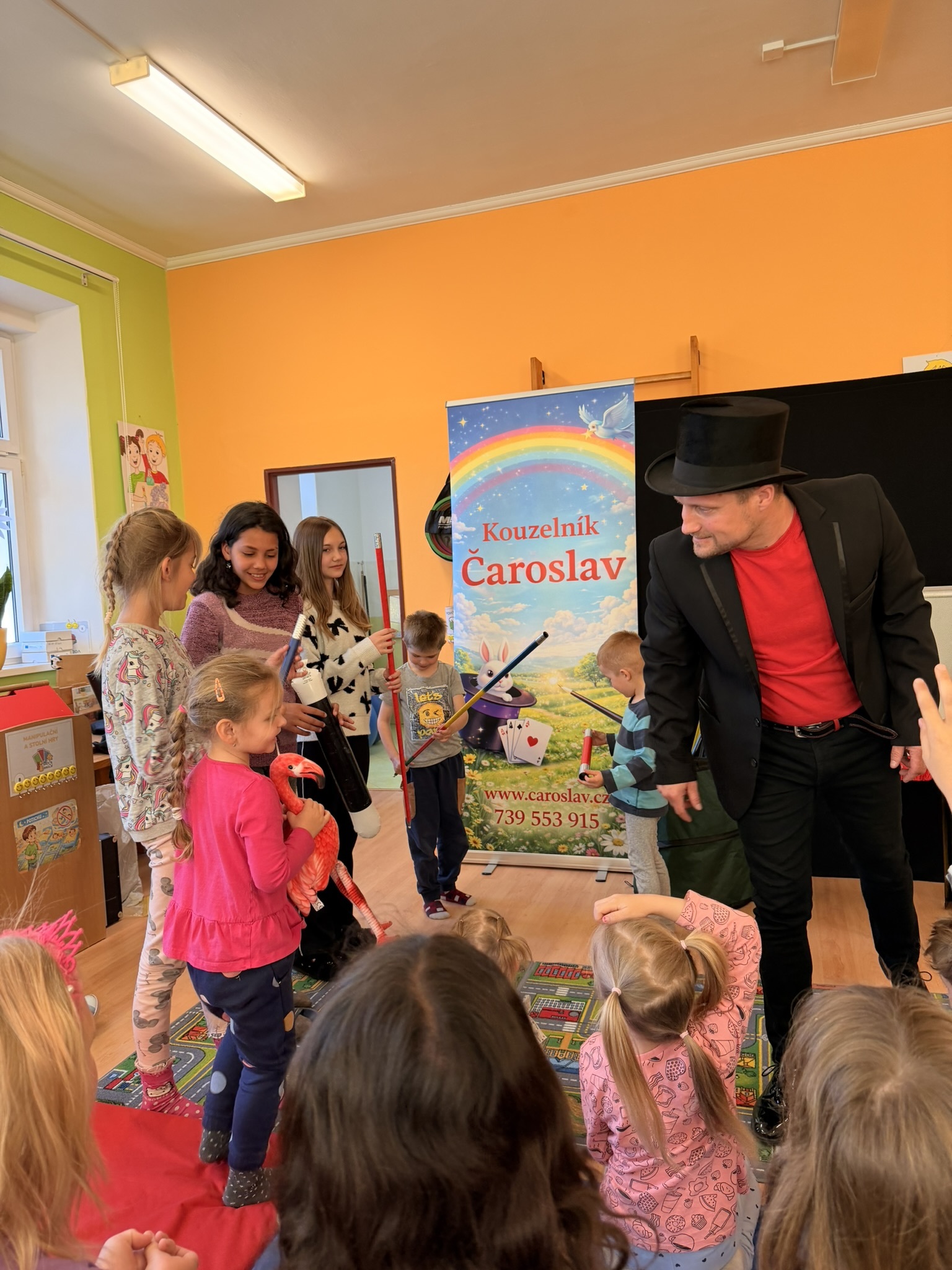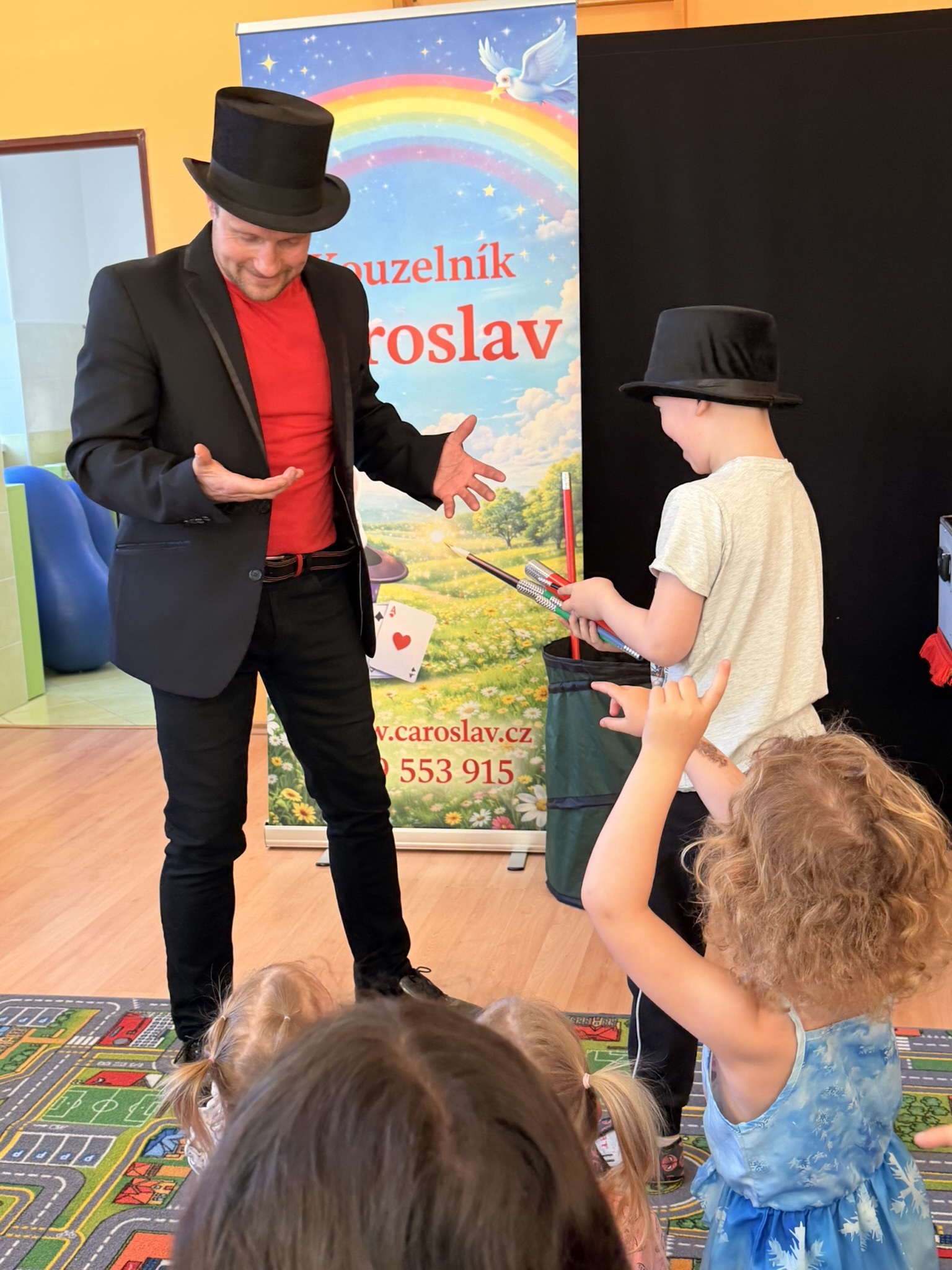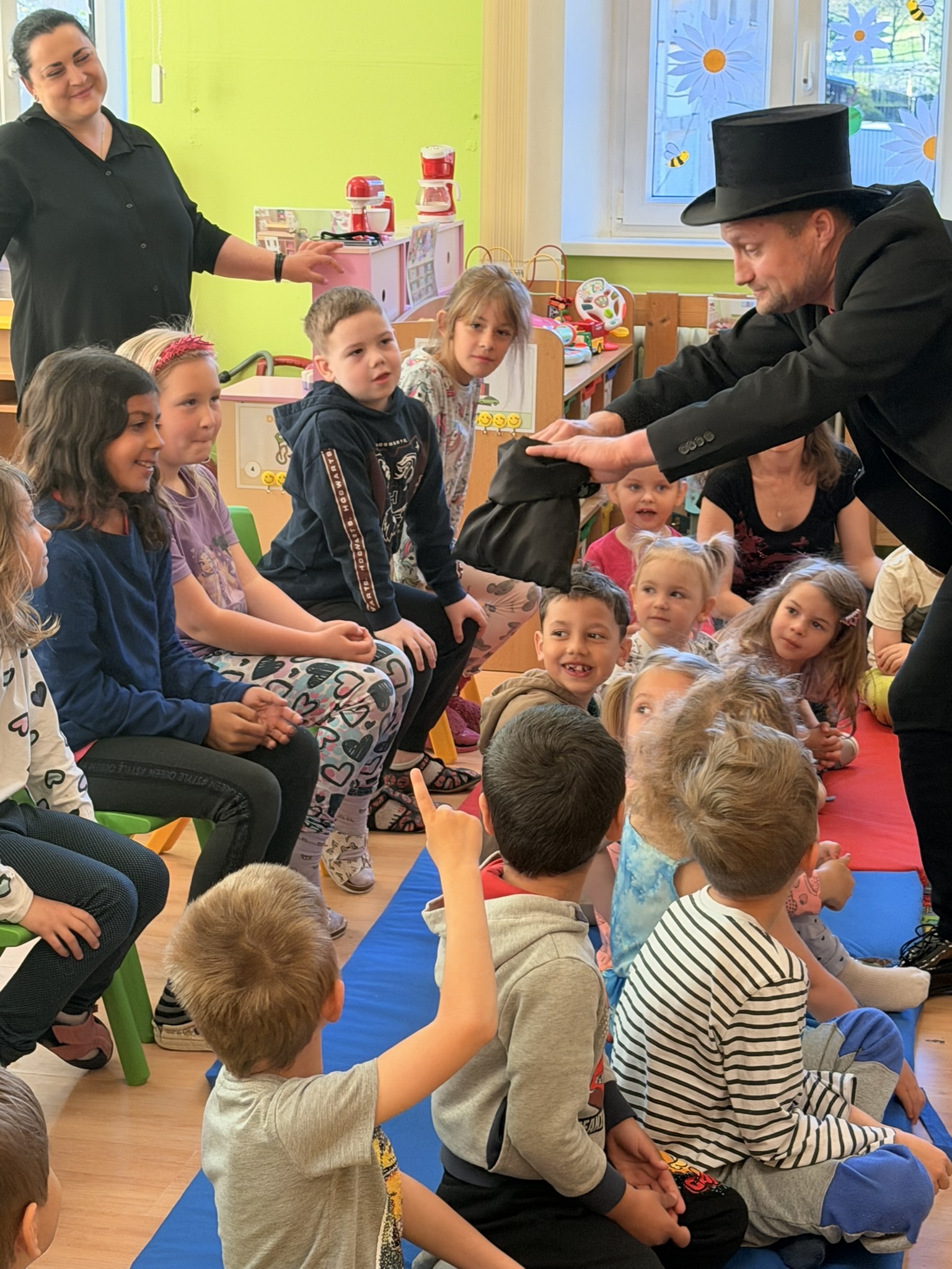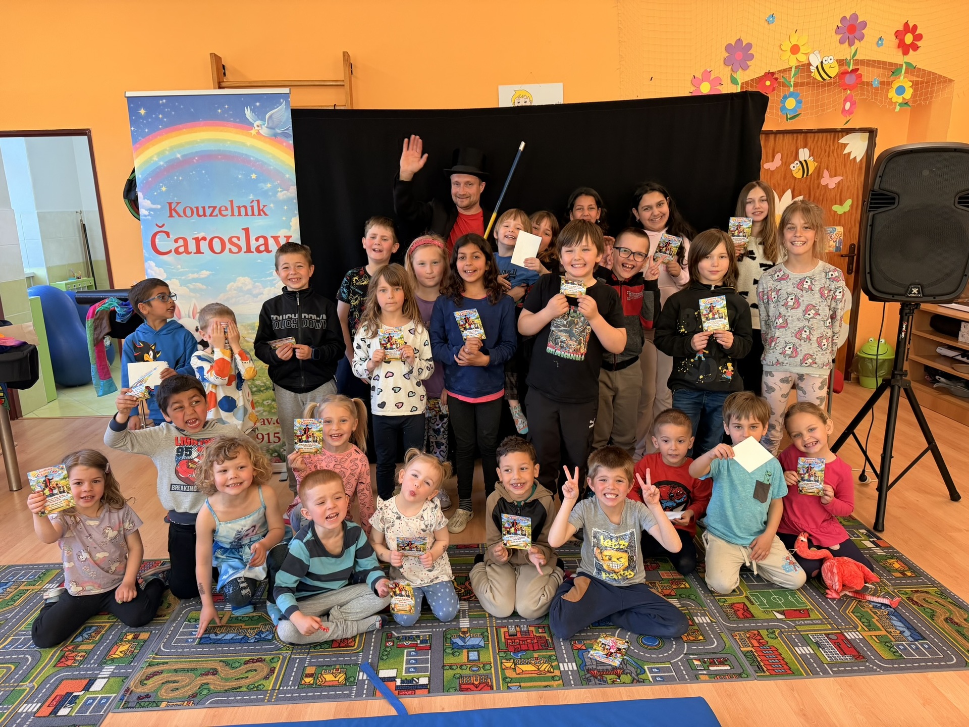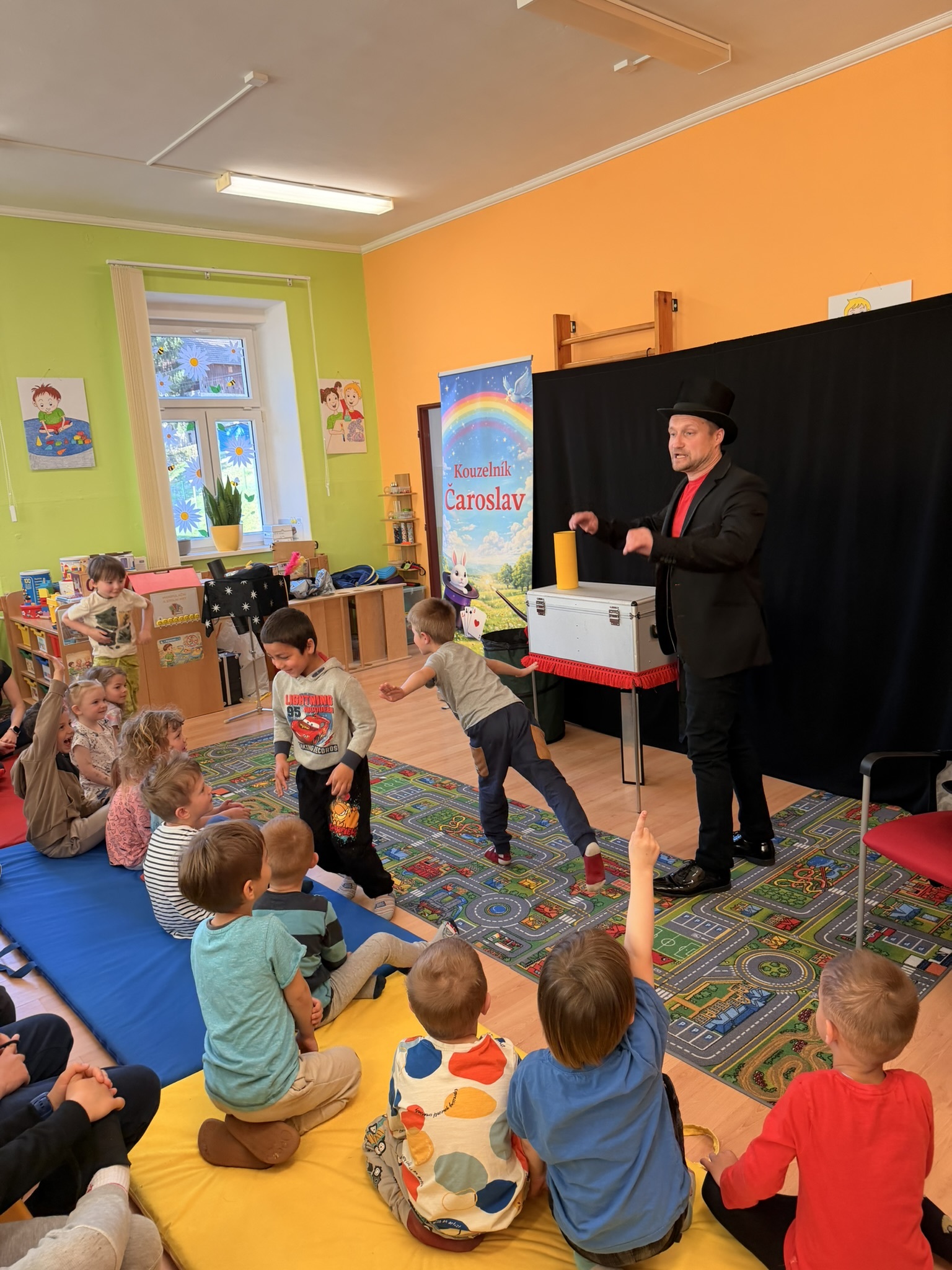 Dnešní den nám zpestřil svou návštěvou kouzelník Čaroslav, který si získal pozornost dětí hned v první minutě svého vystoupení. Od samého začátku bylo jasné, že nás čeká nezapomenutelná show plná překvapení, smíchu a úžasu.
