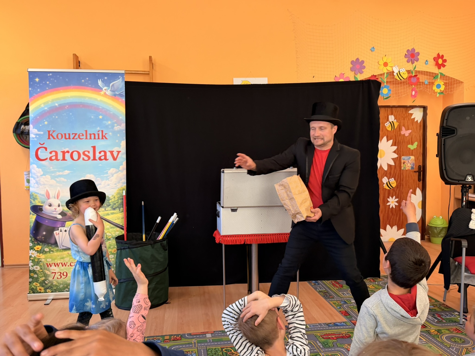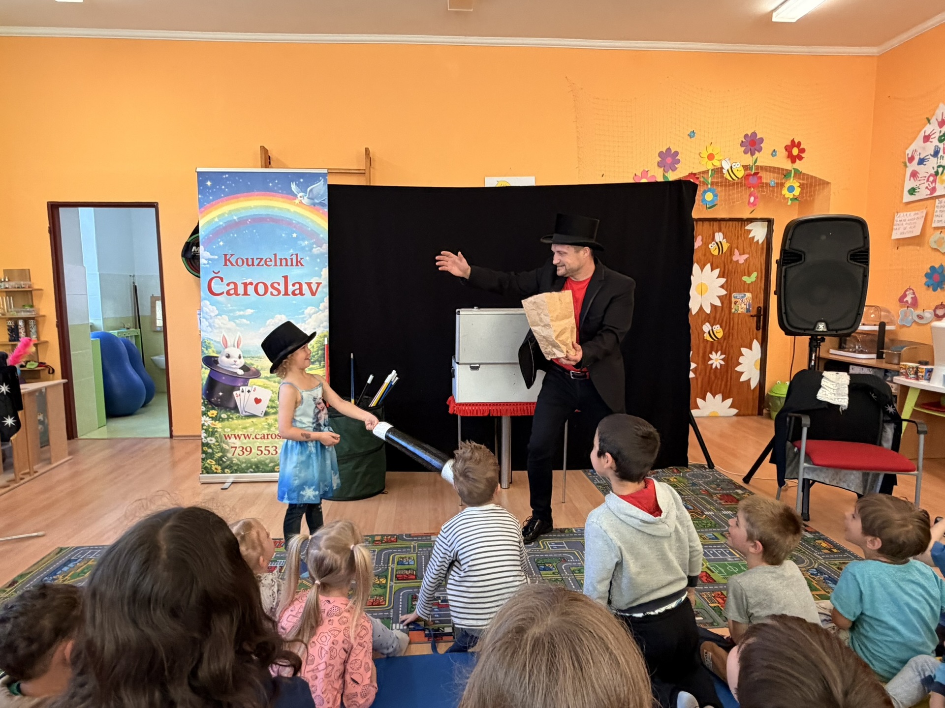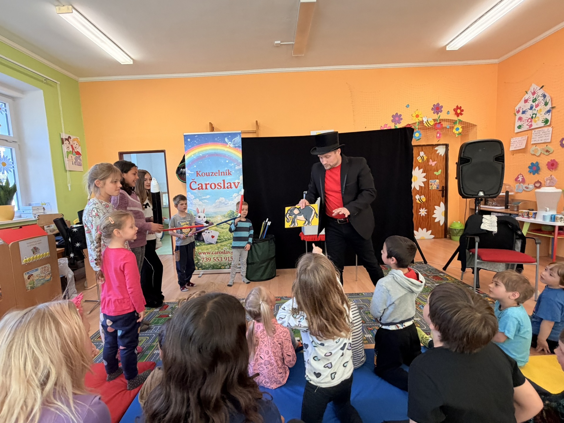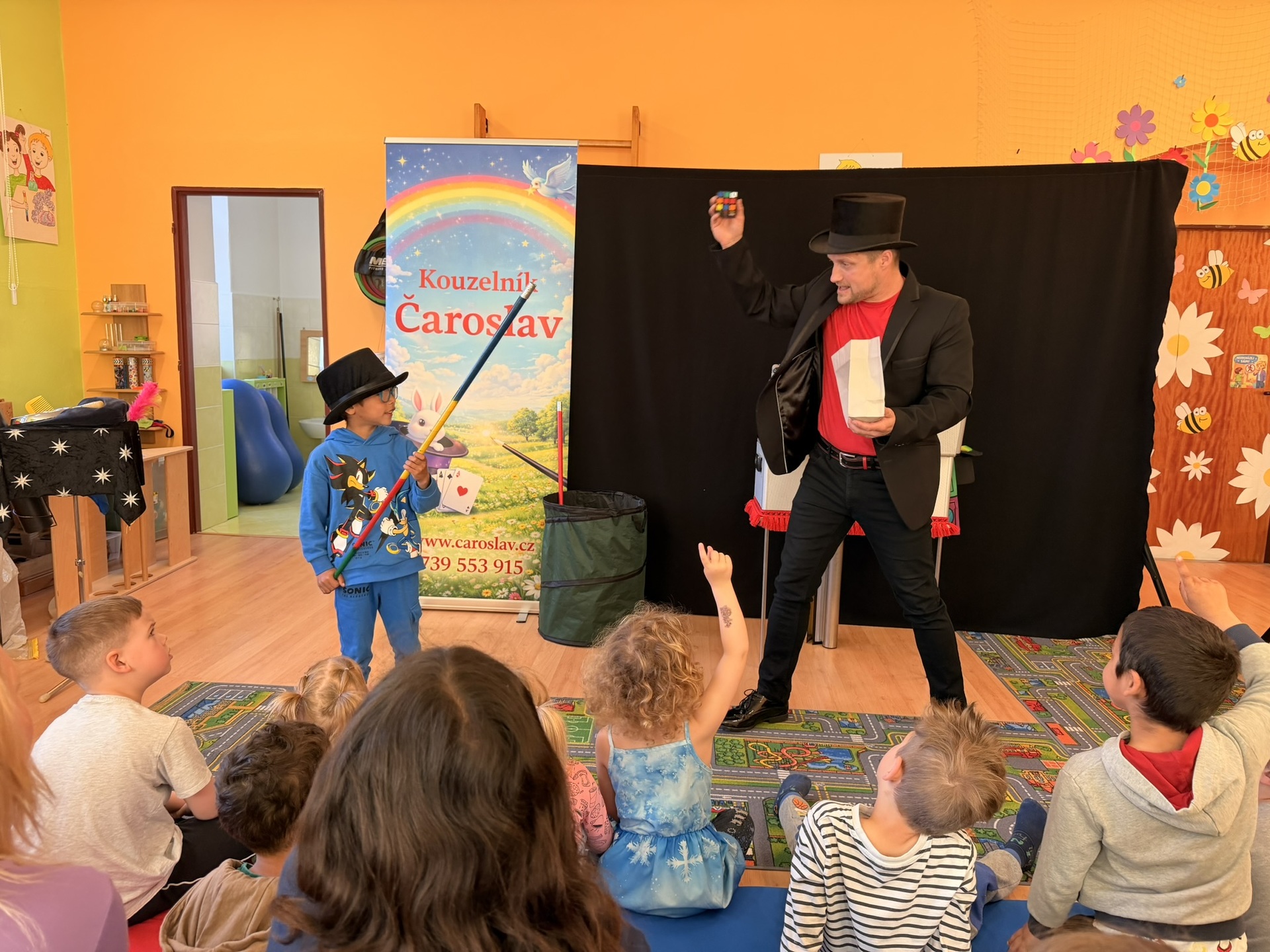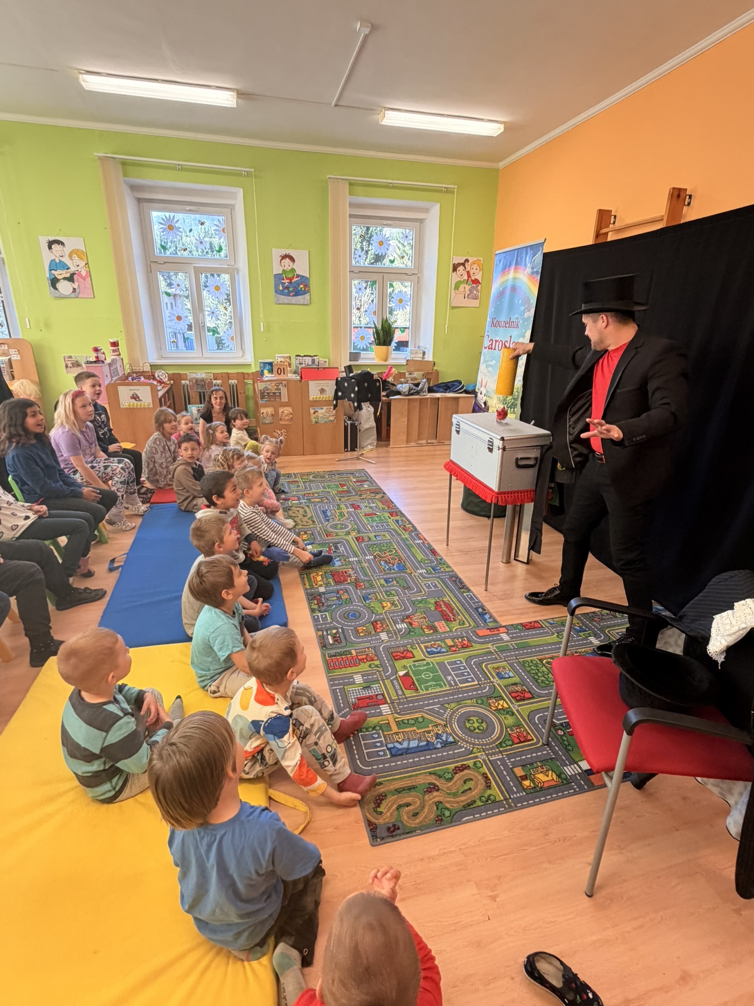 Dnešní den nám zpestřil svou návštěvou kouzelník Čaroslav, který si získal pozornost dětí hned v první minutě svého vystoupení. Od samého začátku bylo jasné, že nás čeká nezapomenutelná show plná překvapení, smíchu a úžasu.