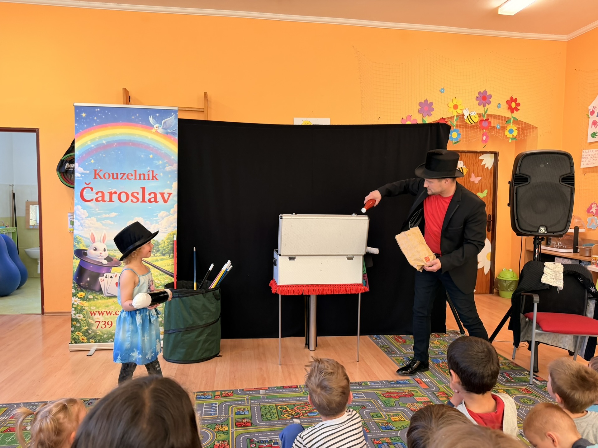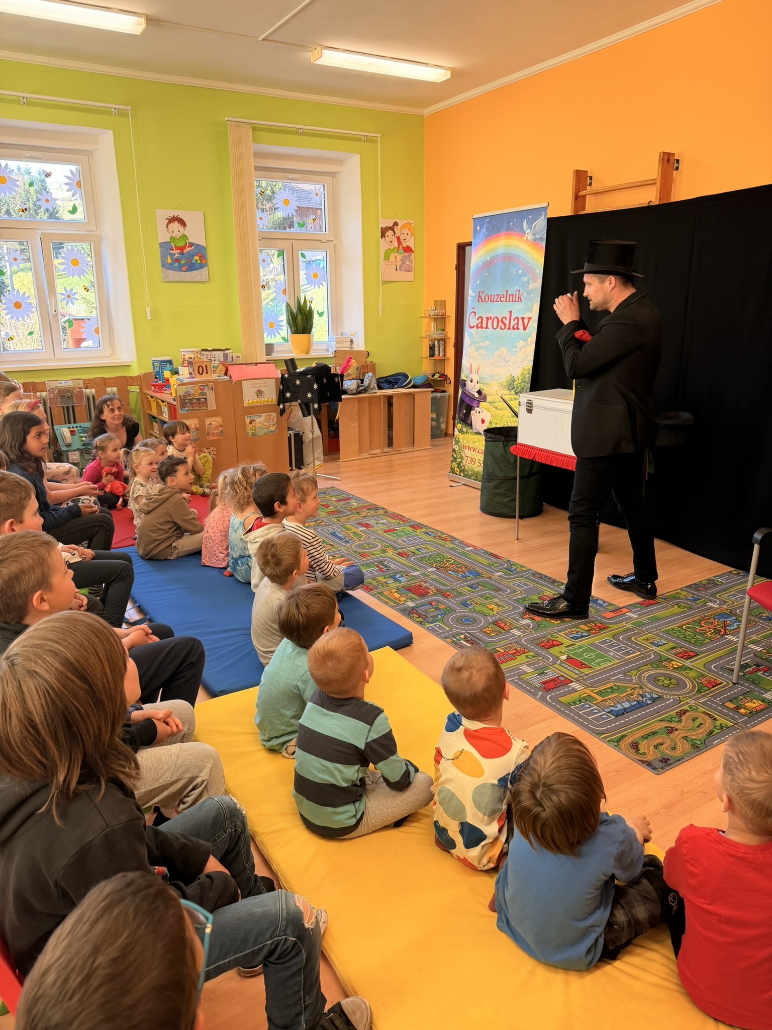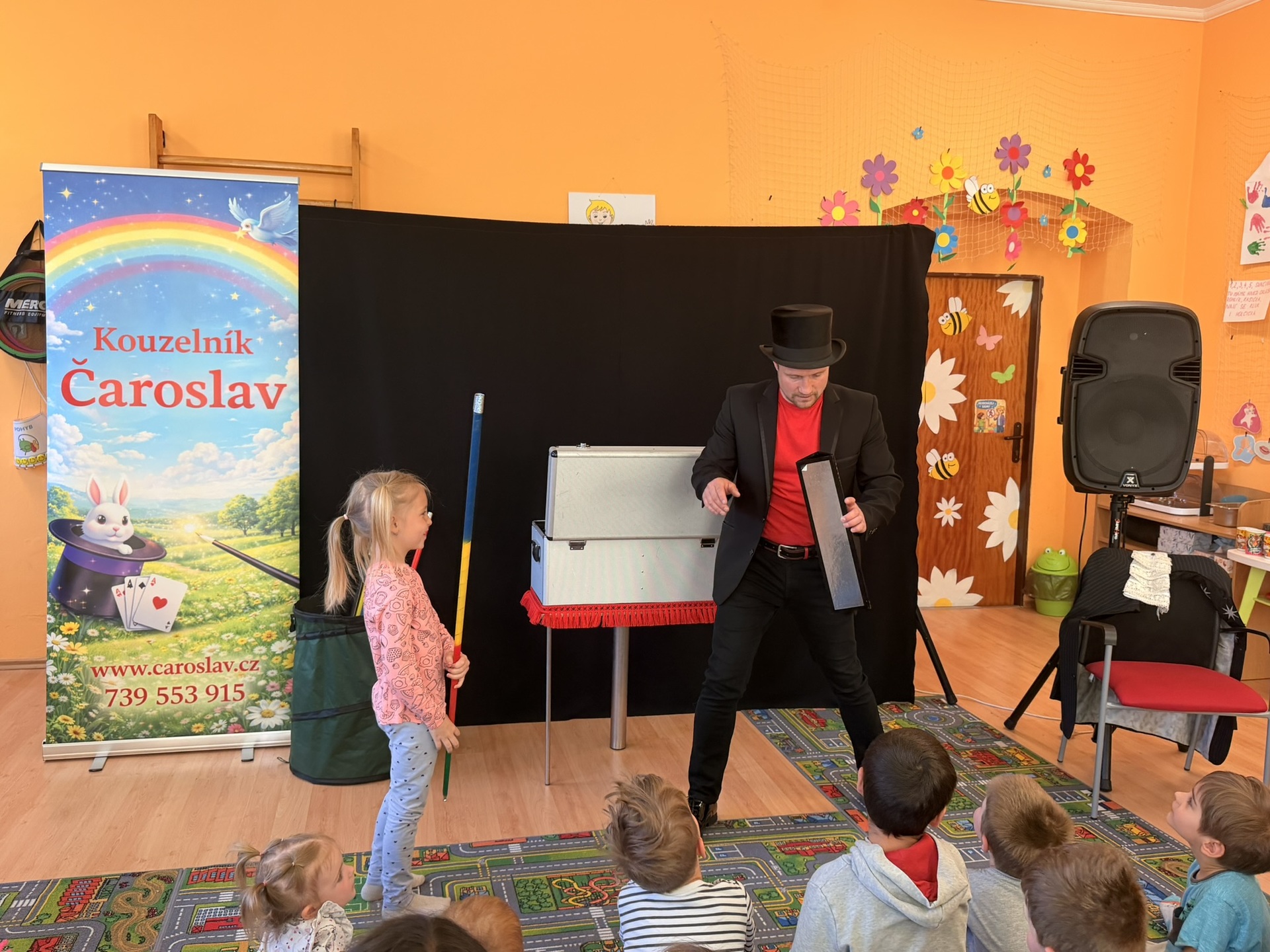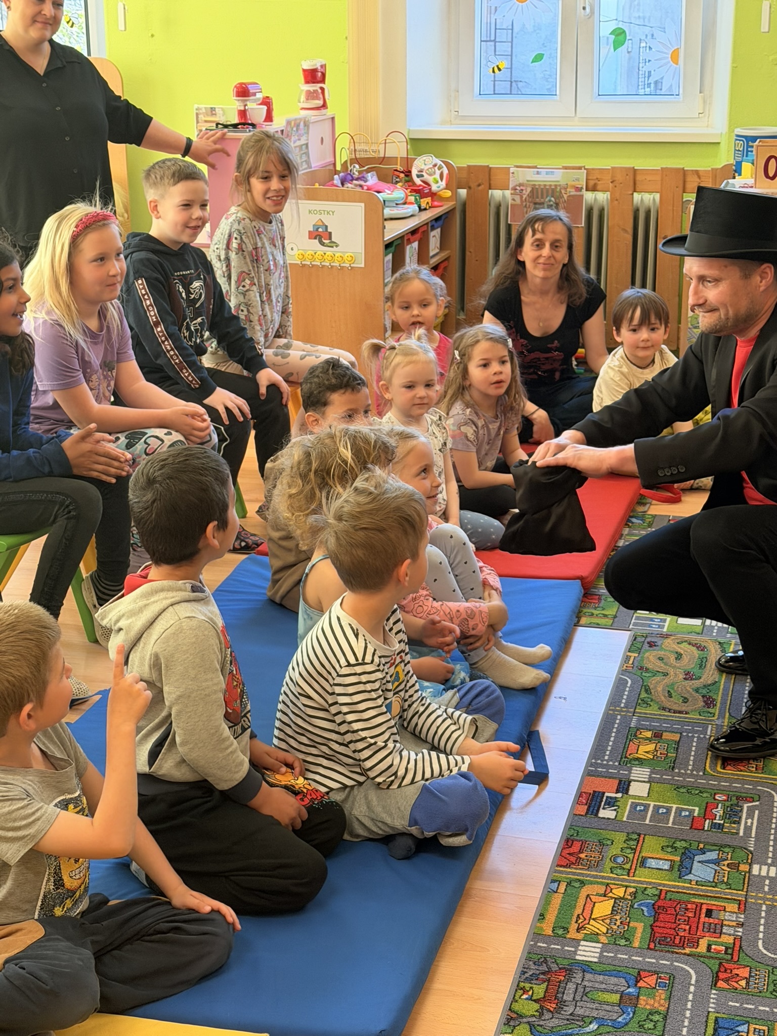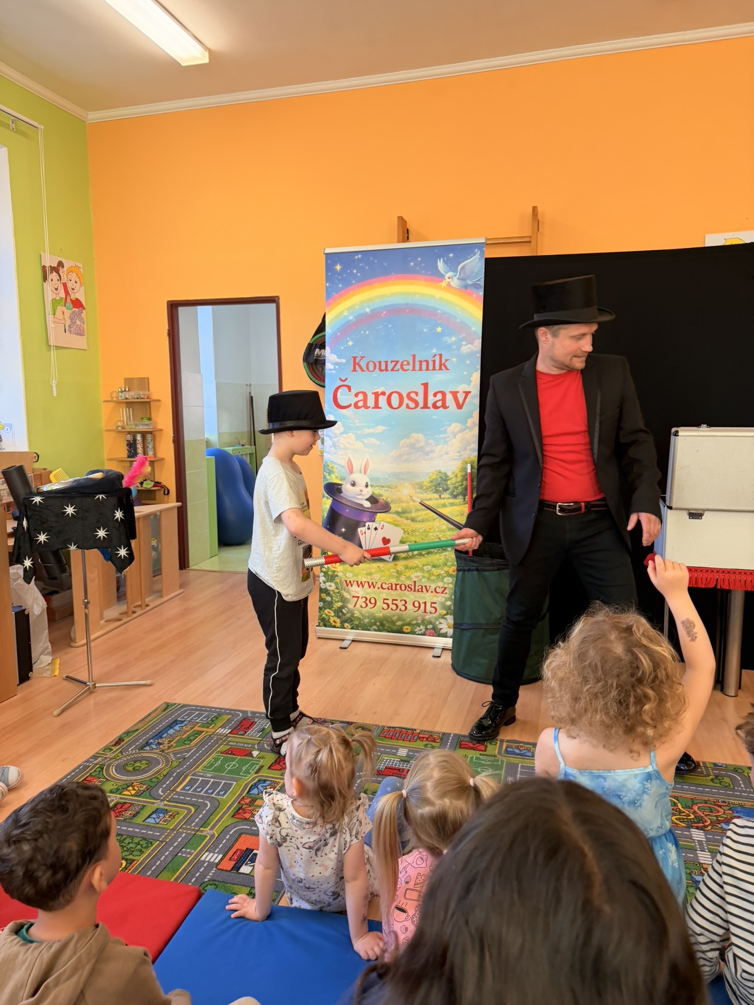 Dnešní den nám zpestřil svou návštěvou kouzelník Čaroslav, který si získal pozornost dětí hned v první minutě svého vystoupení. Od samého začátku bylo jasné, že nás čeká nezapomenutelná show plná překvapení, smíchu a úžasu.