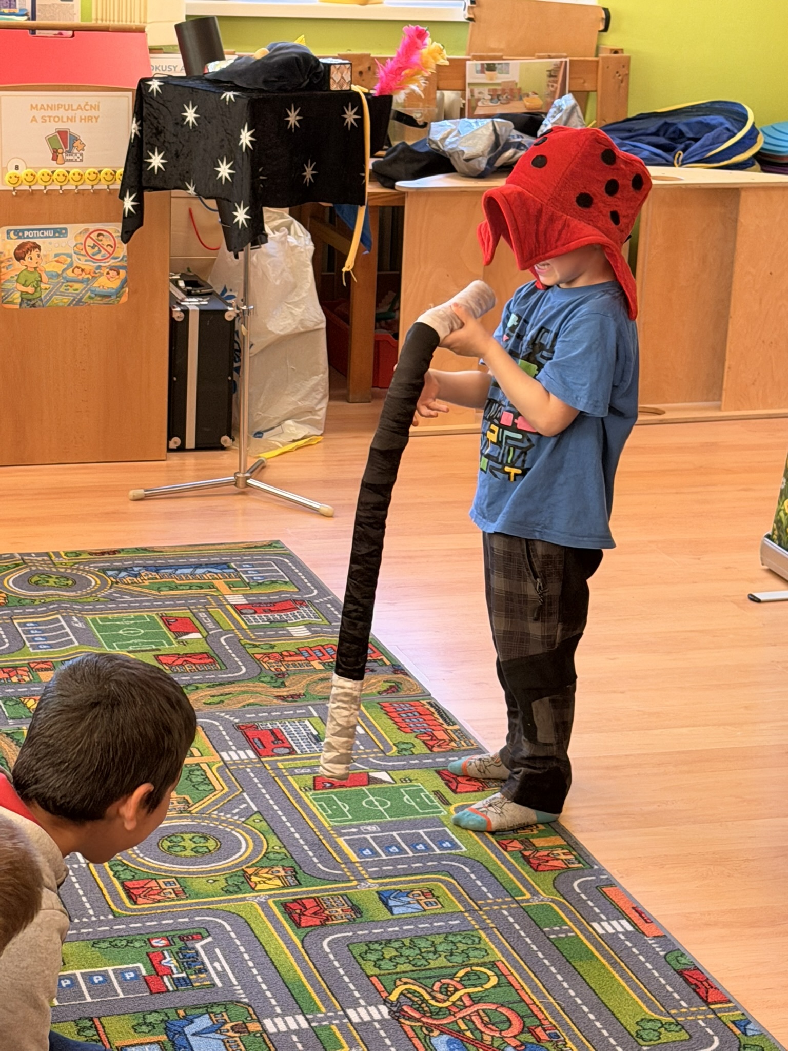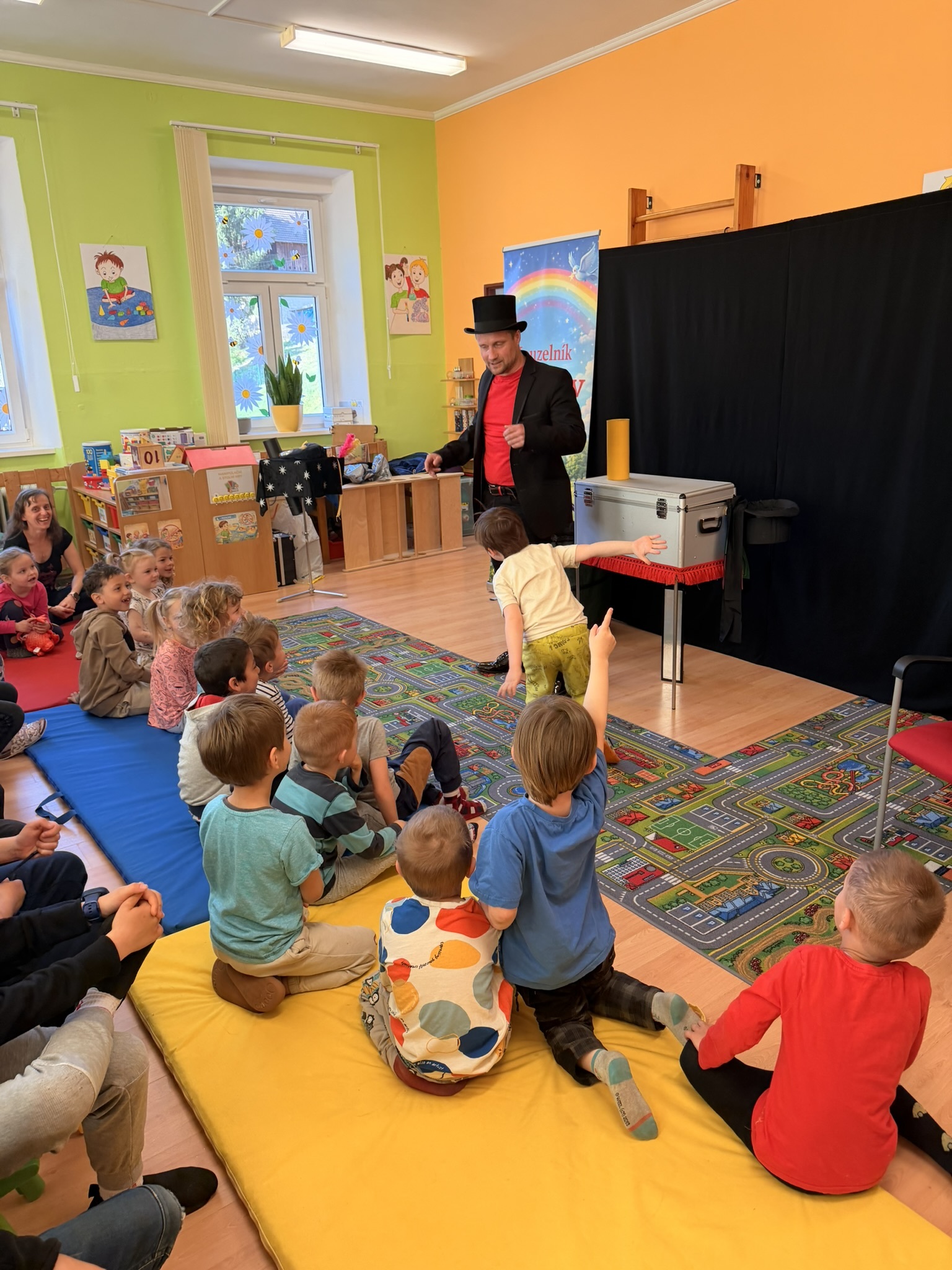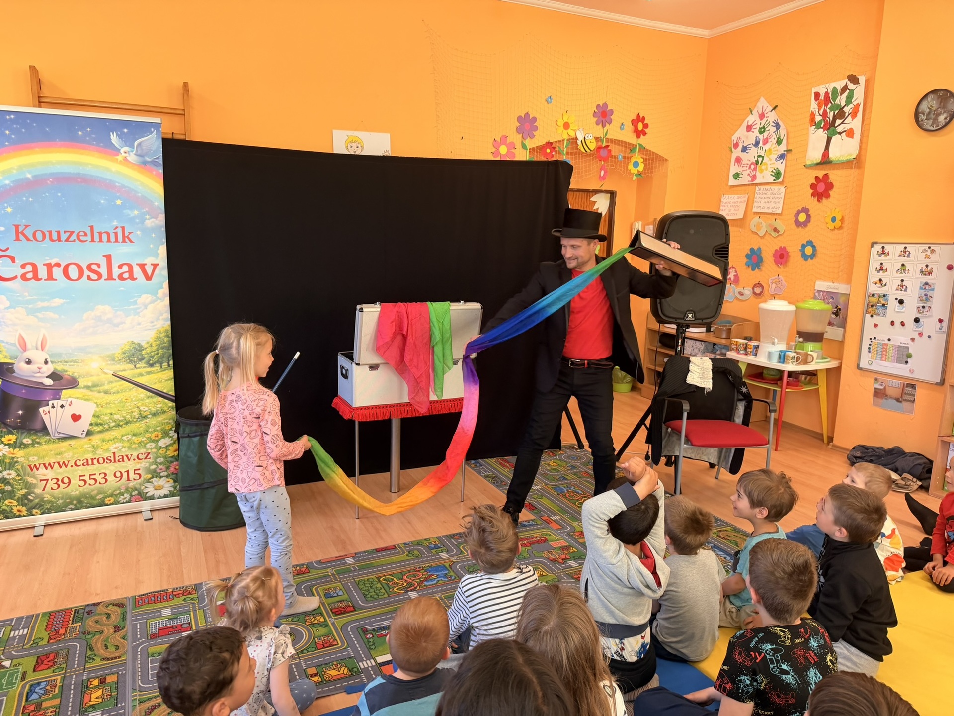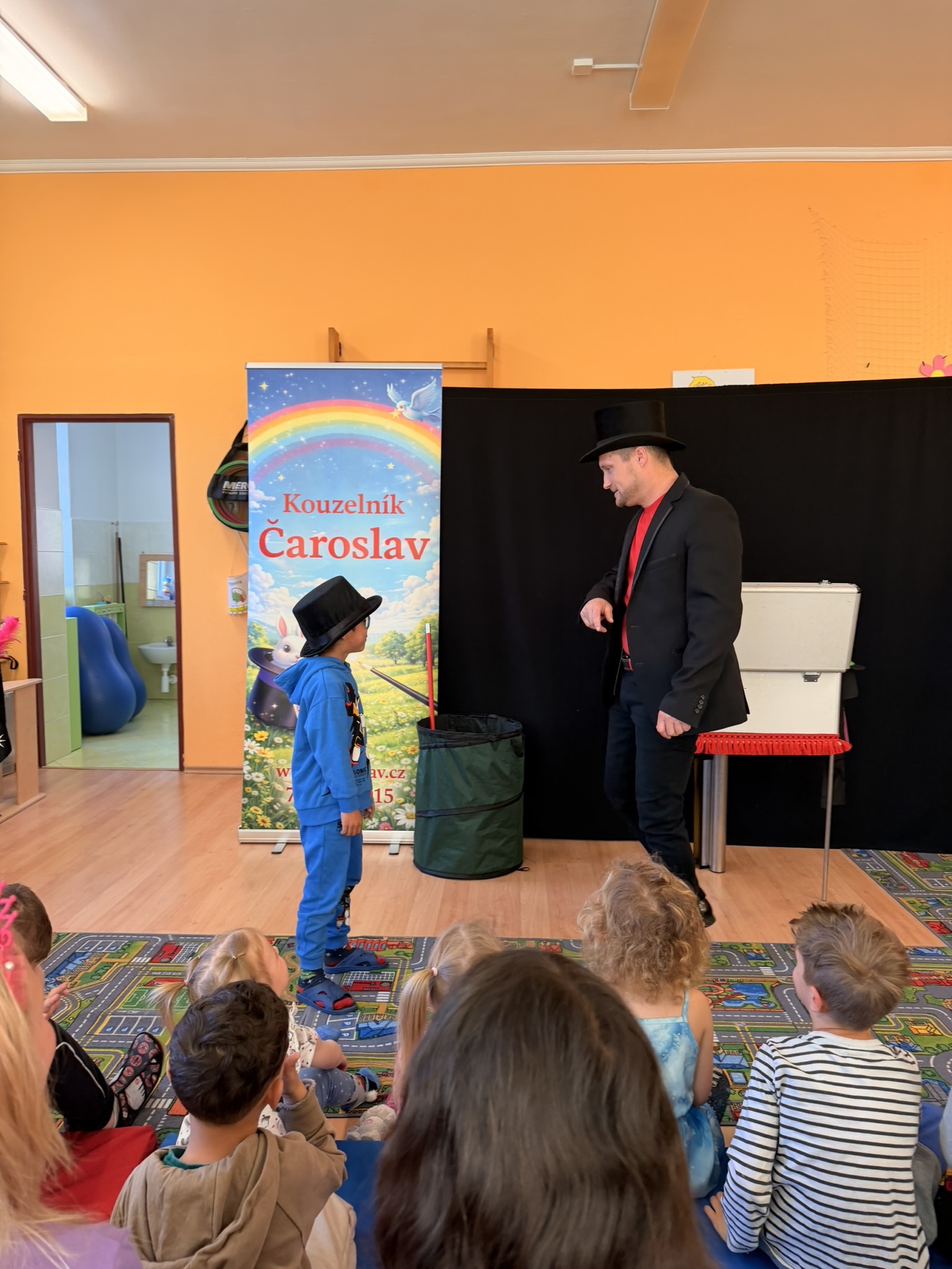 Dnešní den nám zpestřil svou návštěvou kouzelník Čaroslav, který si získal pozornost dětí hned v první minutě svého vystoupení. Od samého začátku bylo jasné, že nás čeká nezapomenutelná show plná překvapení, smíchu a úžasu.