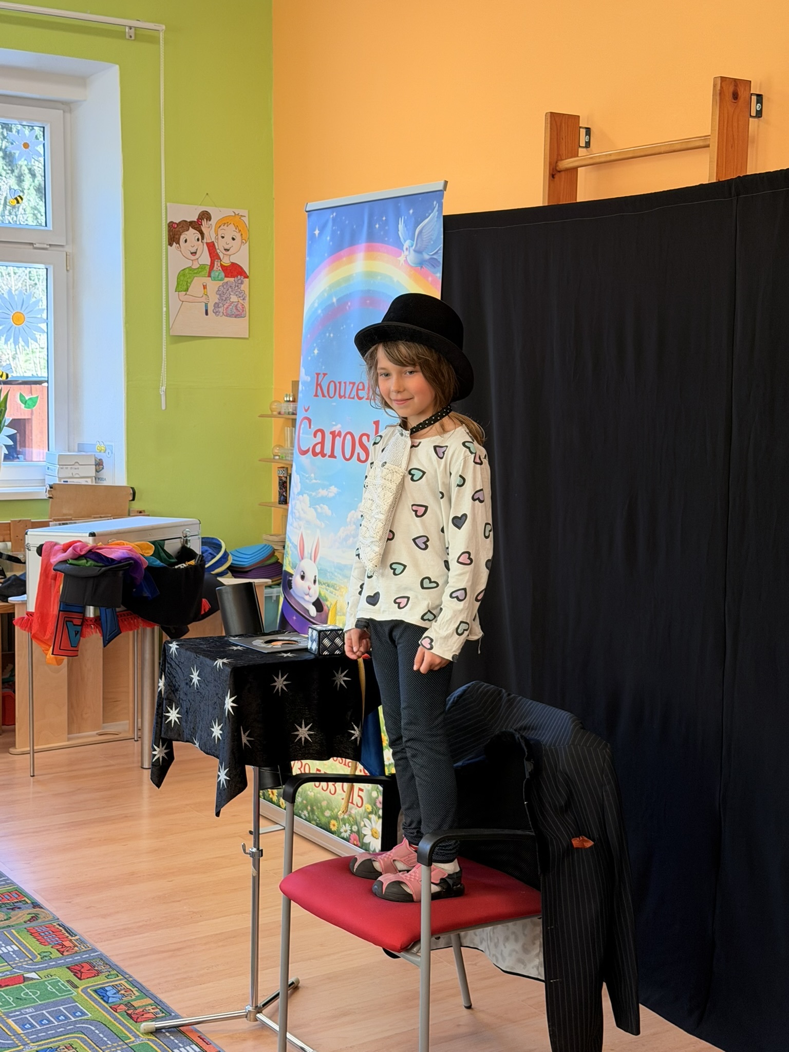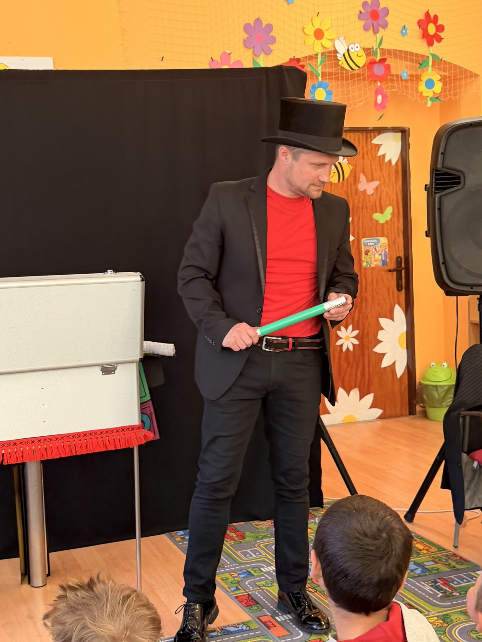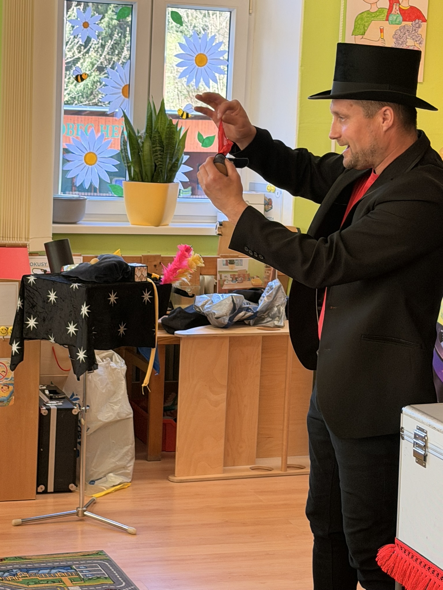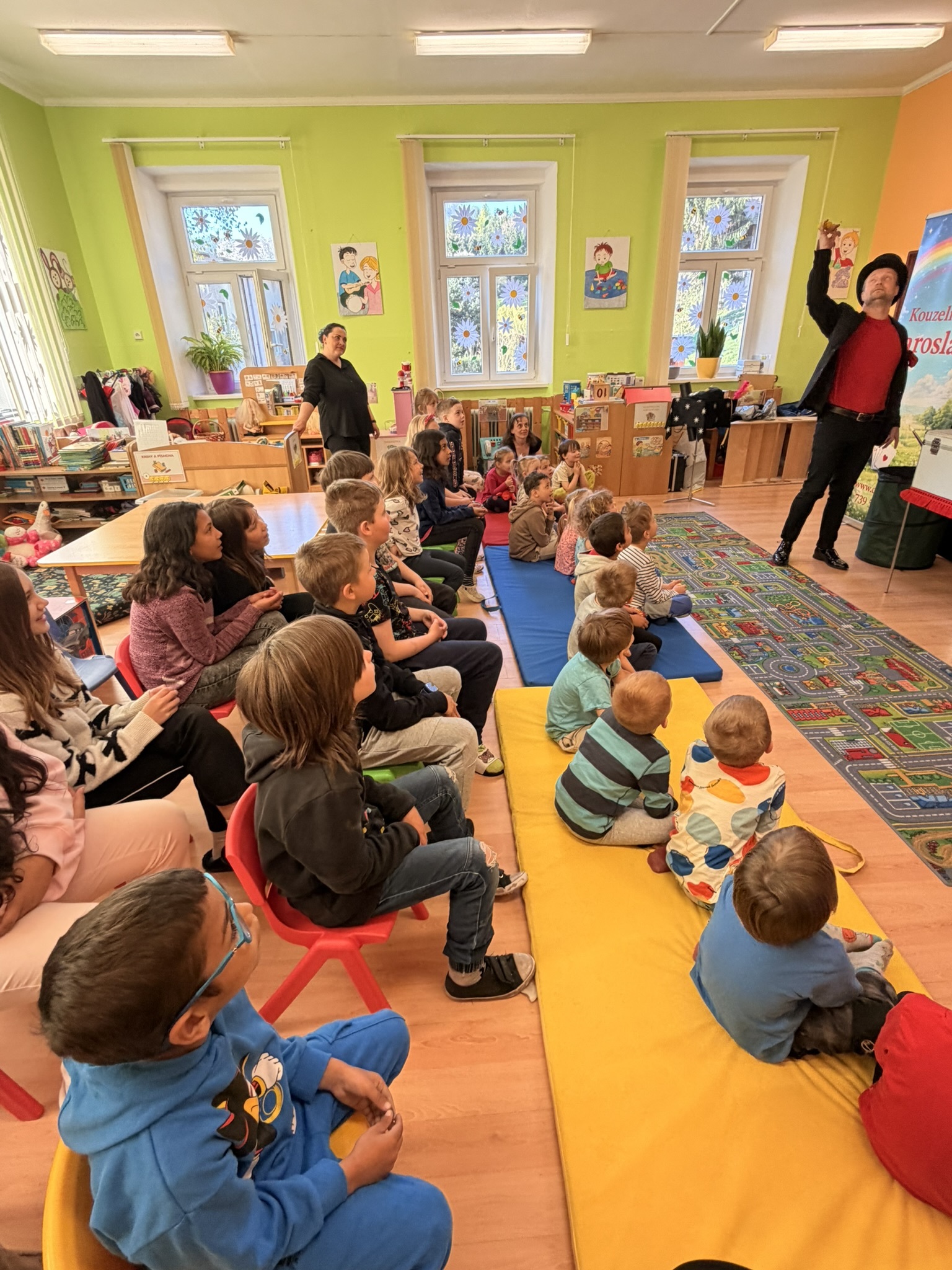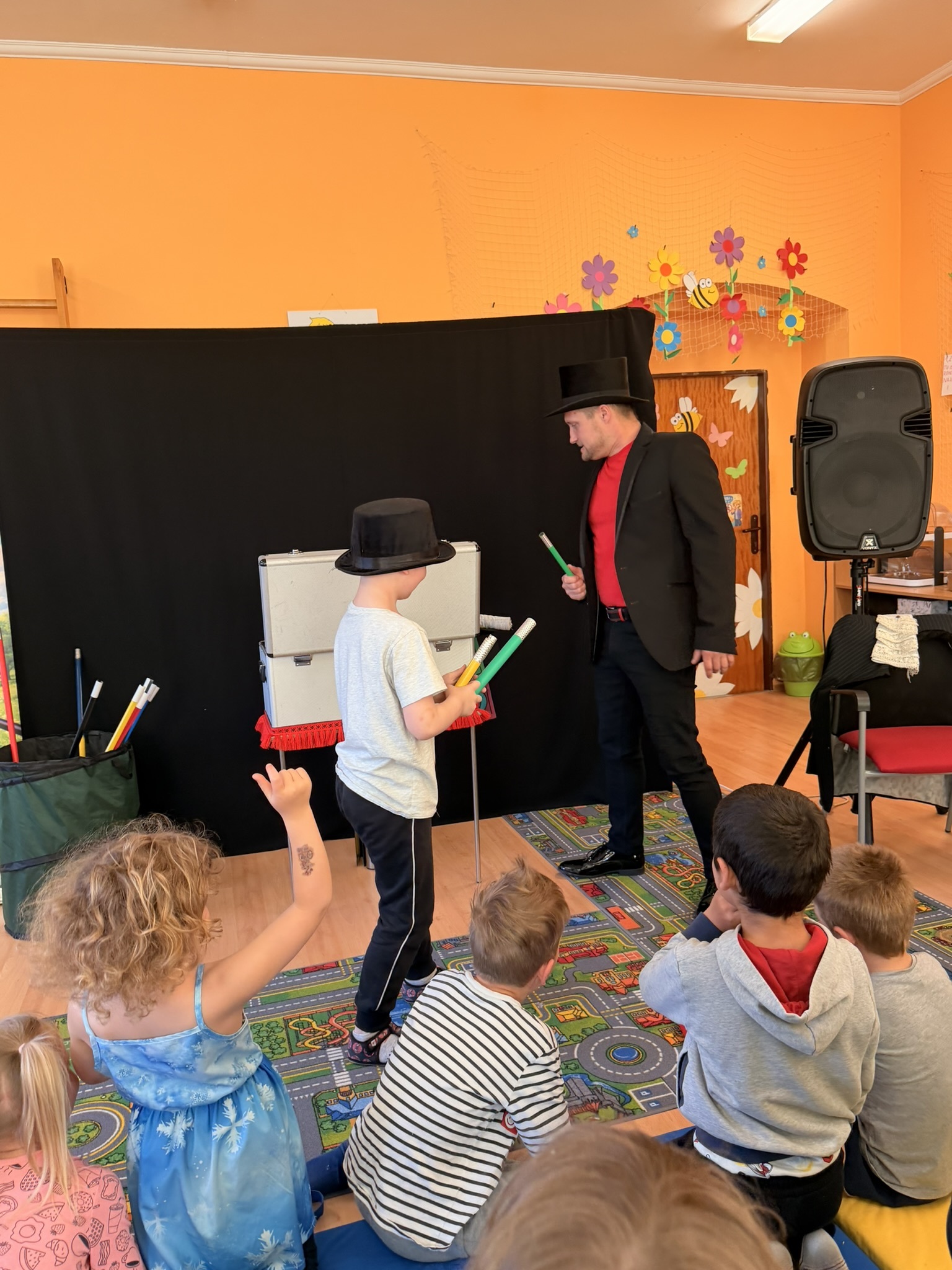 Dnešní den nám zpestřil svou návštěvou kouzelník Čaroslav, který si získal pozornost dětí hned v první minutě svého vystoupení. Od samého začátku bylo jasné, že nás čeká nezapomenutelná show plná překvapení, smíchu a úžasu.