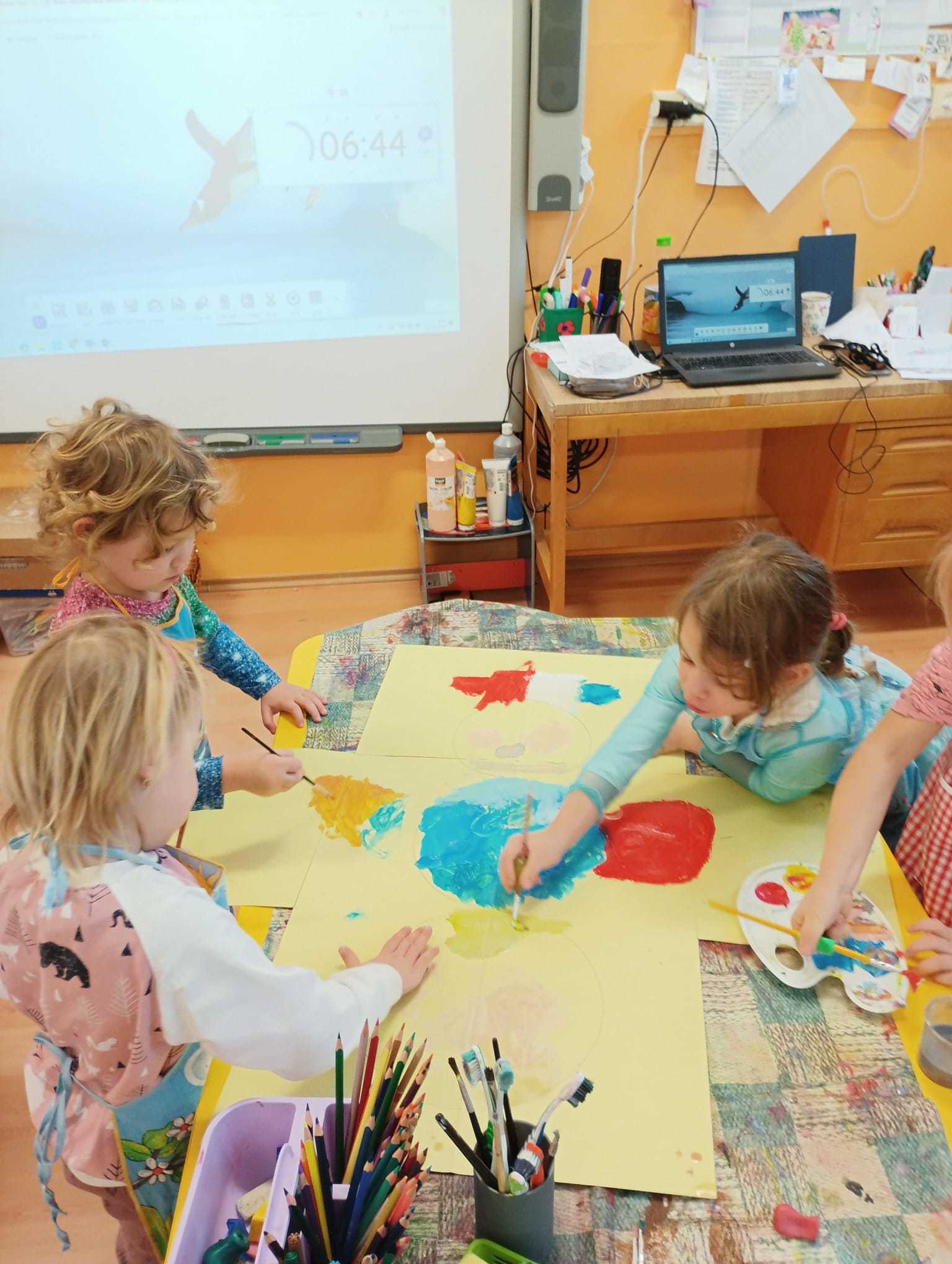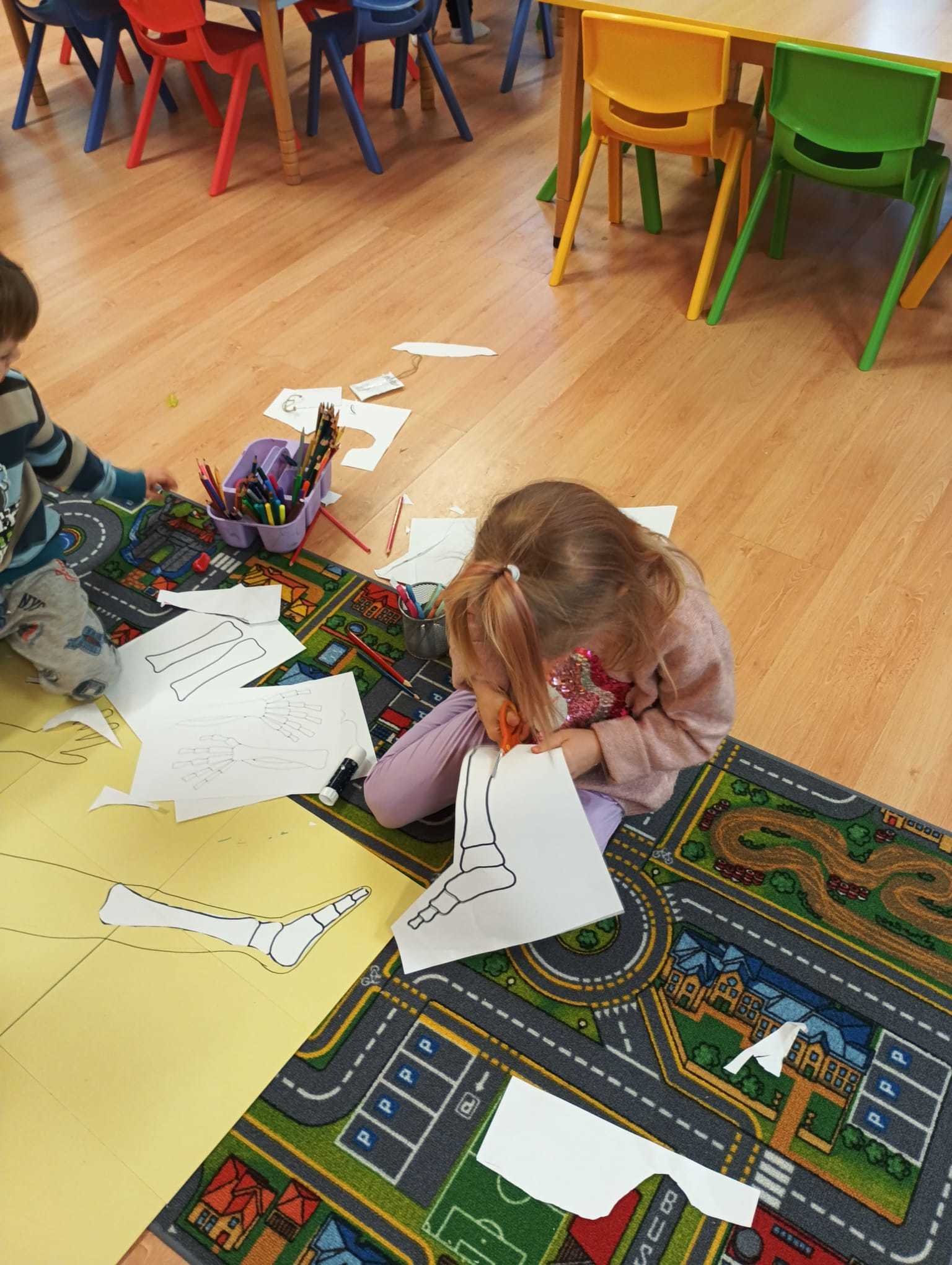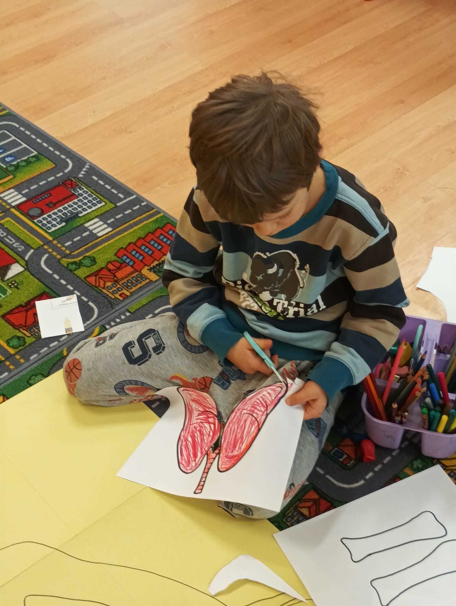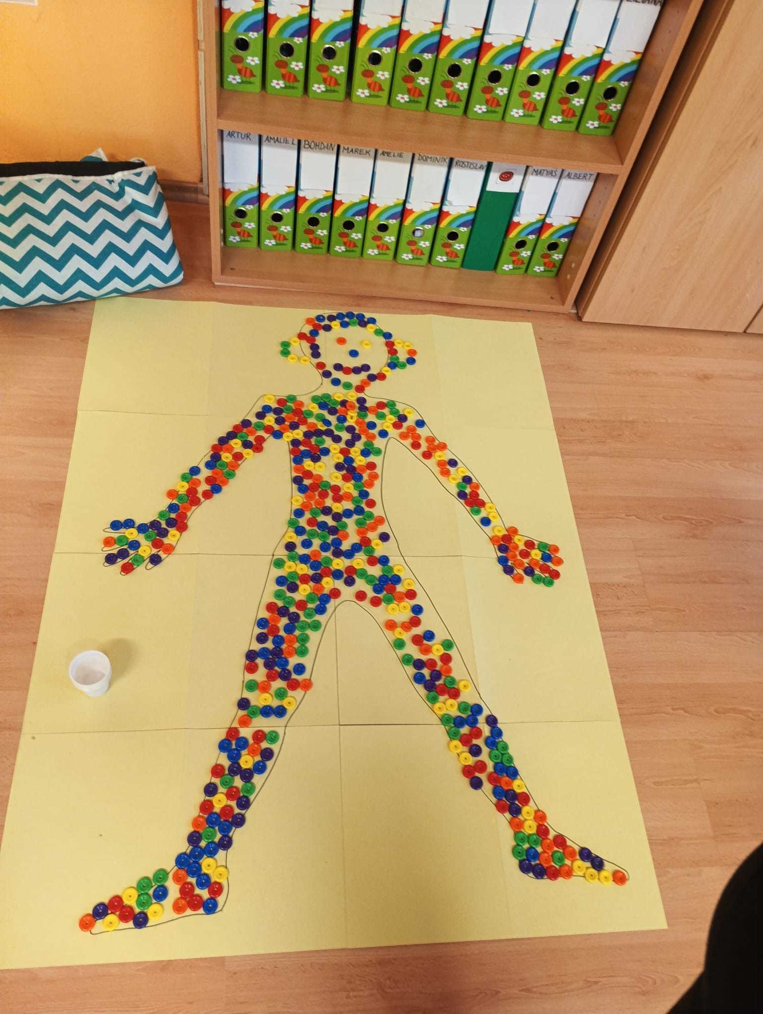 Další týdny patřili tématu „Naše tělo“. Začali jsme u emocí a smyslů, povídali jsme si o tom, jak se cítíme a zapojili jsme všechny smysly. Uvařili jsme si horký štrůdl, ta vůně skořice a chuť jablek nám pomohla pochopit, jak funguje čich a chuť. V centrech pokusy a objevy a knihy a písmena jsme zkoumali encyklopedie a různé obrázky, už víme, k čemu máme kostru, jak pracují svaly a kde máme srdce nebo plíce. V centrech ateliér a manipulace jsme modelovali obličeje, skládali postavy z různých materiálů, a dokonce tvořili maketu lidského těla. Učili jsme se názvy částí těla i to, jak se o sebe starat, abychom byli zdraví. Vysvětlili jsme si, co jsou to bacily a jak se šíří, v ateliéru jsme si tyto „potvůrky“ namalovali, abychom se jich nebáli, ale věděli, jak je porazit – mýdlem, vitamíny a čerstvým vzduchem. Povídali jsme si také o úrazech a první pomoci, abychom věděli, jak se zachovat, když se kamarádovi něco stane.