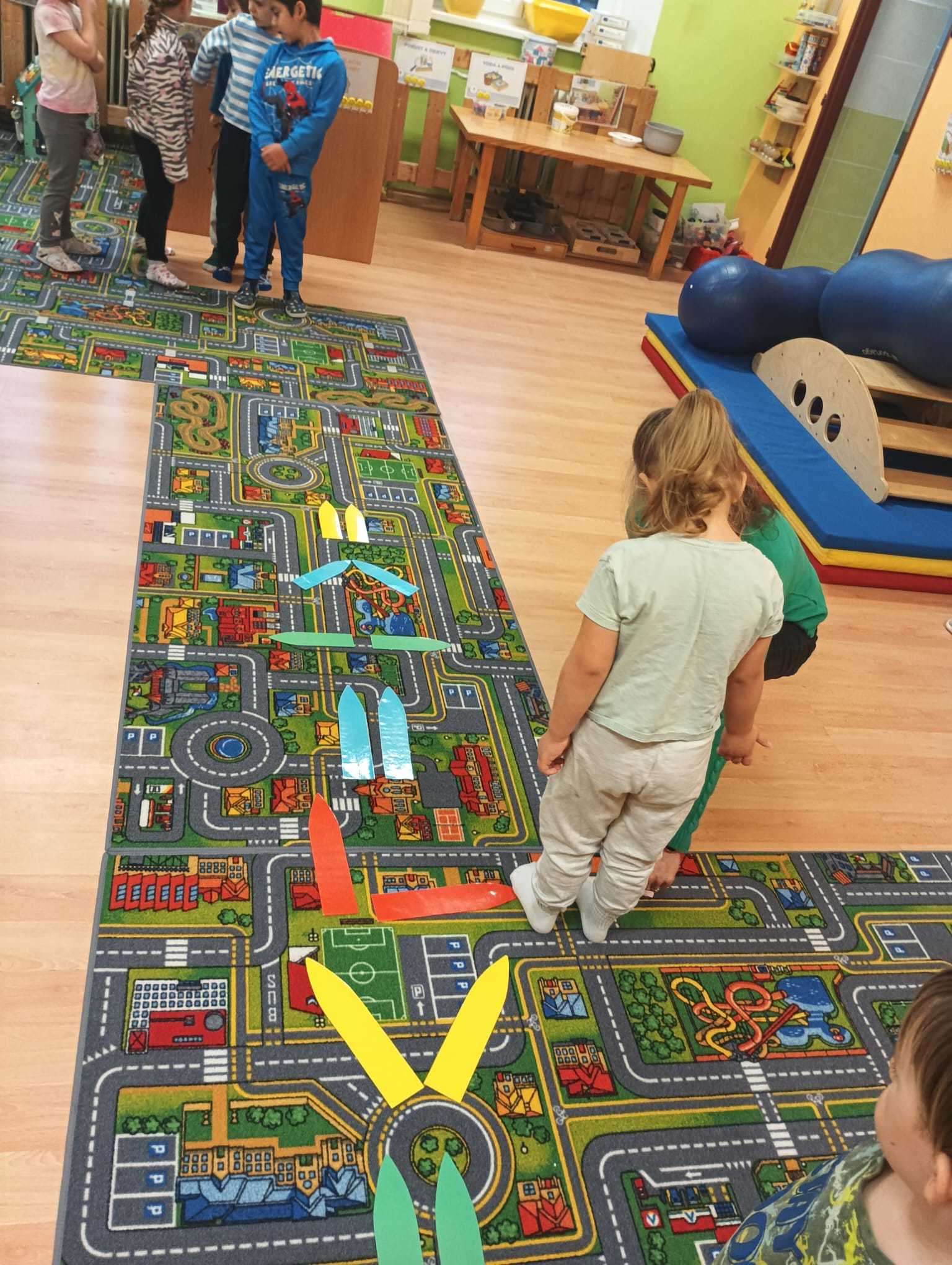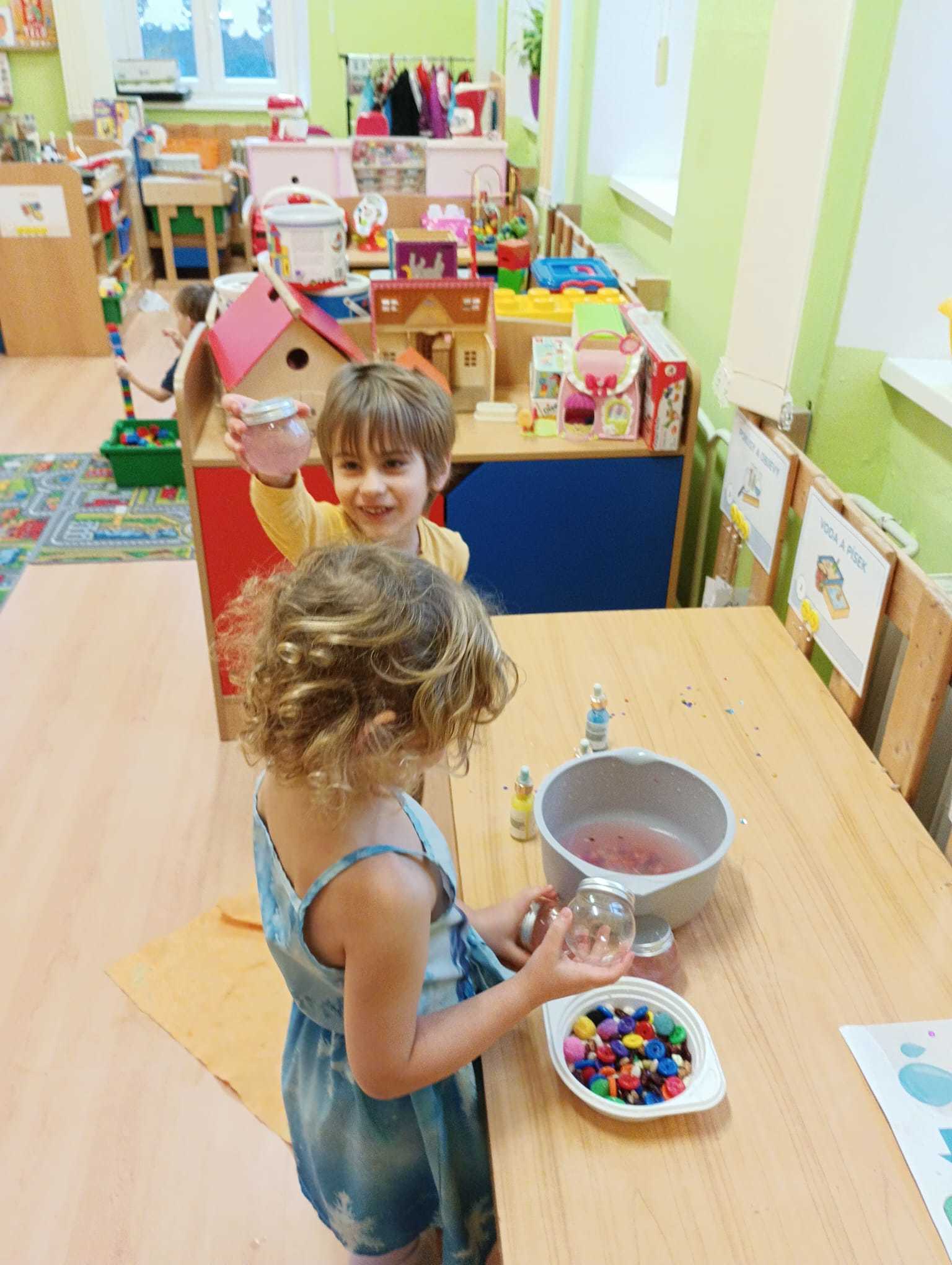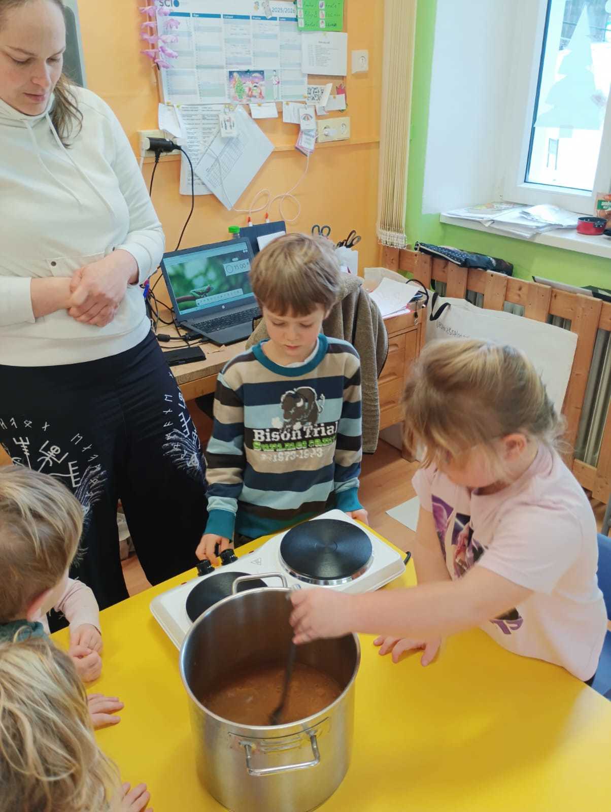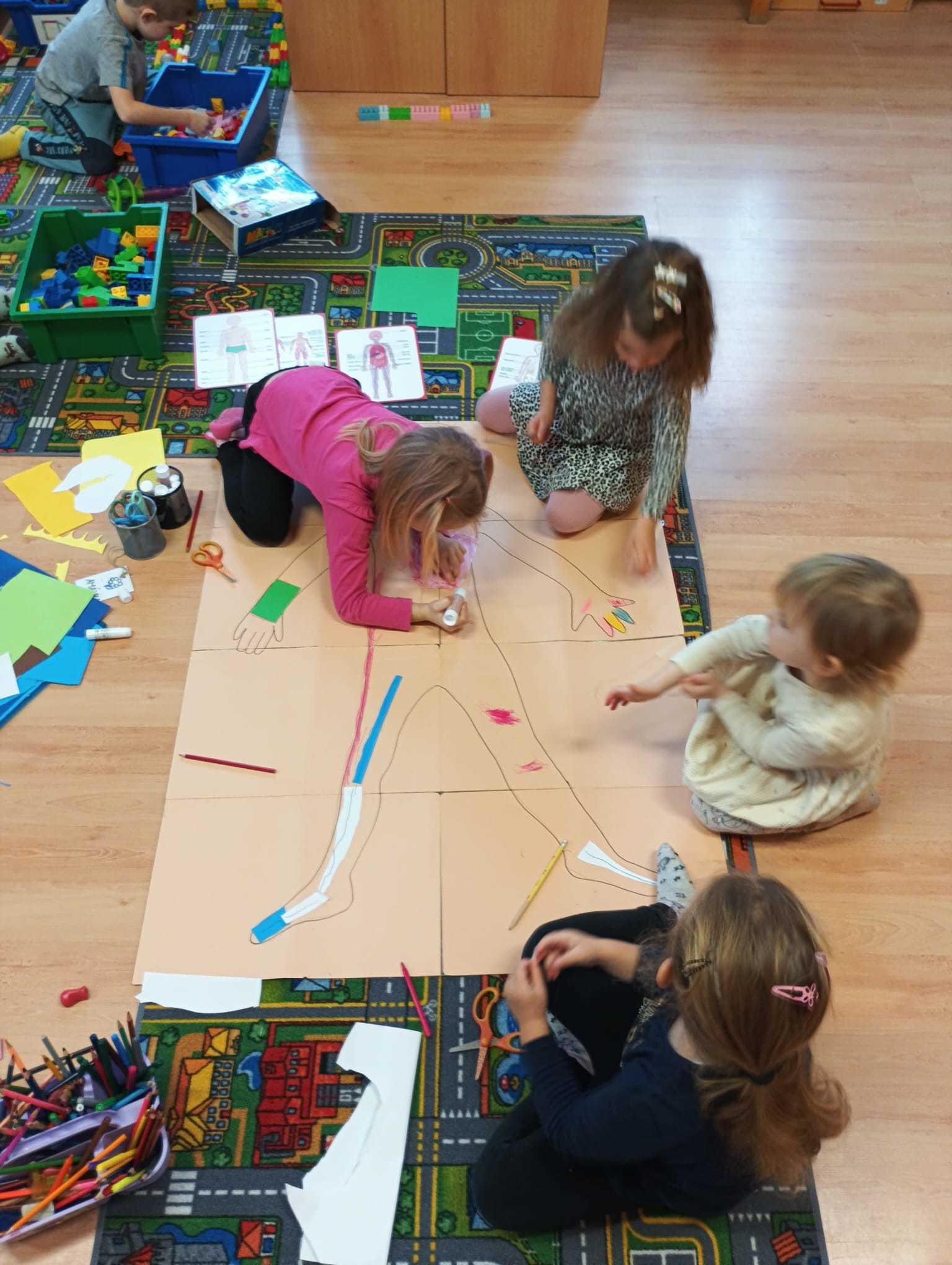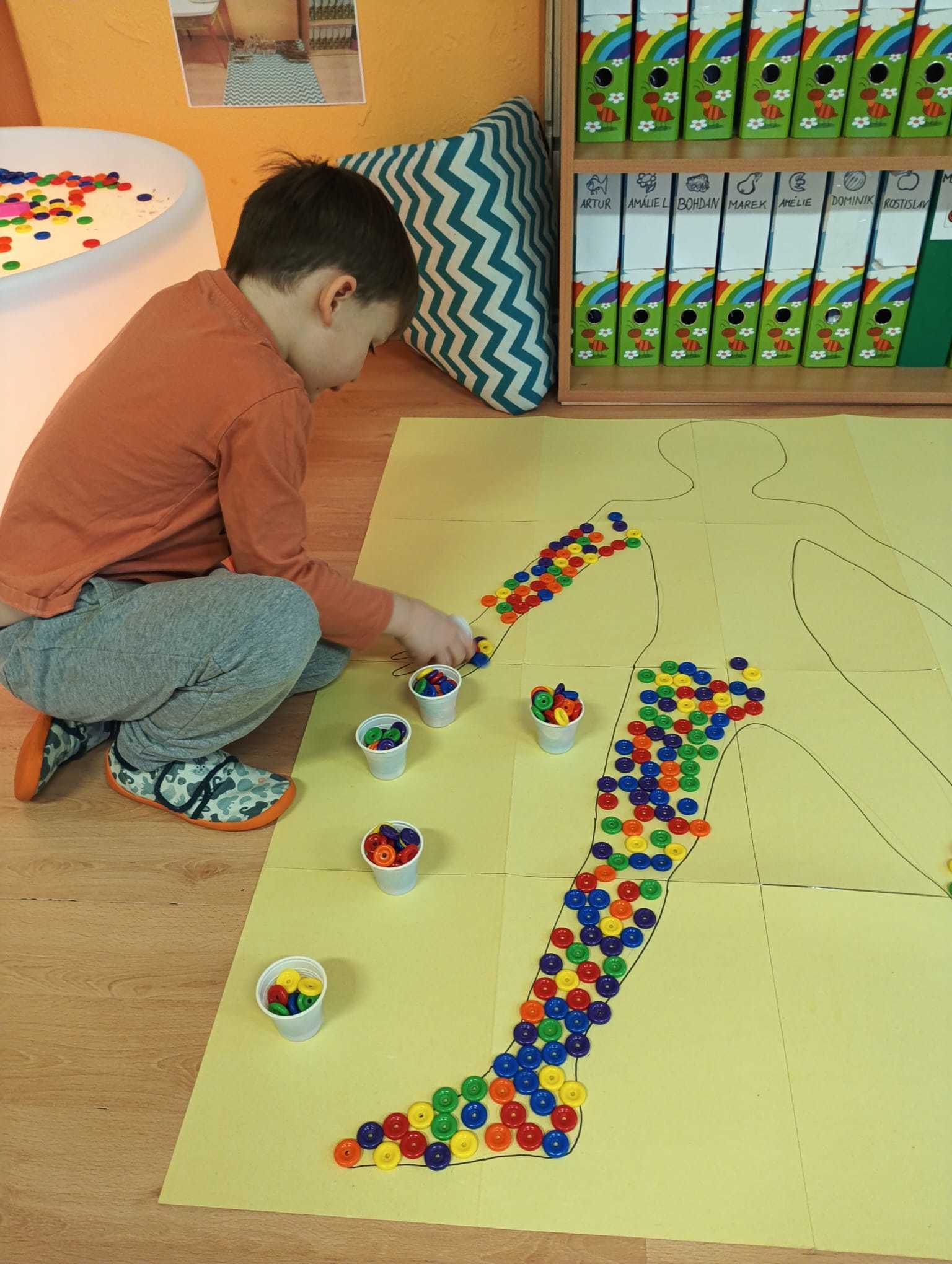 Další týdny patřili tématu „Naše tělo“. Začali jsme u emocí a smyslů, povídali jsme si o tom, jak se cítíme a zapojili jsme všechny smysly. Uvařili jsme si horký štrůdl, ta vůně skořice a chuť jablek nám pomohla pochopit, jak funguje čich a chuť. V centrech pokusy a objevy a knihy a písmena jsme zkoumali encyklopedie a různé obrázky, už víme, k čemu máme kostru, jak pracují svaly a kde máme srdce nebo plíce. V centrech ateliér a manipulace jsme modelovali obličeje, skládali postavy z různých materiálů, a dokonce tvořili maketu lidského těla. Učili jsme se názvy částí těla i to, jak se o sebe starat, abychom byli zdraví. Vysvětlili jsme si, co jsou to bacily a jak se šíří, v ateliéru jsme si tyto „potvůrky“ namalovali, abychom se jich nebáli, ale věděli, jak je porazit – mýdlem, vitamíny a čerstvým vzduchem. Povídali jsme si také o úrazech a první pomoci, abychom věděli, jak se zachovat, když se kamarádovi něco stane.