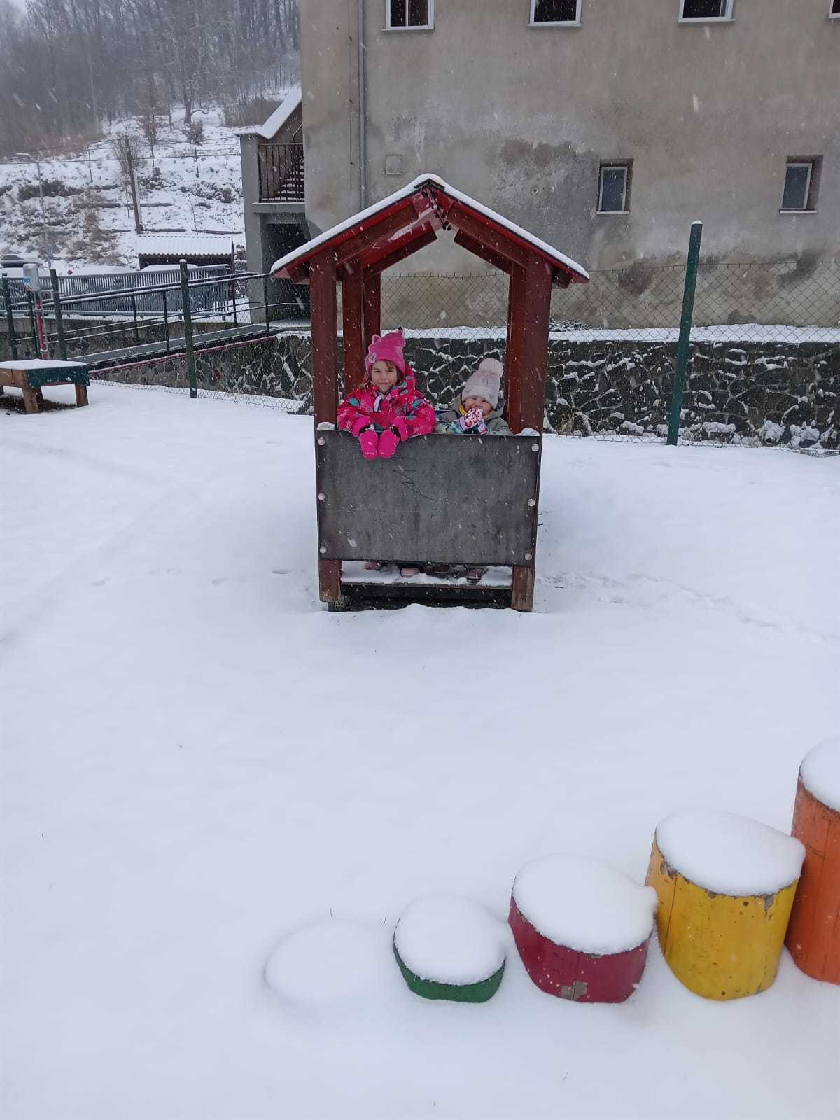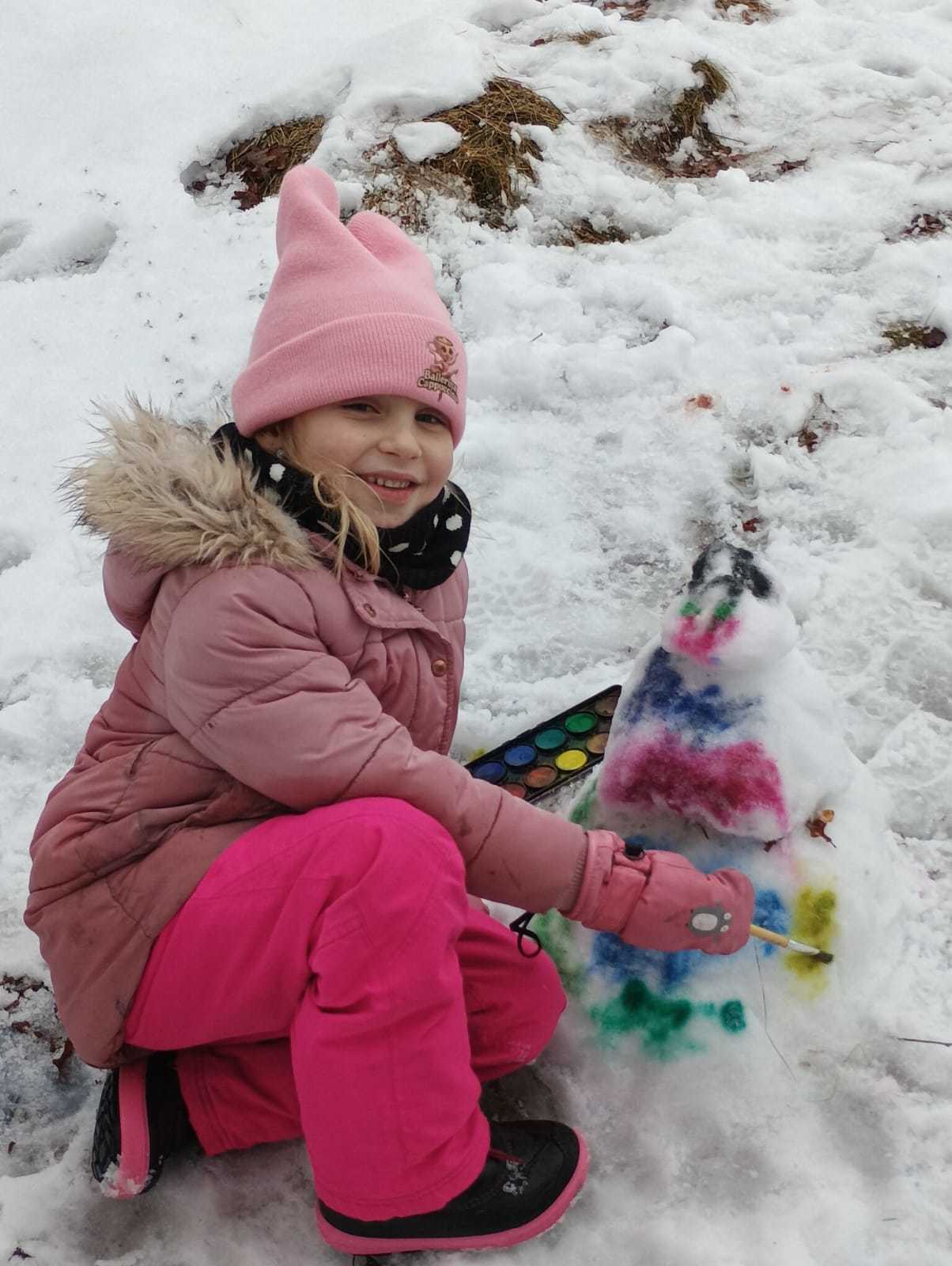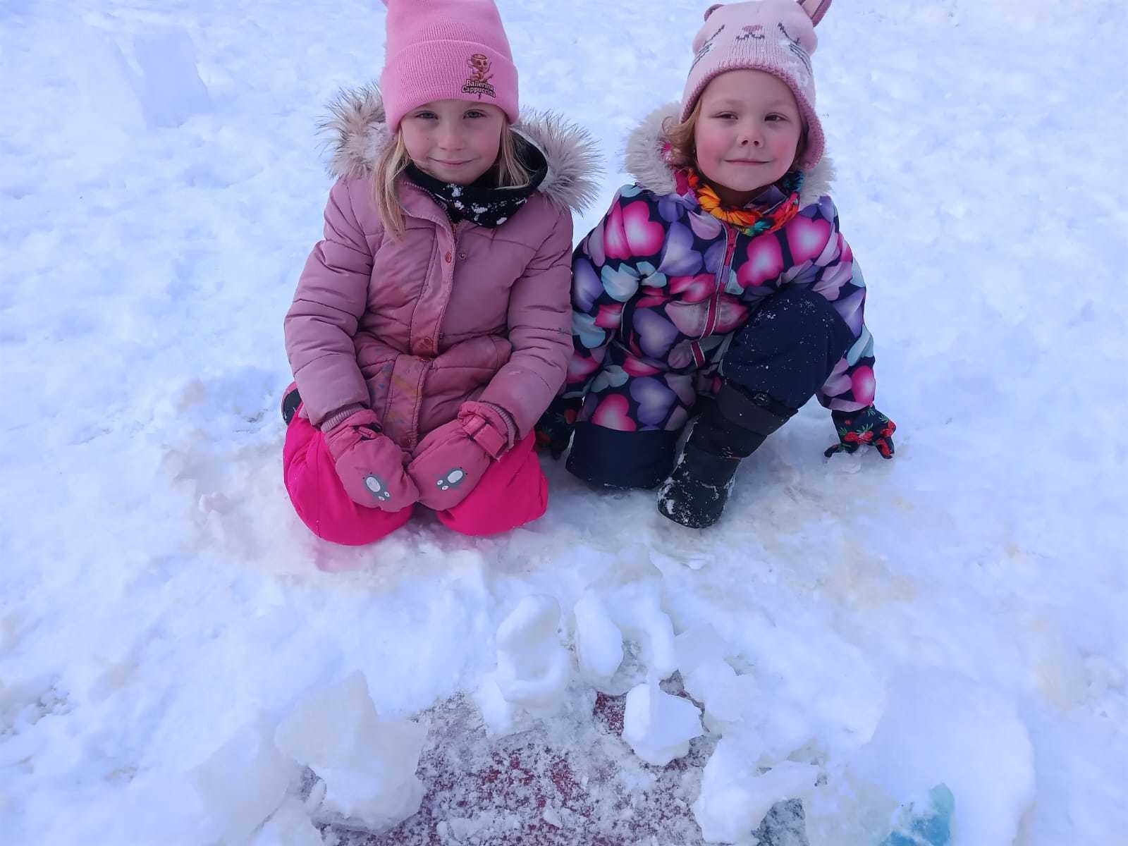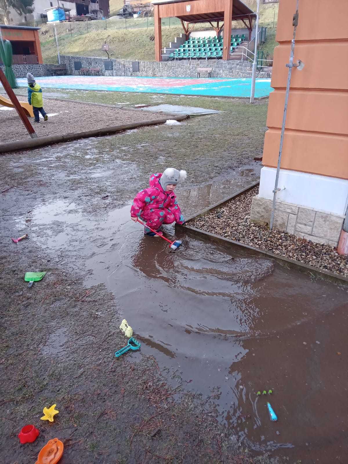 Poslední týden jsme sníh využili do poslední vločky! Každý den jsme trávili venku. Dokud sníh nebyl cvičili jsme s obručemi a míči, ale jakmile napadl, vytáhli jsme ježdíky. Pomáhali jsme odklízet sníh z cesty a ze zmrzlých kusů ledu a sněhu jsme na zahradě postavili celou „Eskymáckou vesnici“. Sníh pro nás byl i příležitost k pokusům. Barvili jsme ho vodovkami a sledovali, jak se barva vpíjí. Zkoumali jsme, kolik vody zbude ve sklenicích, když sníh roztaje. Když venku opravdu mrzlo, pomocí barvy, vody a balónků jsme si vytvořili barevná, ledová vejce. Naopak, když sníh začal tát vzniklo nám na zahradě velké „moře“. Měřili jsme jeho hloubku, délku i šířku a zkoušeli jsme, které předměty plavou a které jdou ke dnu. Samozřejmě nesmělo chybět klasické stavění sněhuláků a koulovačky.