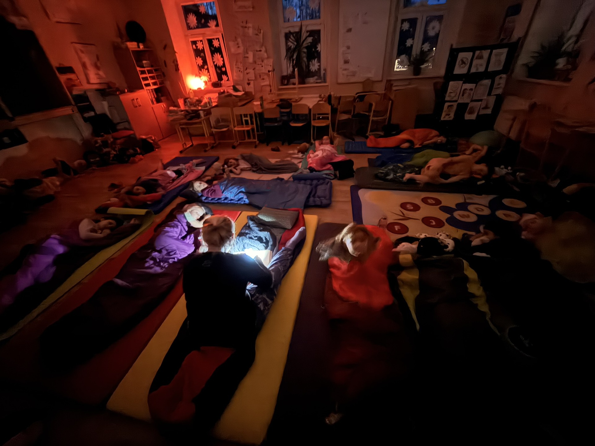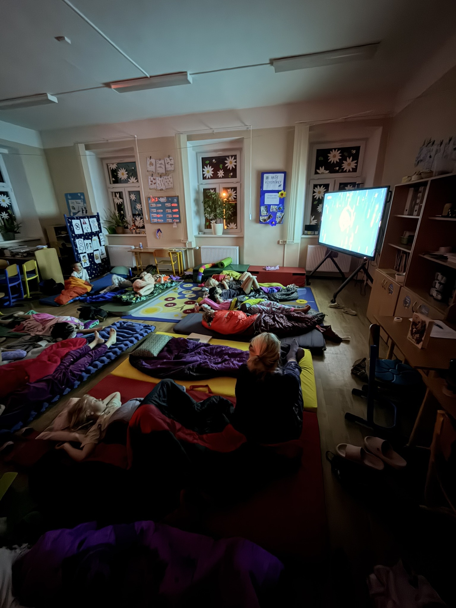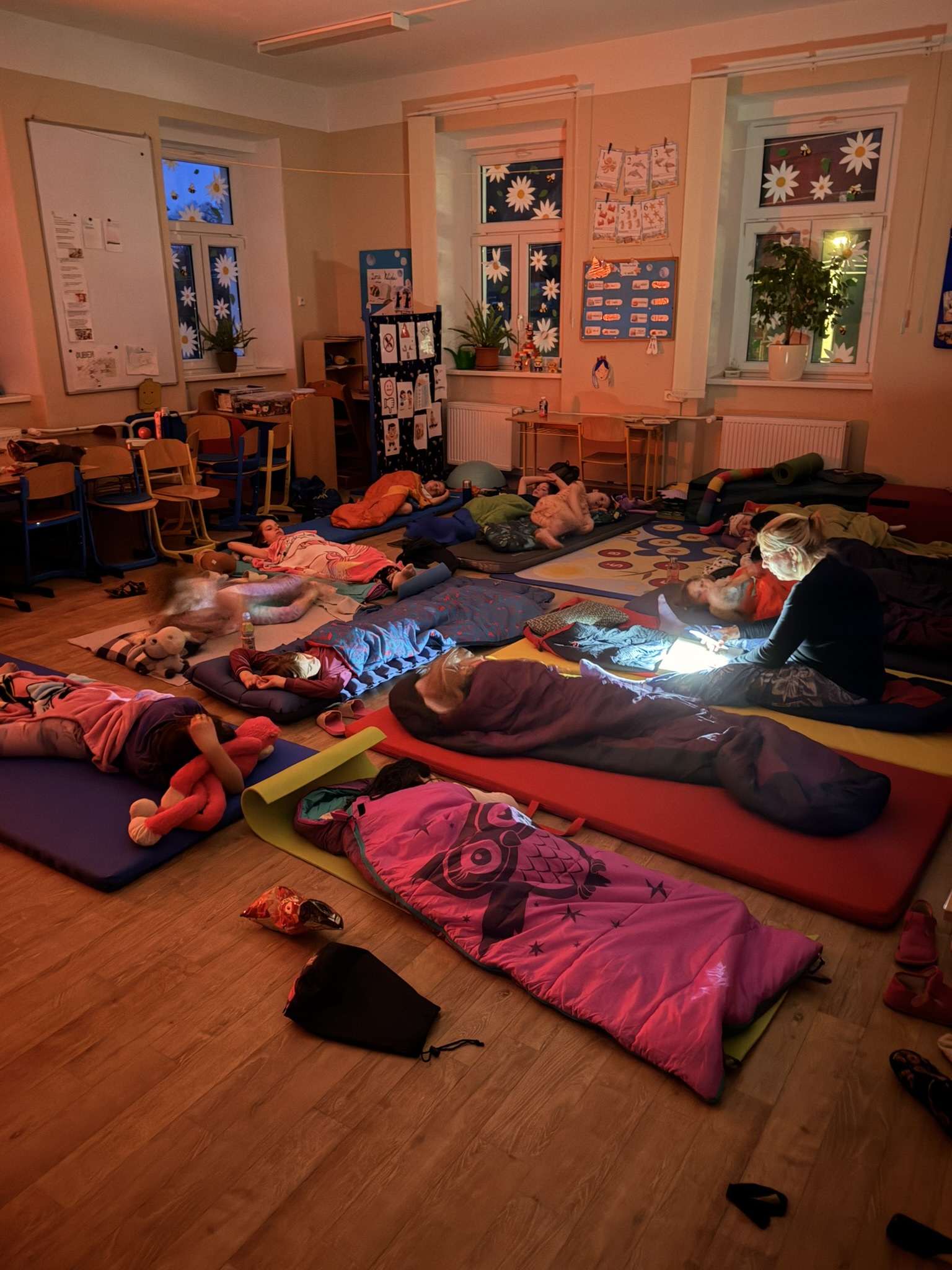 Po večerní hygieně jsme se všichni uvelebili do spacáků. Paní ředitelka dětem před spaním přečetla pohádku Cínový vojáček a navodila tak tu pravou pohádkovou atmosféru. Protože se nám ještě nechtělo spát, pustili jsme si také Děvčátko se sirkami a Císařovy nové šaty.