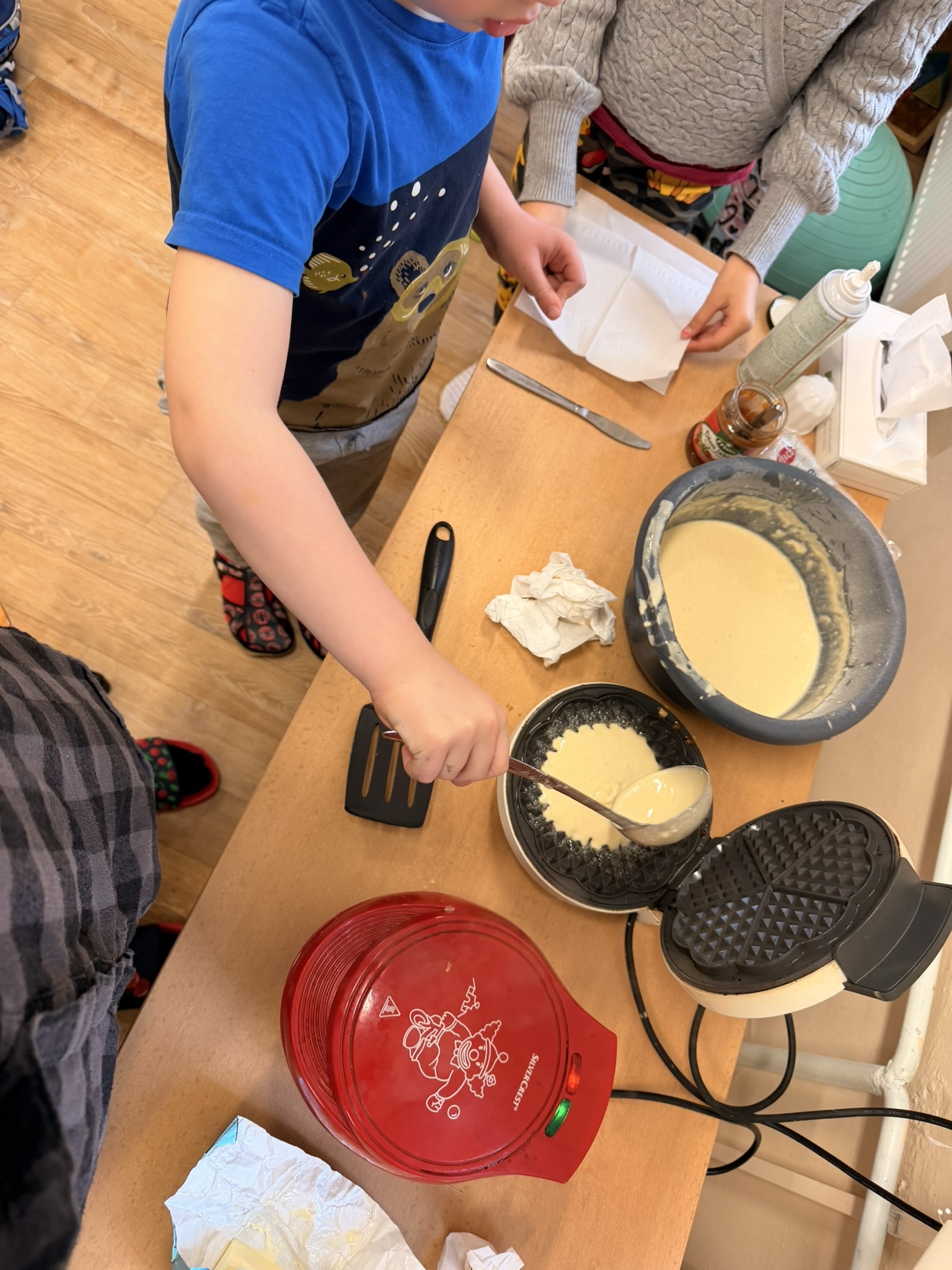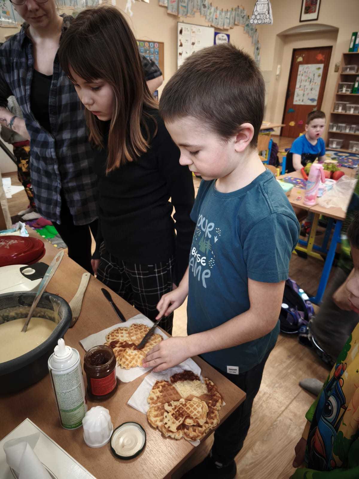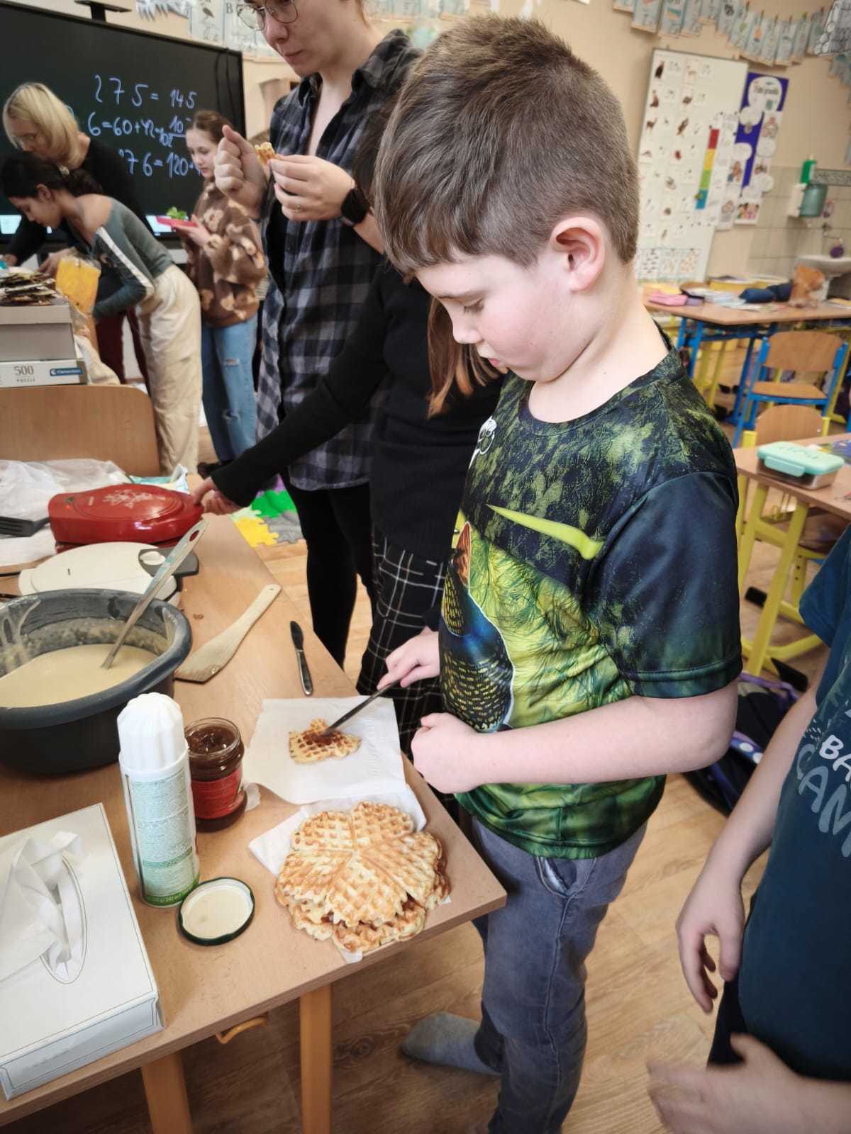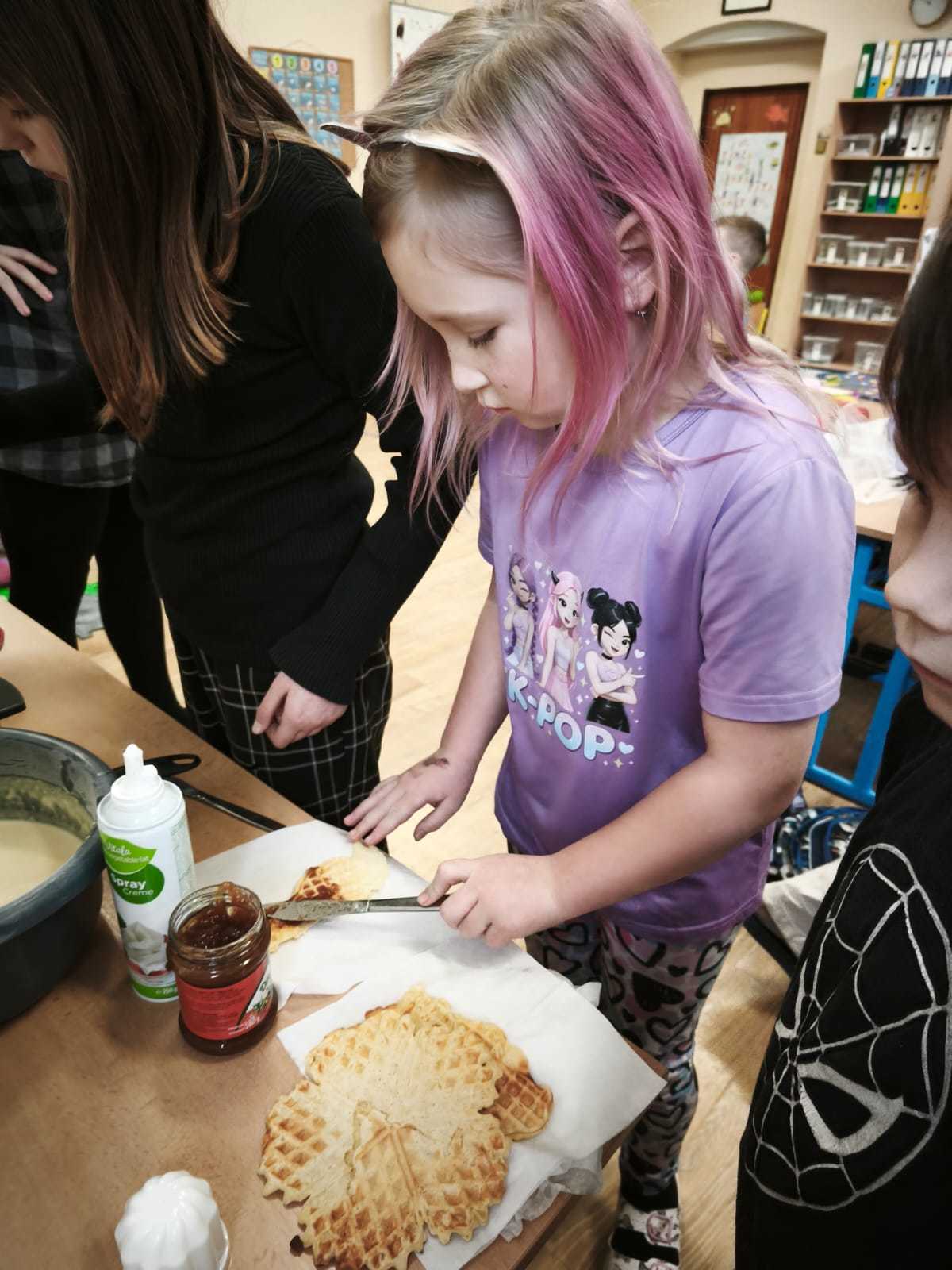 Celý týden jsme zakončili společnou tečkou – svačinou, kterou si žáci sami připravili. Ve třídě to vonělo po čerstvých waflích s marmeládou a křupavých toustech. Děti si rozdělily úkoly, spolupracovaly a s chutí si pak vychutnaly výsledek své práce.