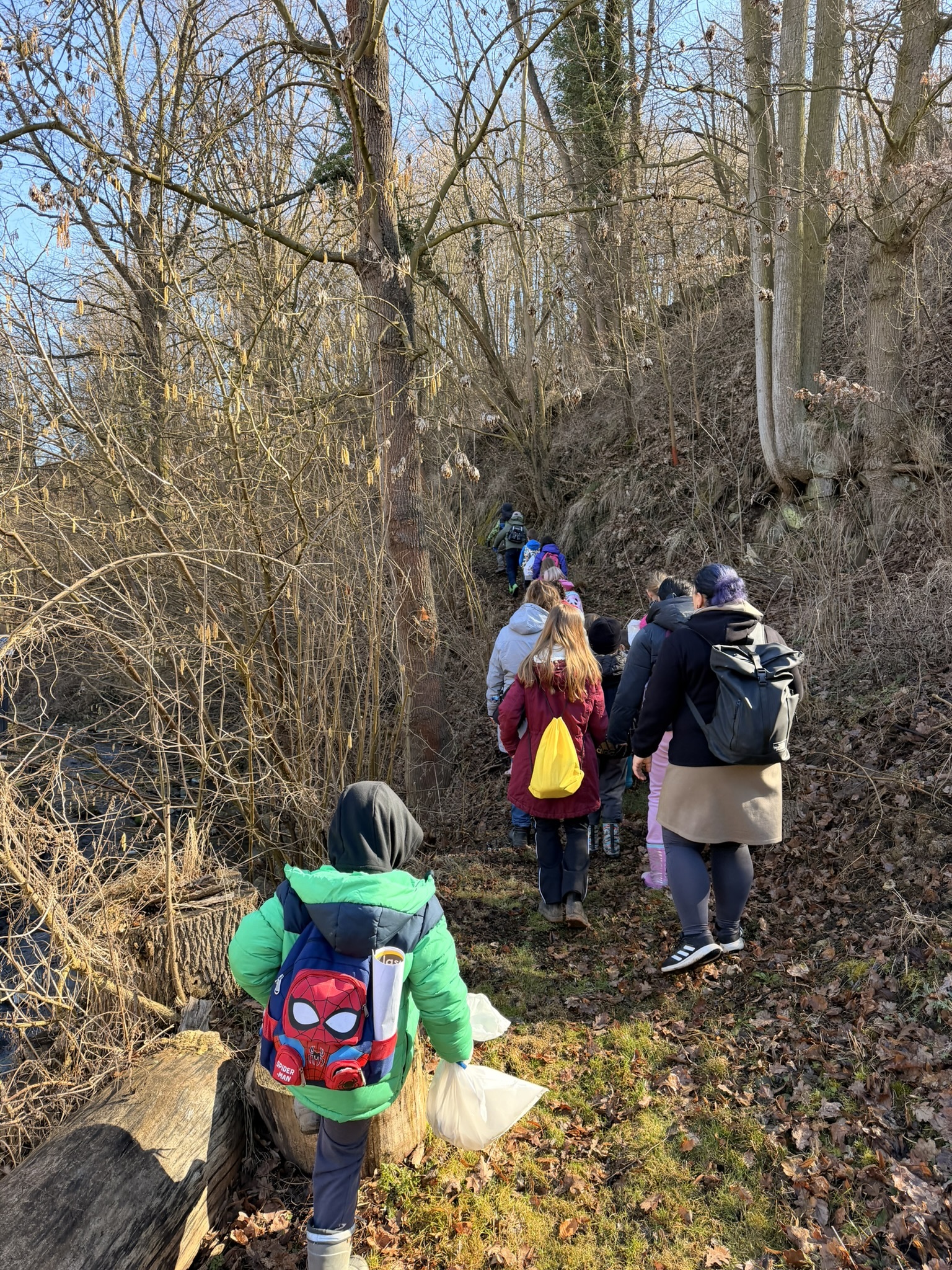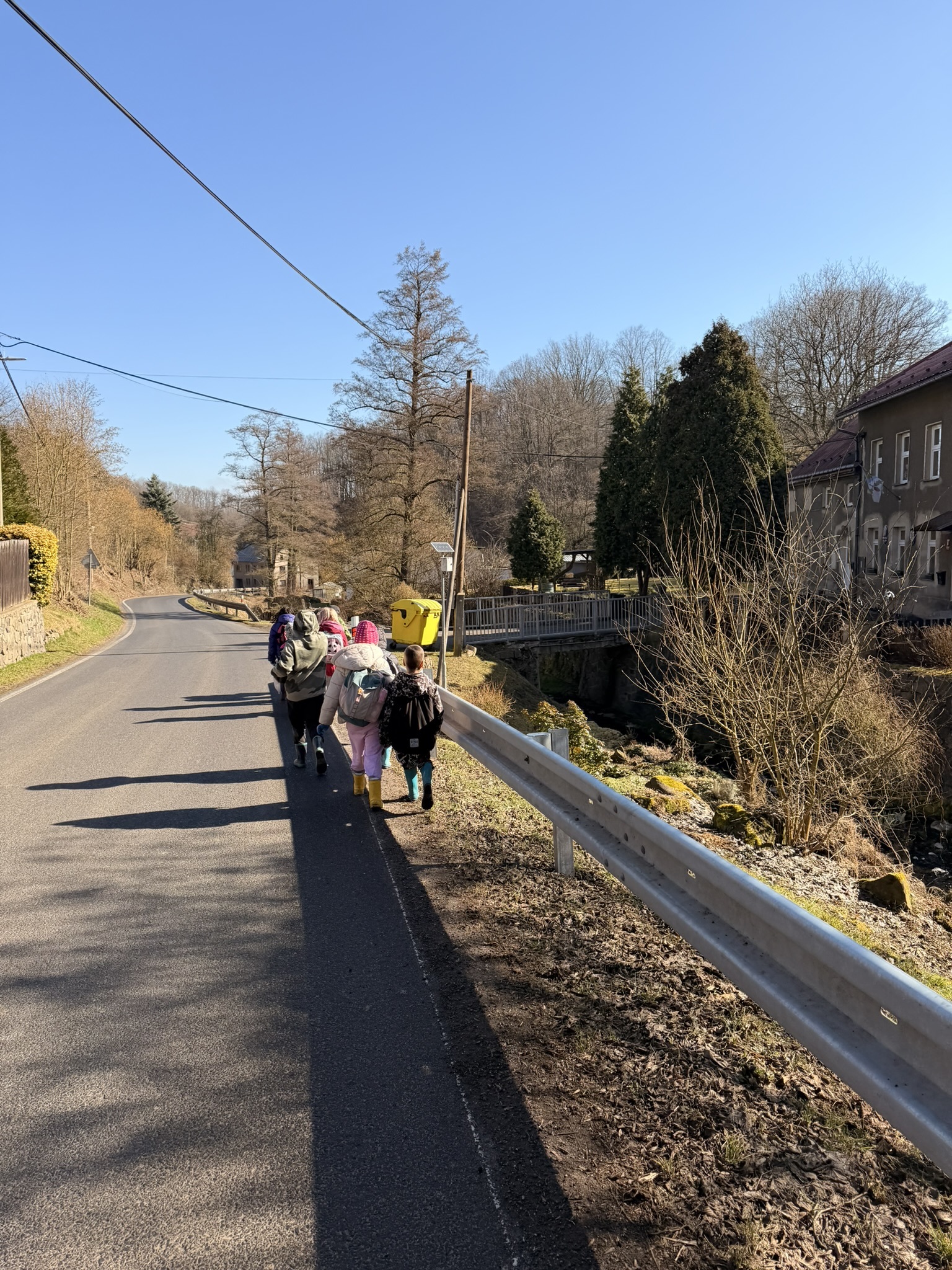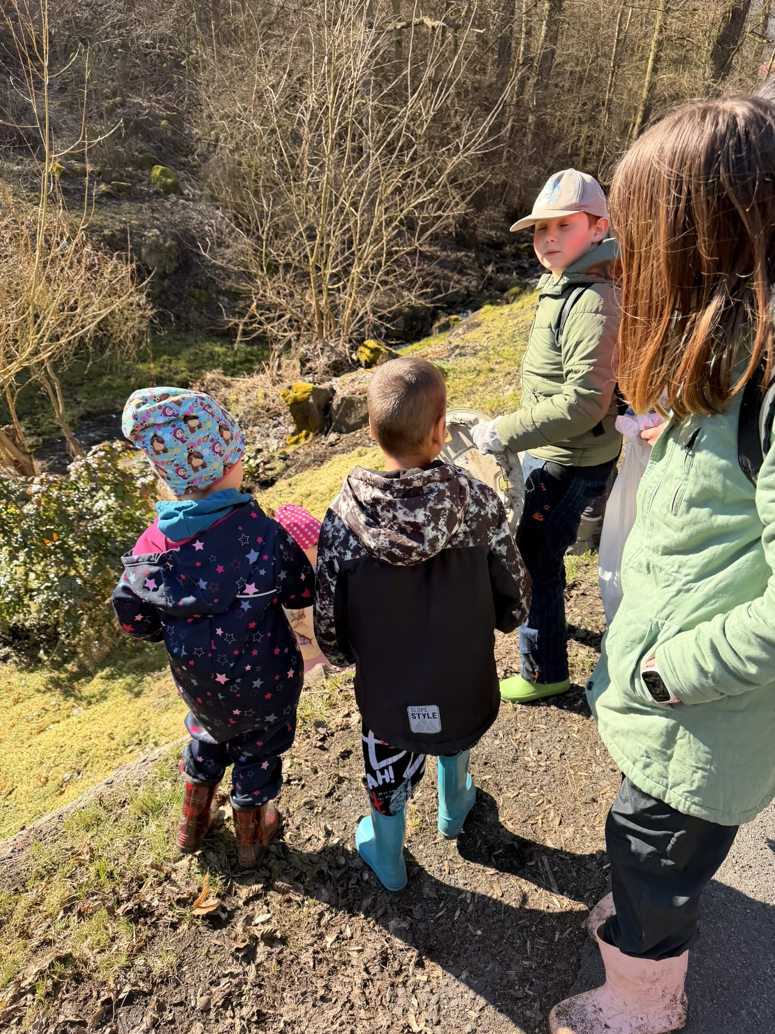 Nejprve jsme prošli část naší obce a vysbírali odpadky, které jsme po cestě našli. Poté jsme se vydali k potůčku v lese, kde máme své oblíbené místo. To jsme nejdříve důkladně uklidili a potom jsme pokračovali i proti proudu potoka, abychom zkontrolovali, zda se někde neskrývá další odpad.
