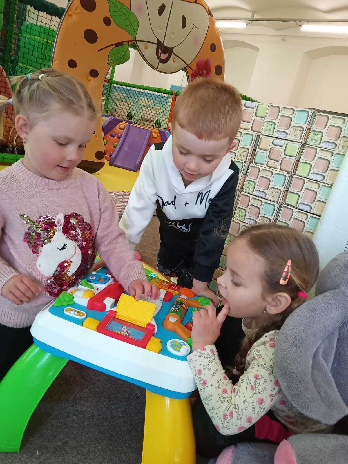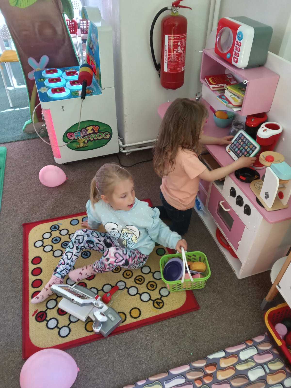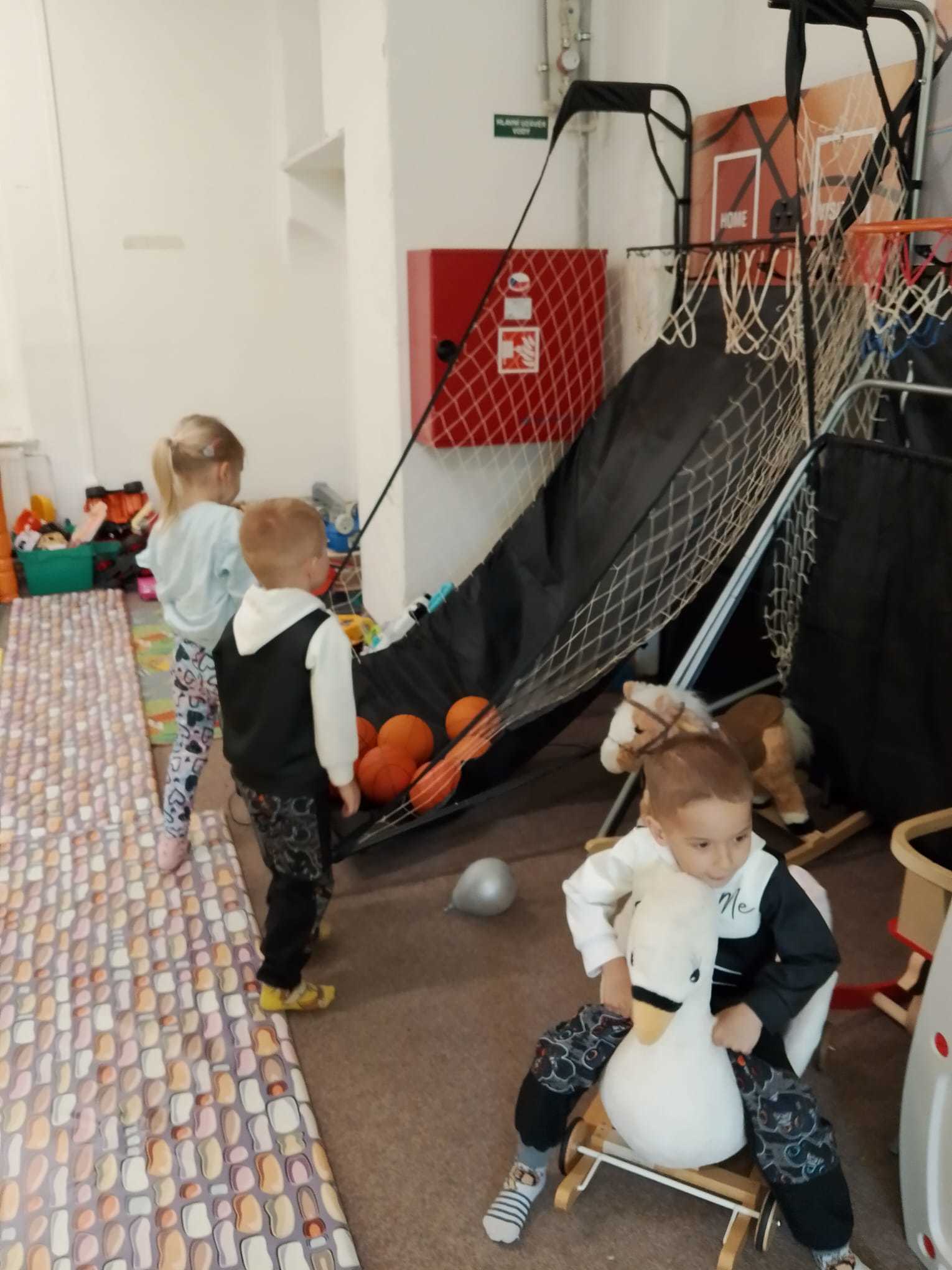 Děti využily čas v herně na maximum. Jezdily po dráze na odstrkovadlech, prolézaly všechny možné prolézačky a překážky, skákaly na trampolíně a velký úspěch měly také bazénky plné malých míčků. S nadšením si hrály s velkými kostkami, vařily v dětské kuchyňce a zkoušely svou přesnost při házení basketbalových míčů na koš. Každý si našel něco, co ho bavilo, a radost byla vidět na všech stranách.
