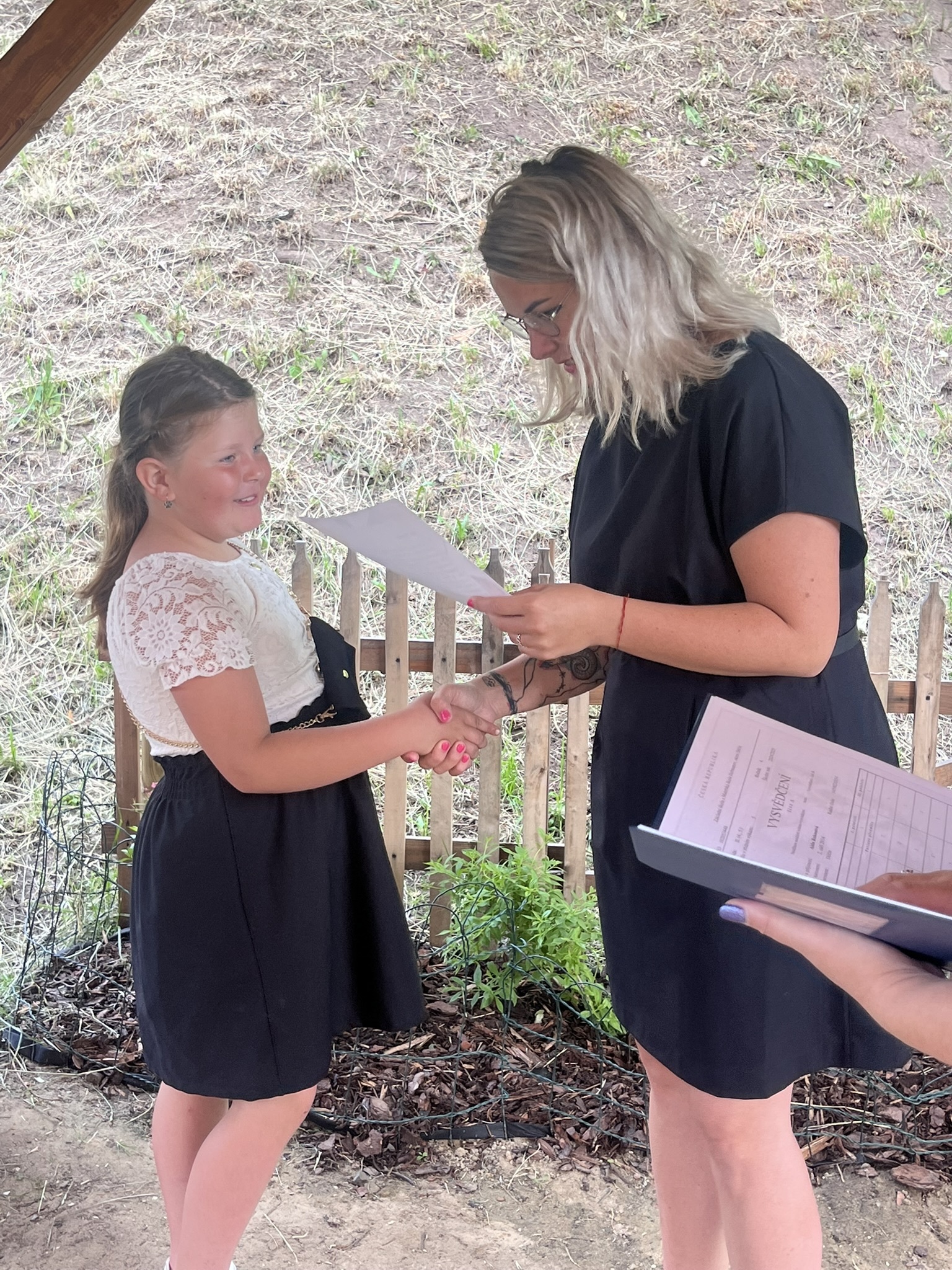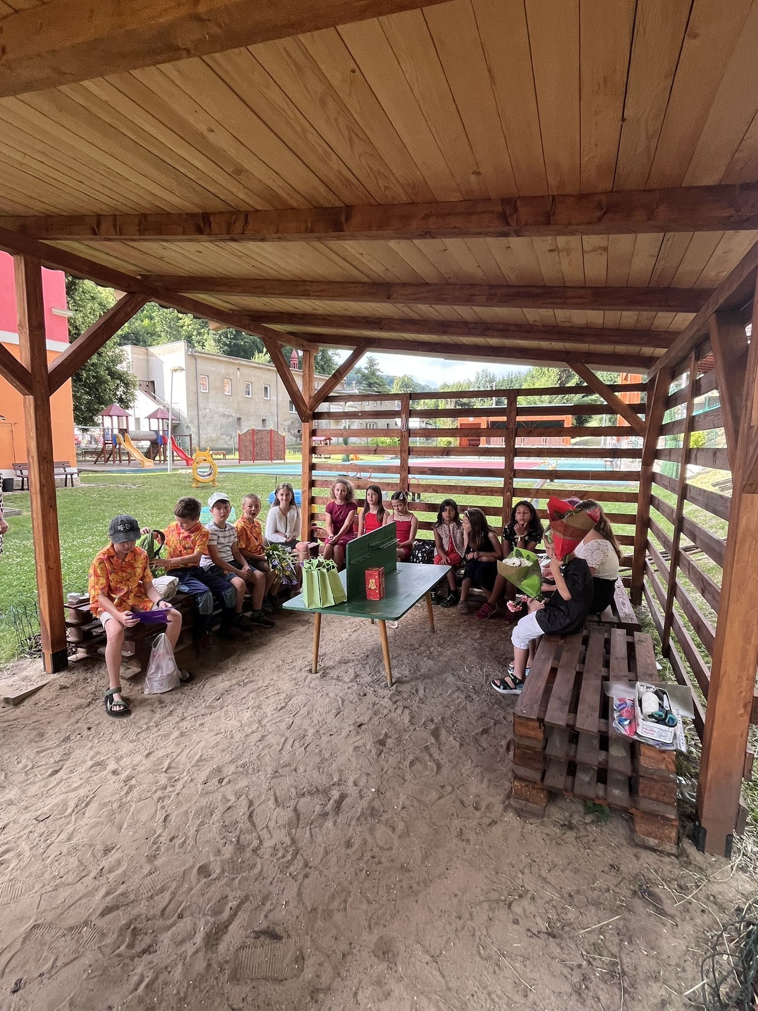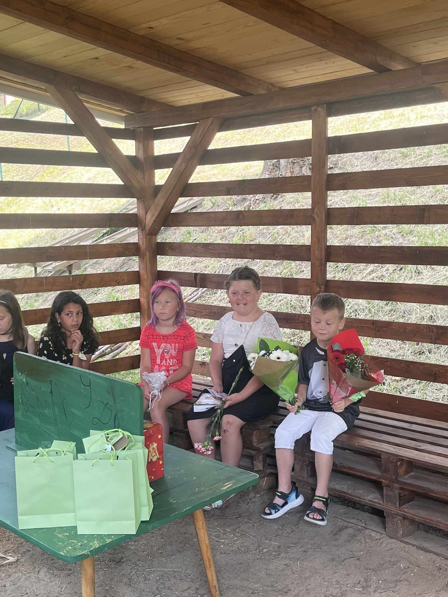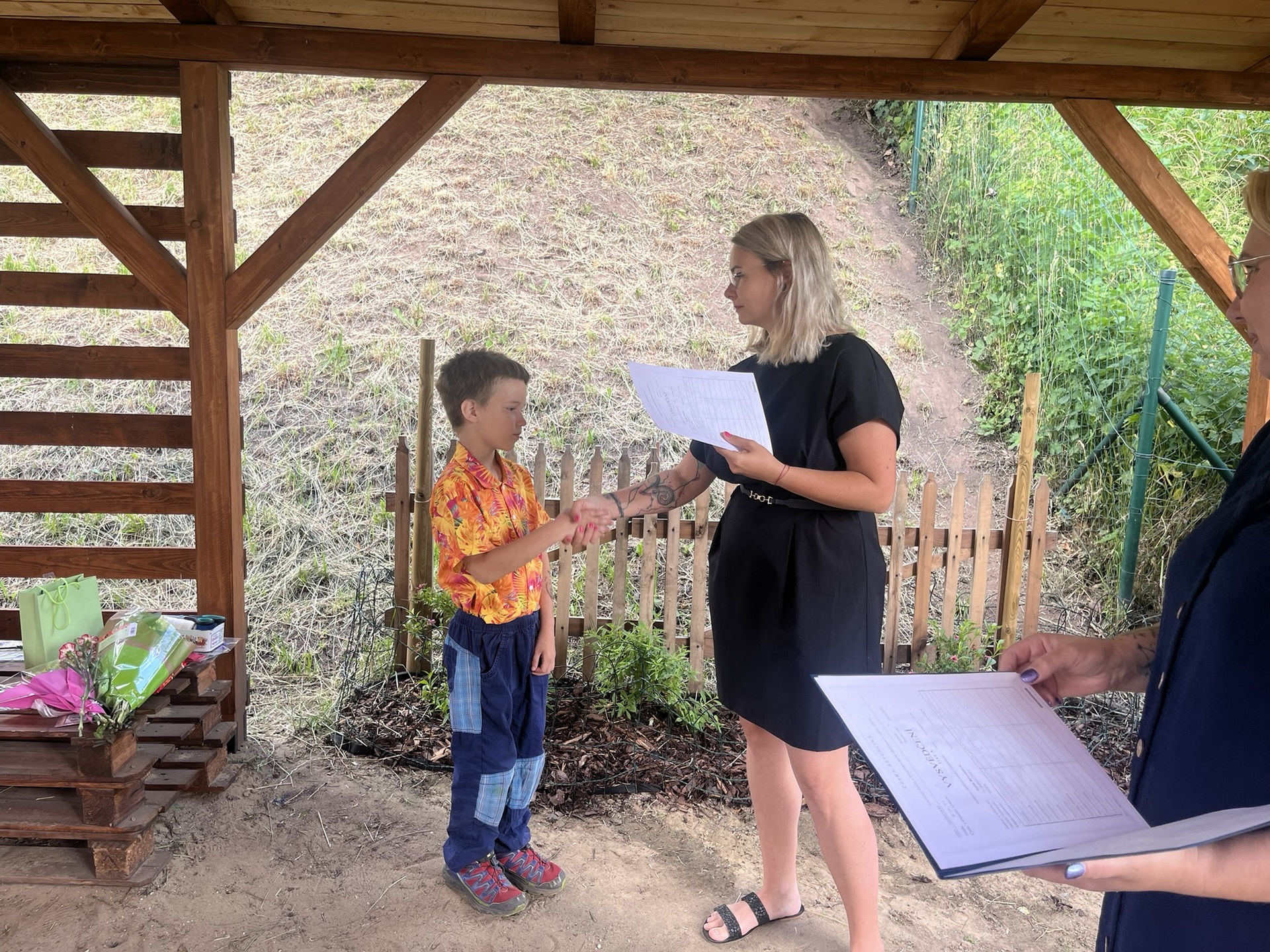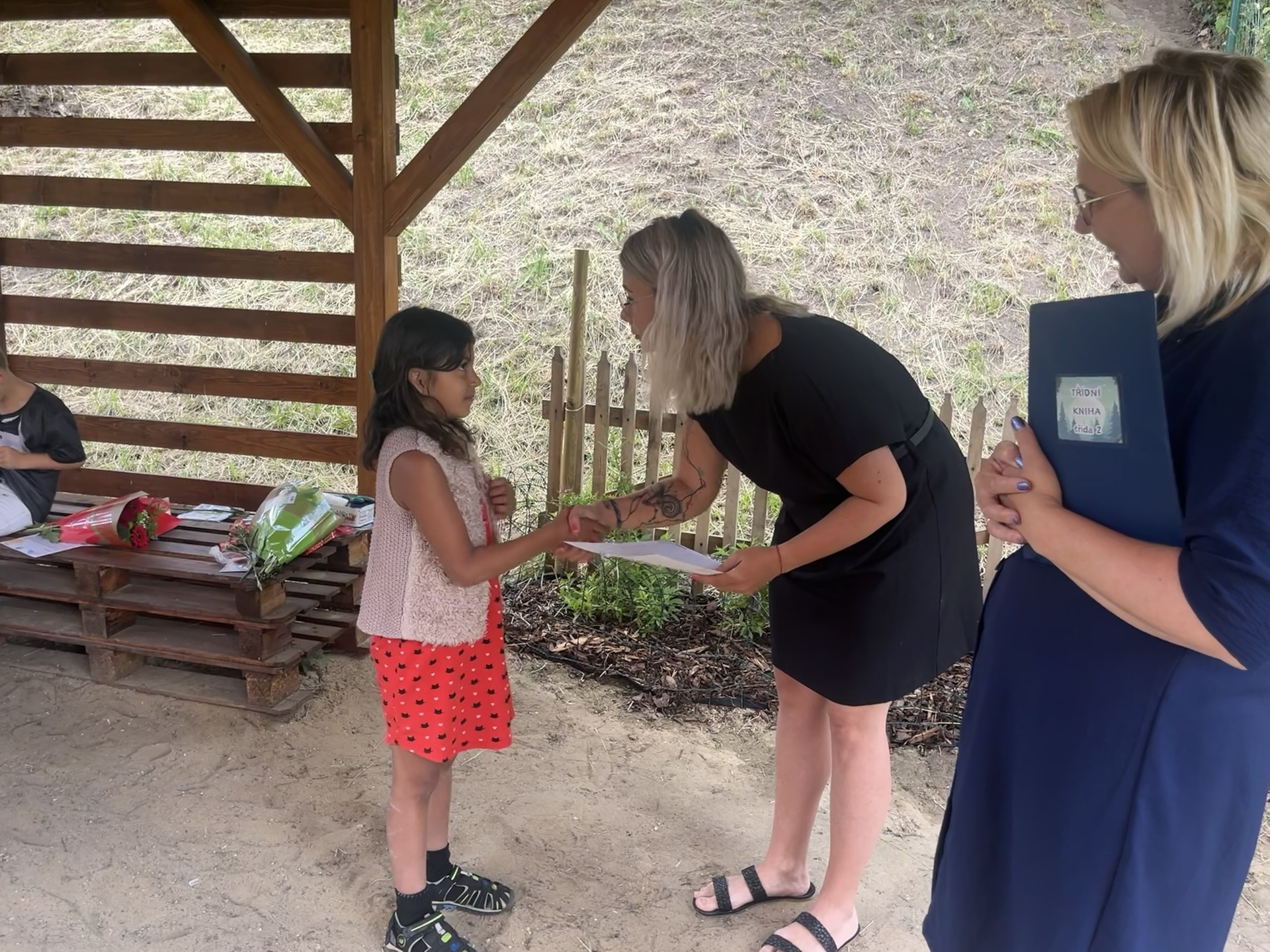 Vysvědčení jsme letos předali venku v naší venkovní učebně – slunce svítilo, děti se usmívaly a pan starosta přijel jako každý rok s čokoládou pro všechny.