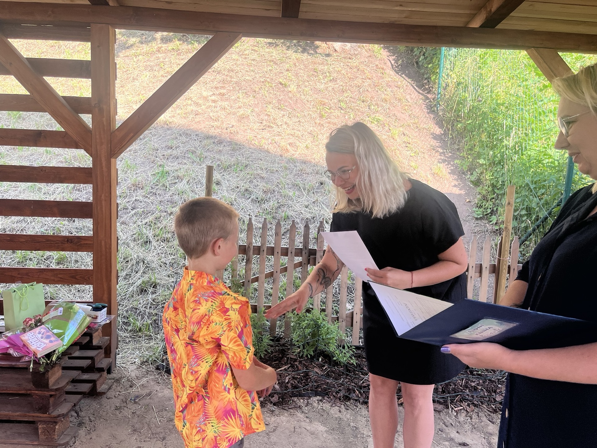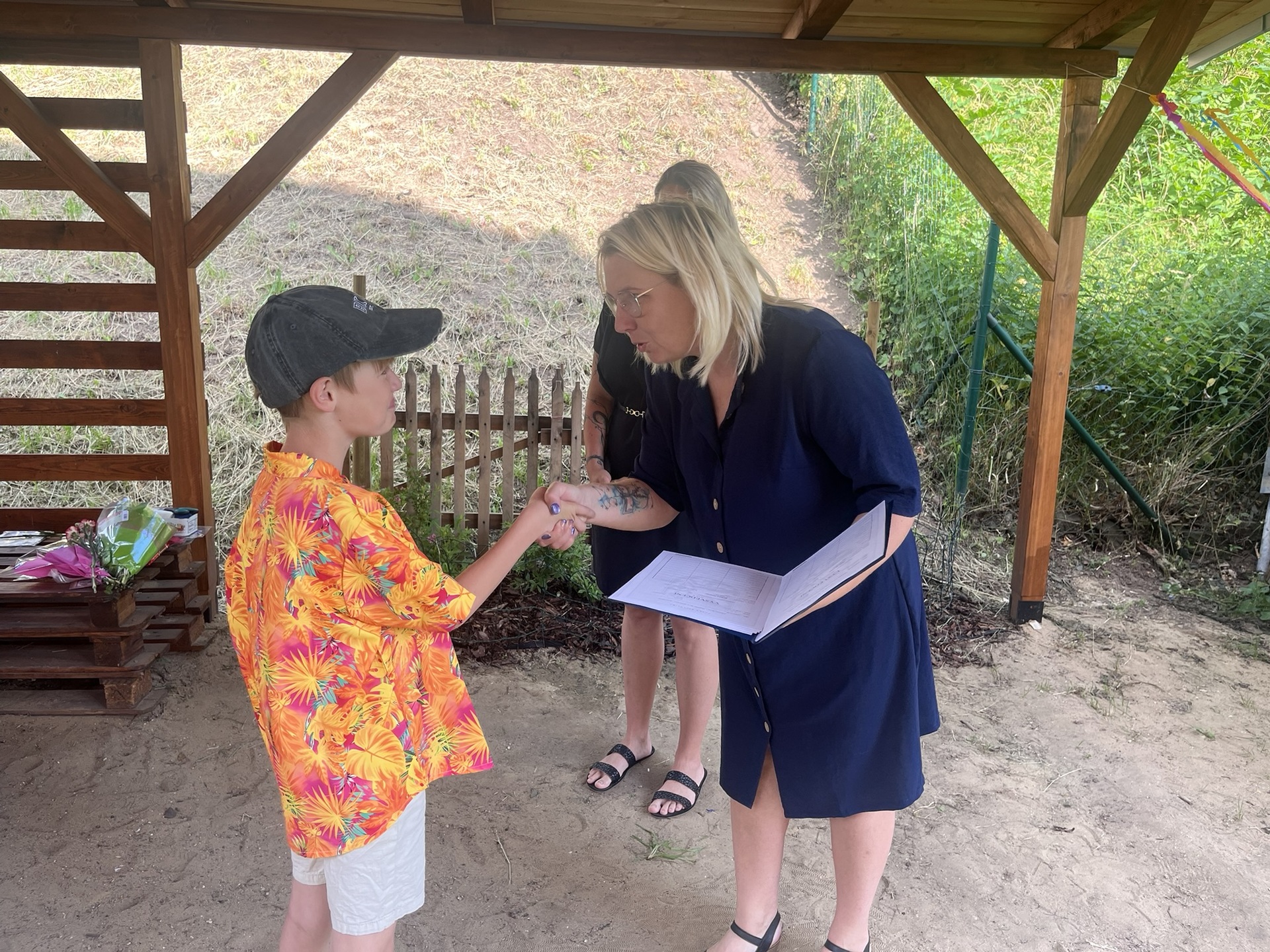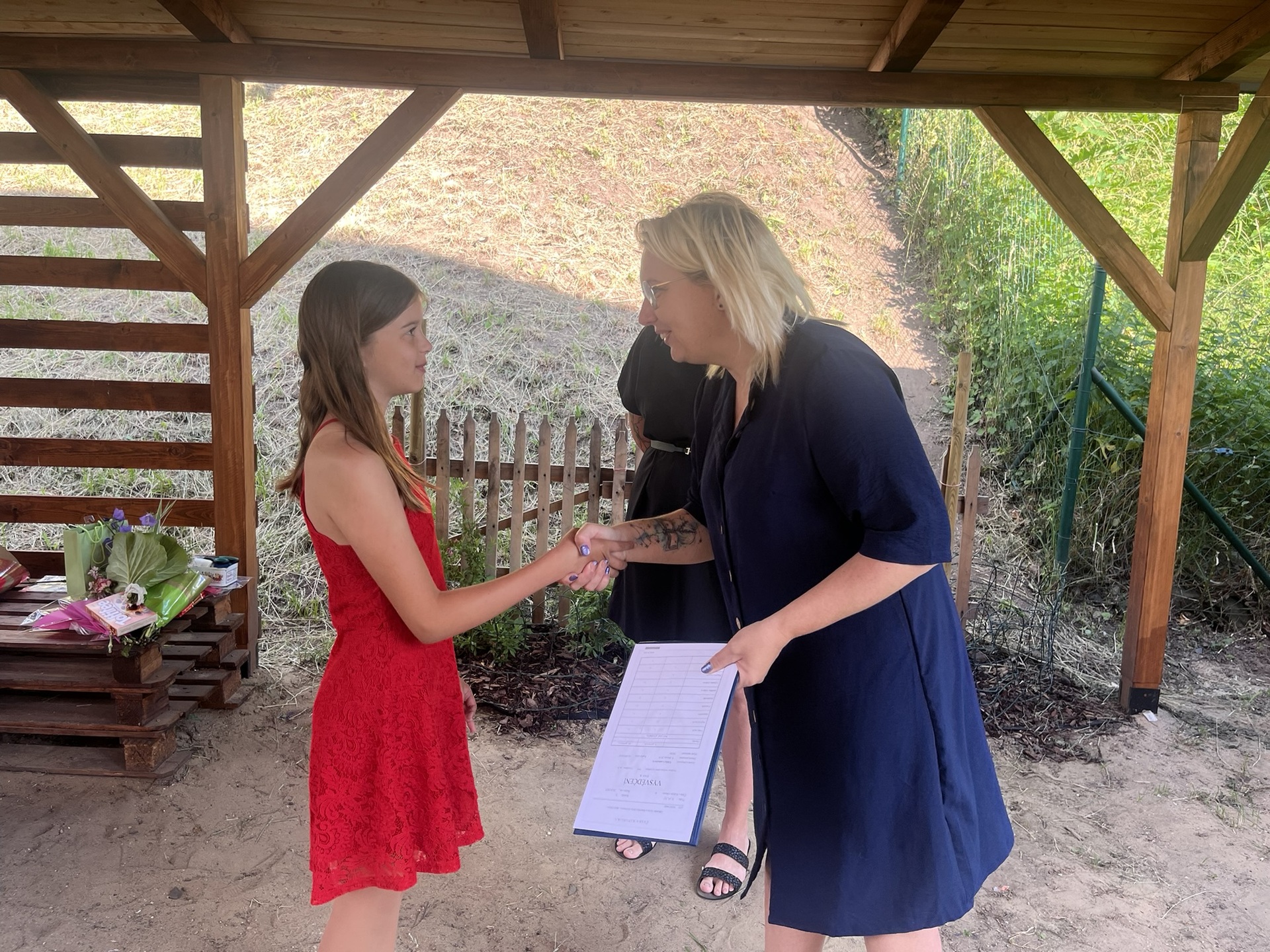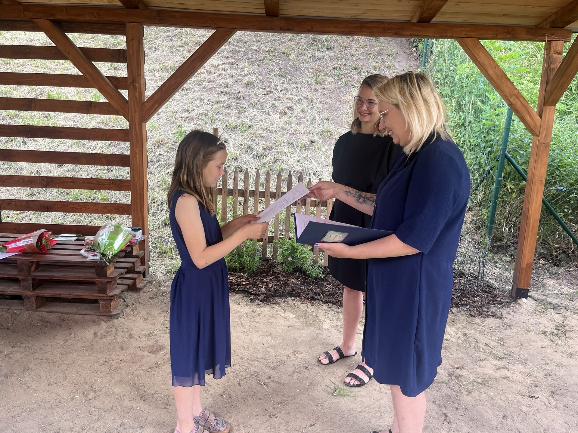 Vysvědčení jsme letos předali venku v naší venkovní učebně – slunce svítilo, děti se usmívaly a pan starosta přijel jako každý rok s čokoládou pro všechny.