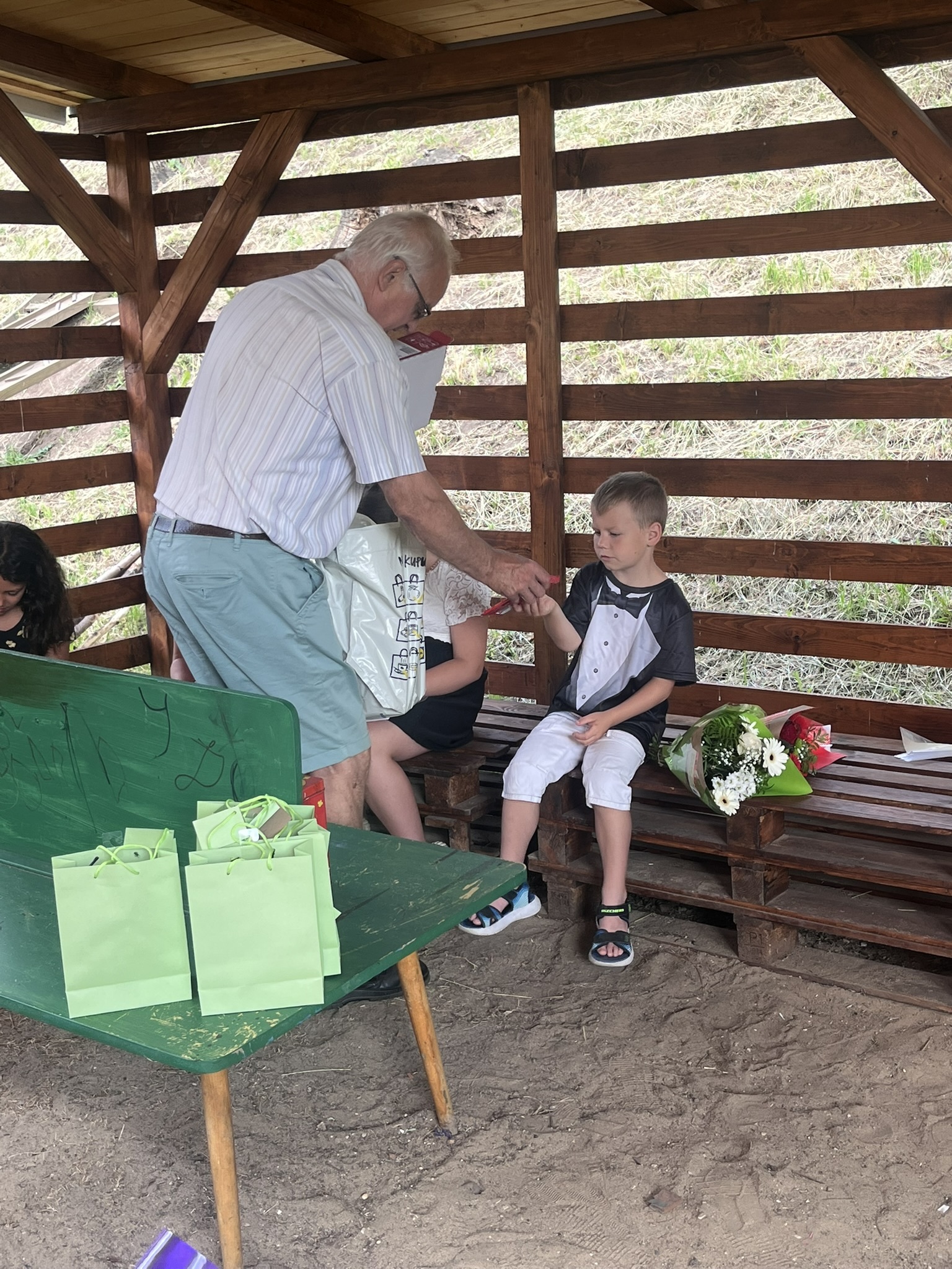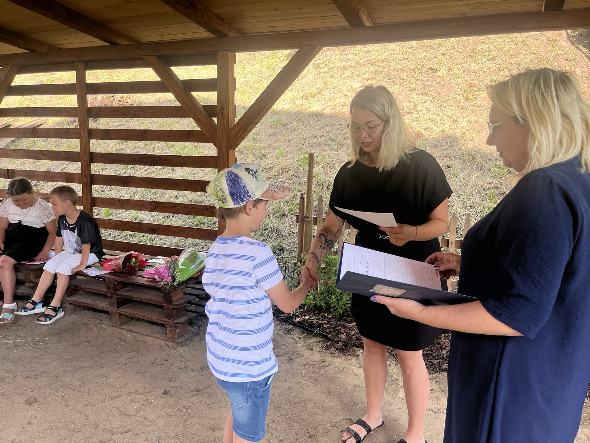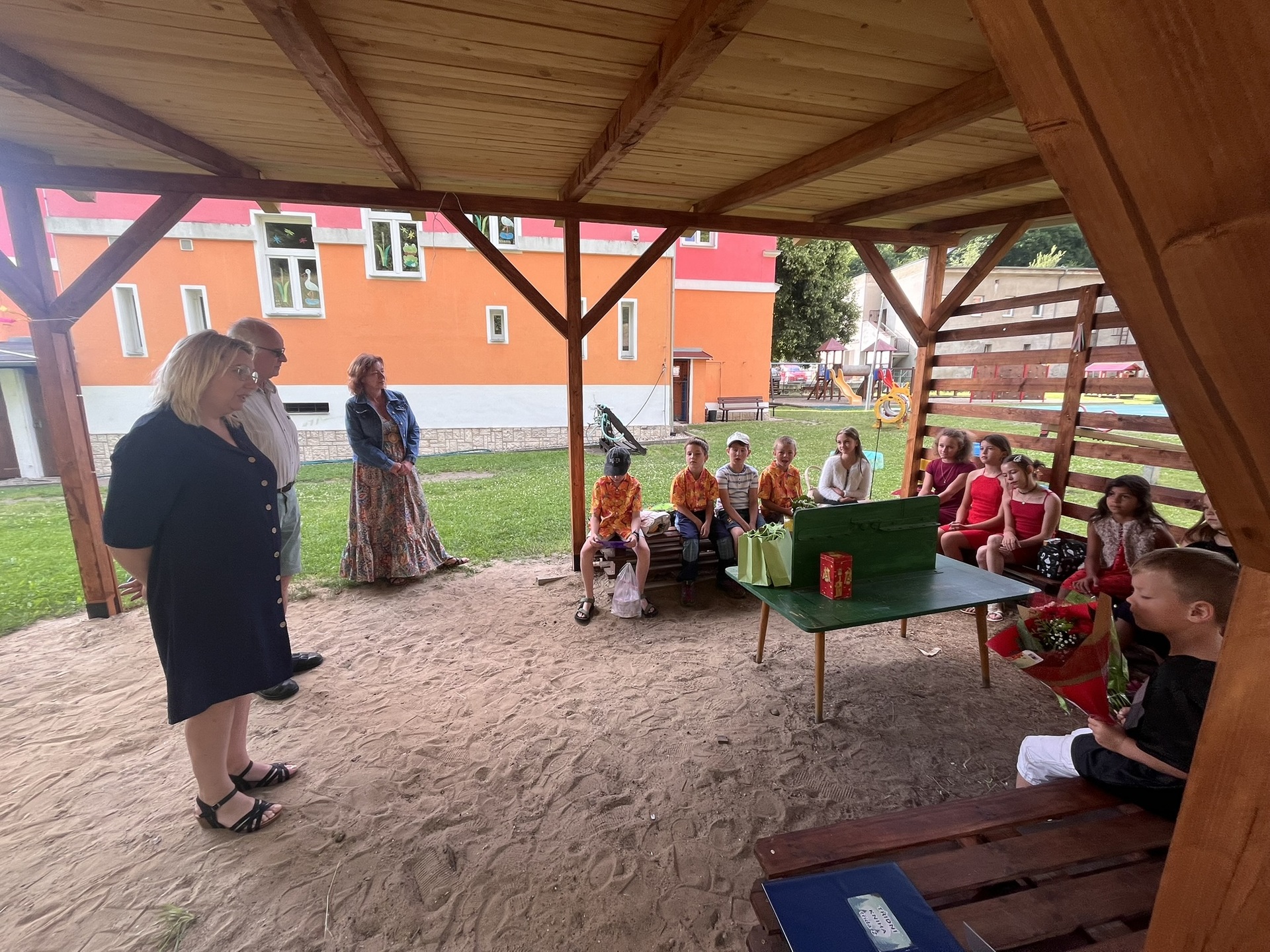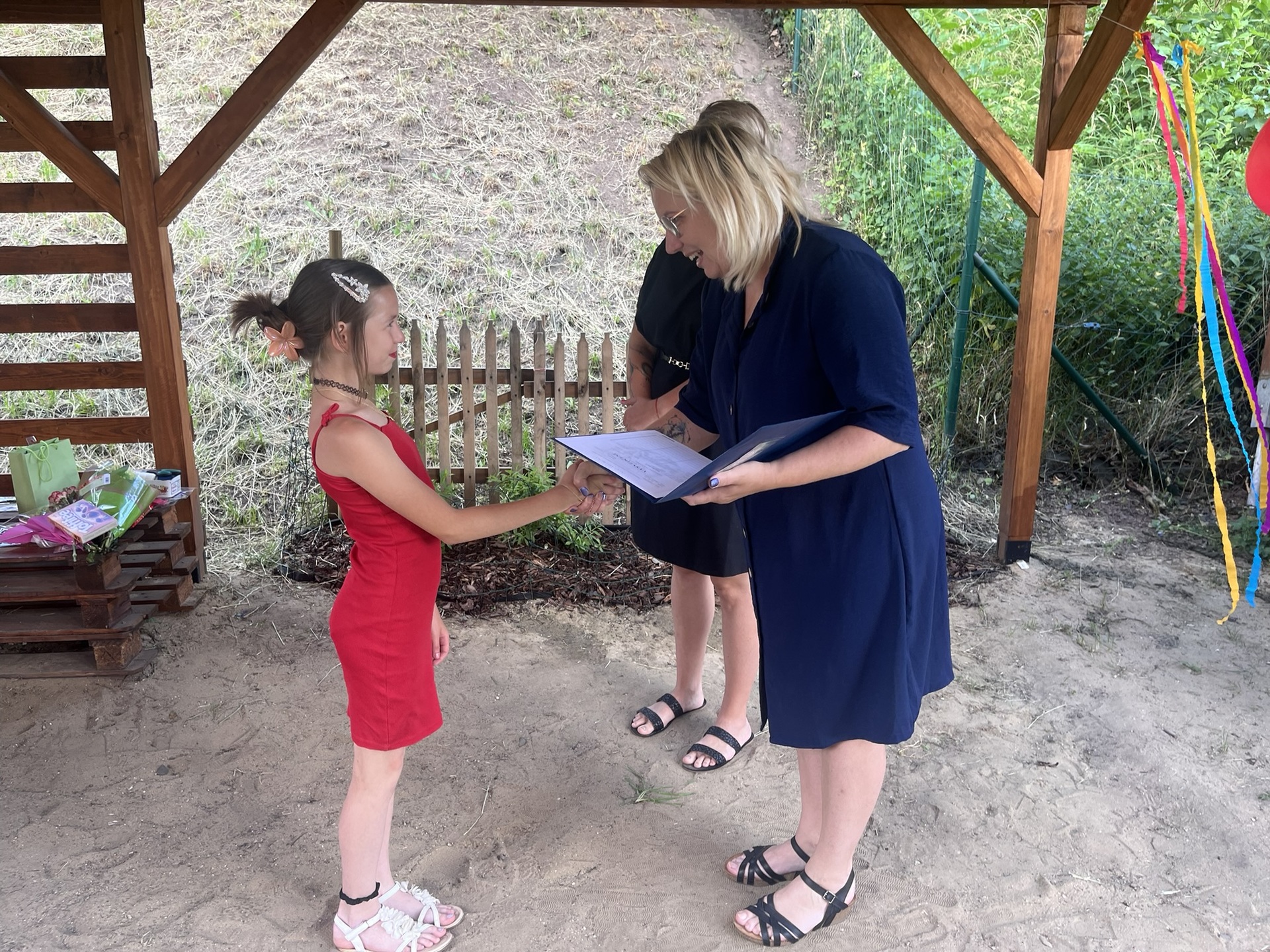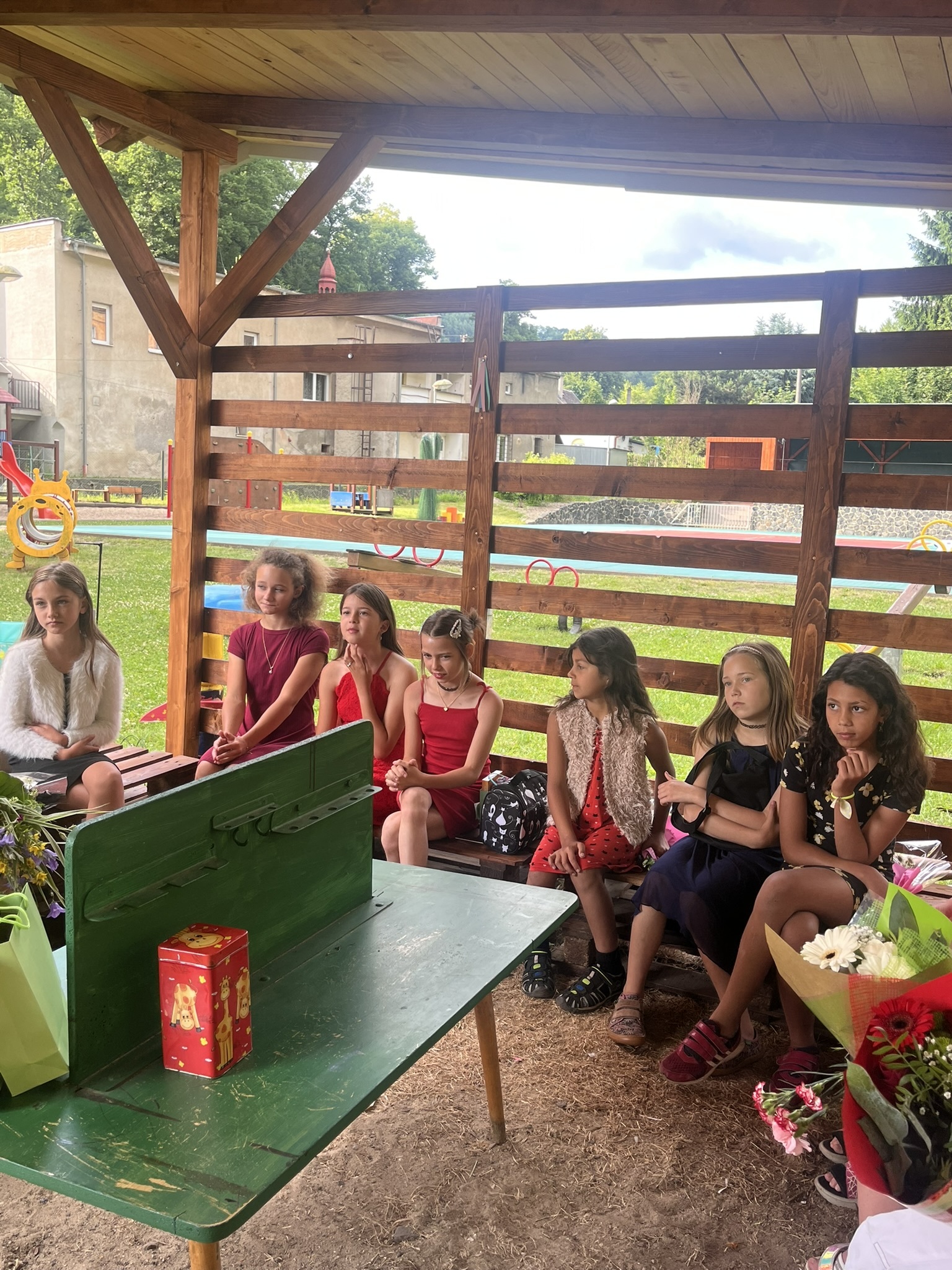 Vysvědčení jsme letos předali venku v naší venkovní učebně – slunce svítilo, děti se usmívaly a pan starosta přijel jako každý rok s čokoládou pro všechny.