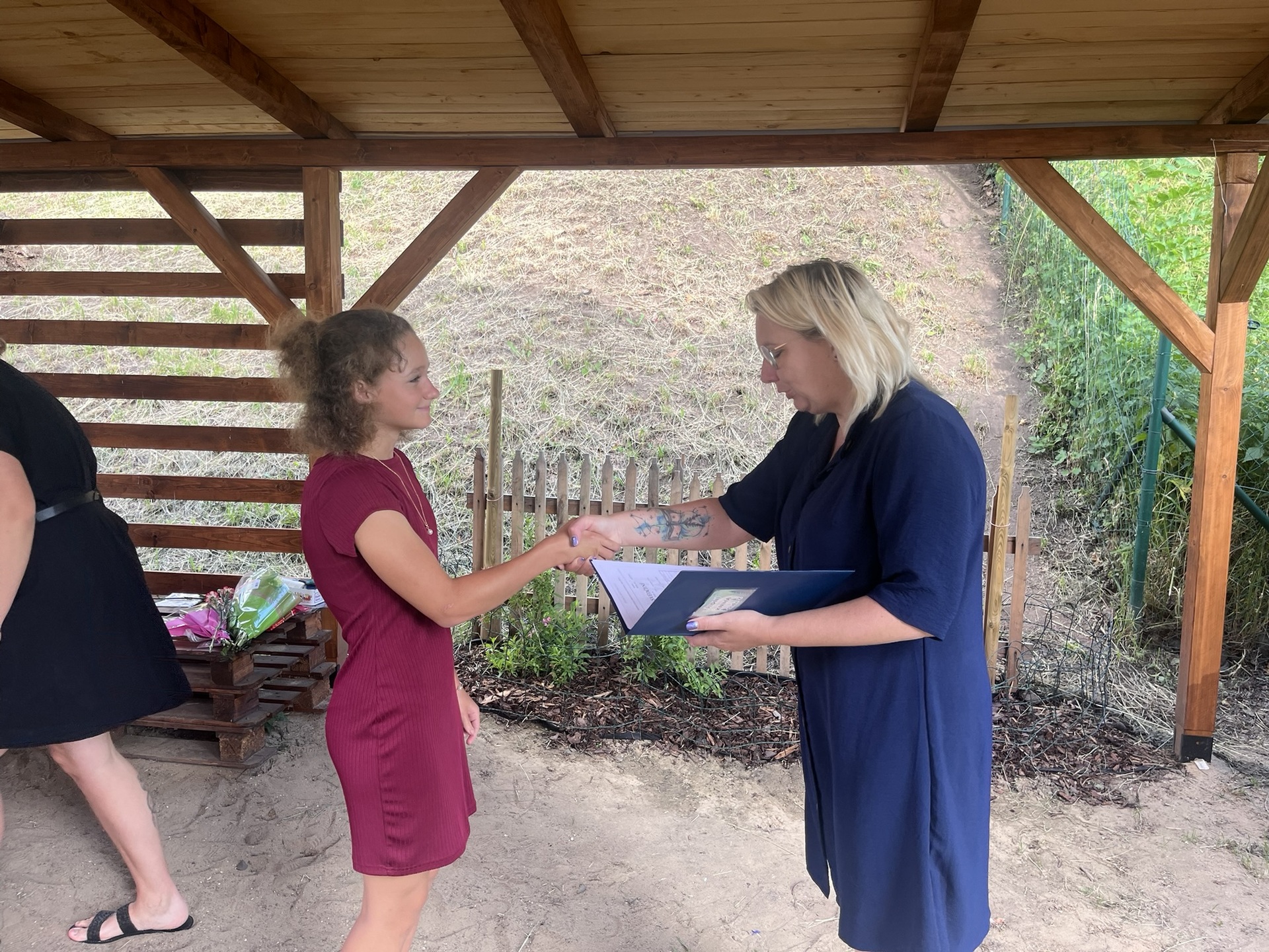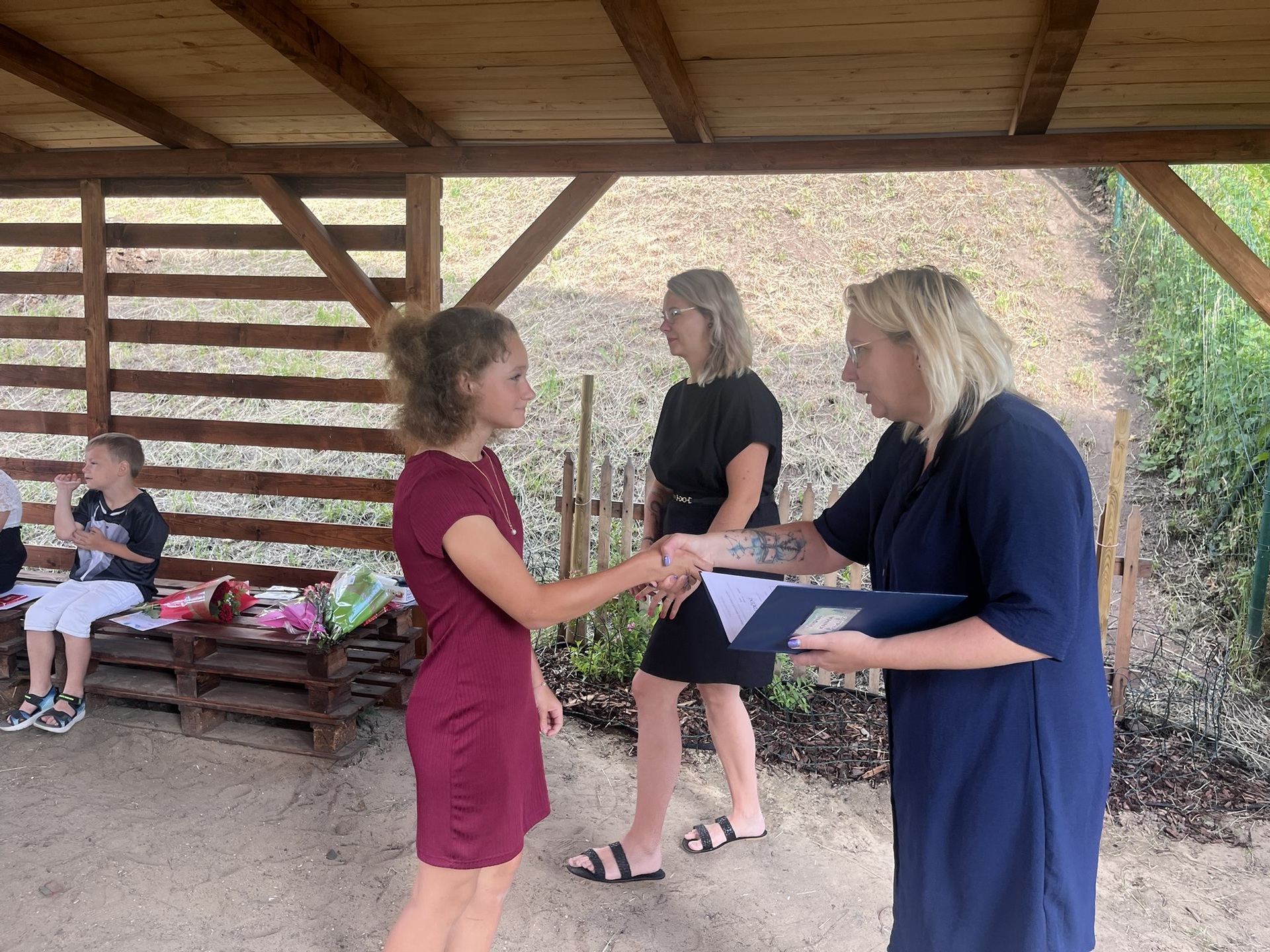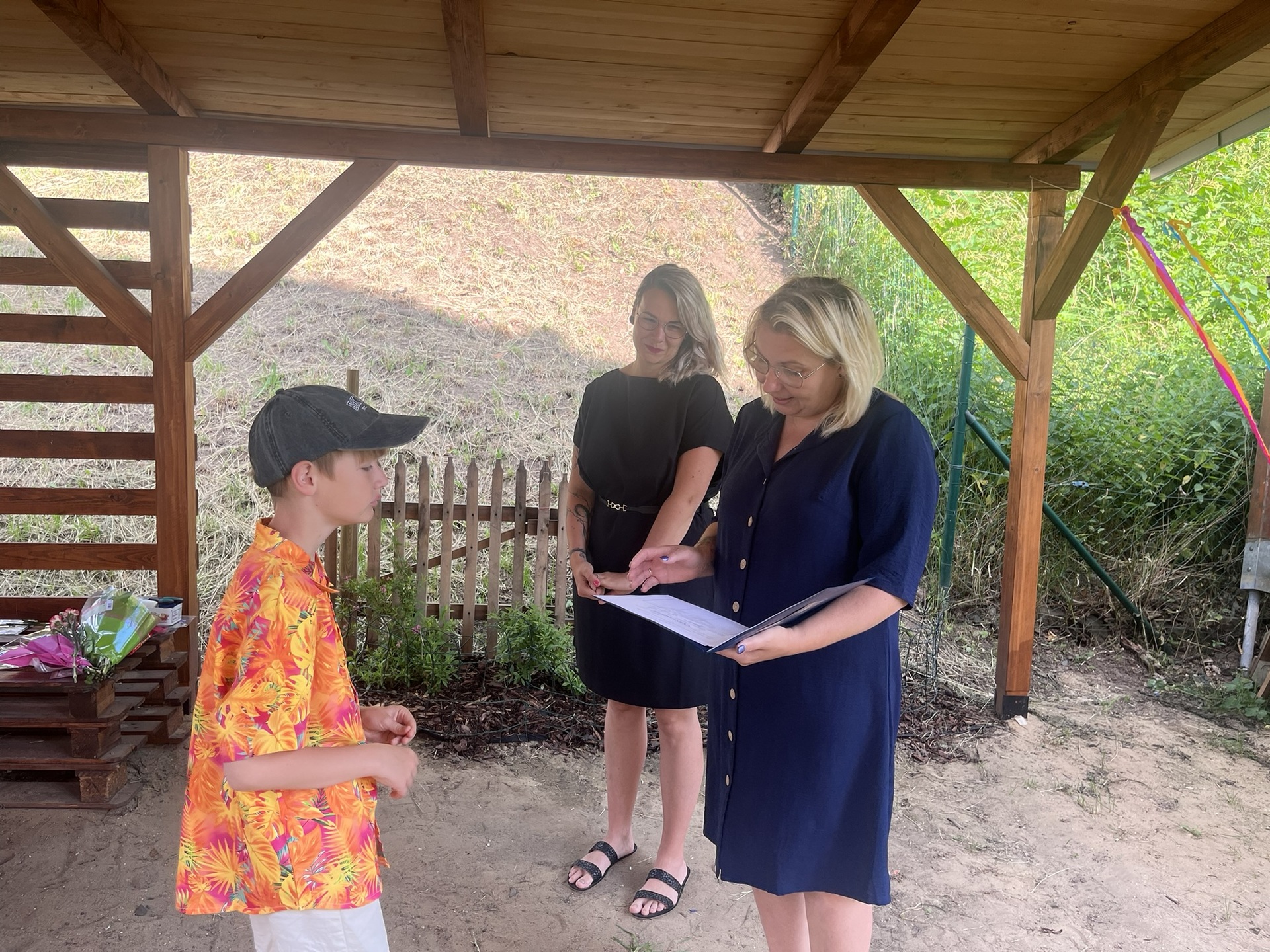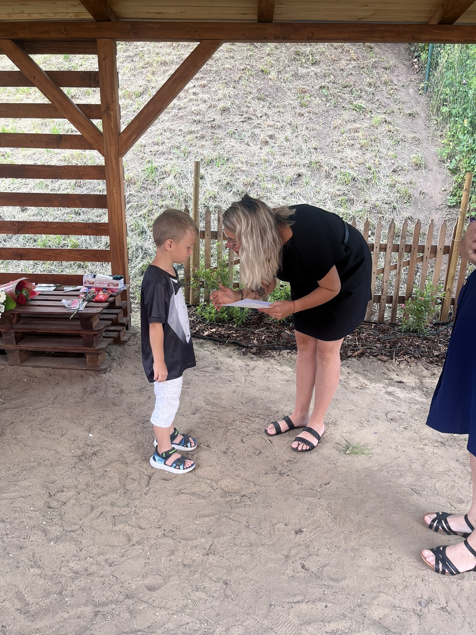 Vysvědčení jsme letos předali venku v naší venkovní učebně – slunce svítilo, děti se usmívaly a pan starosta přijel jako každý rok s čokoládou pro všechny.
