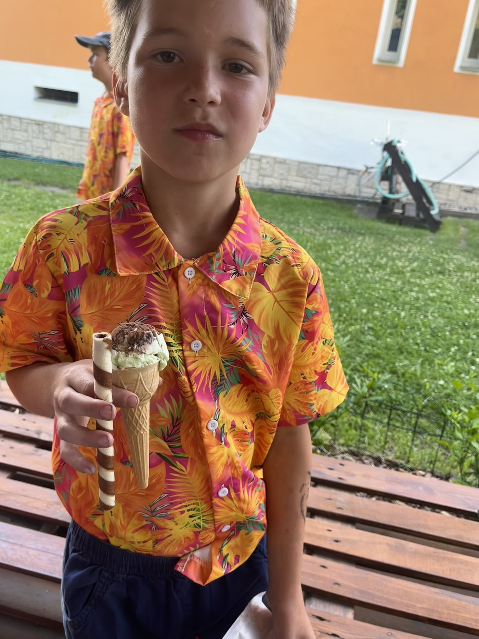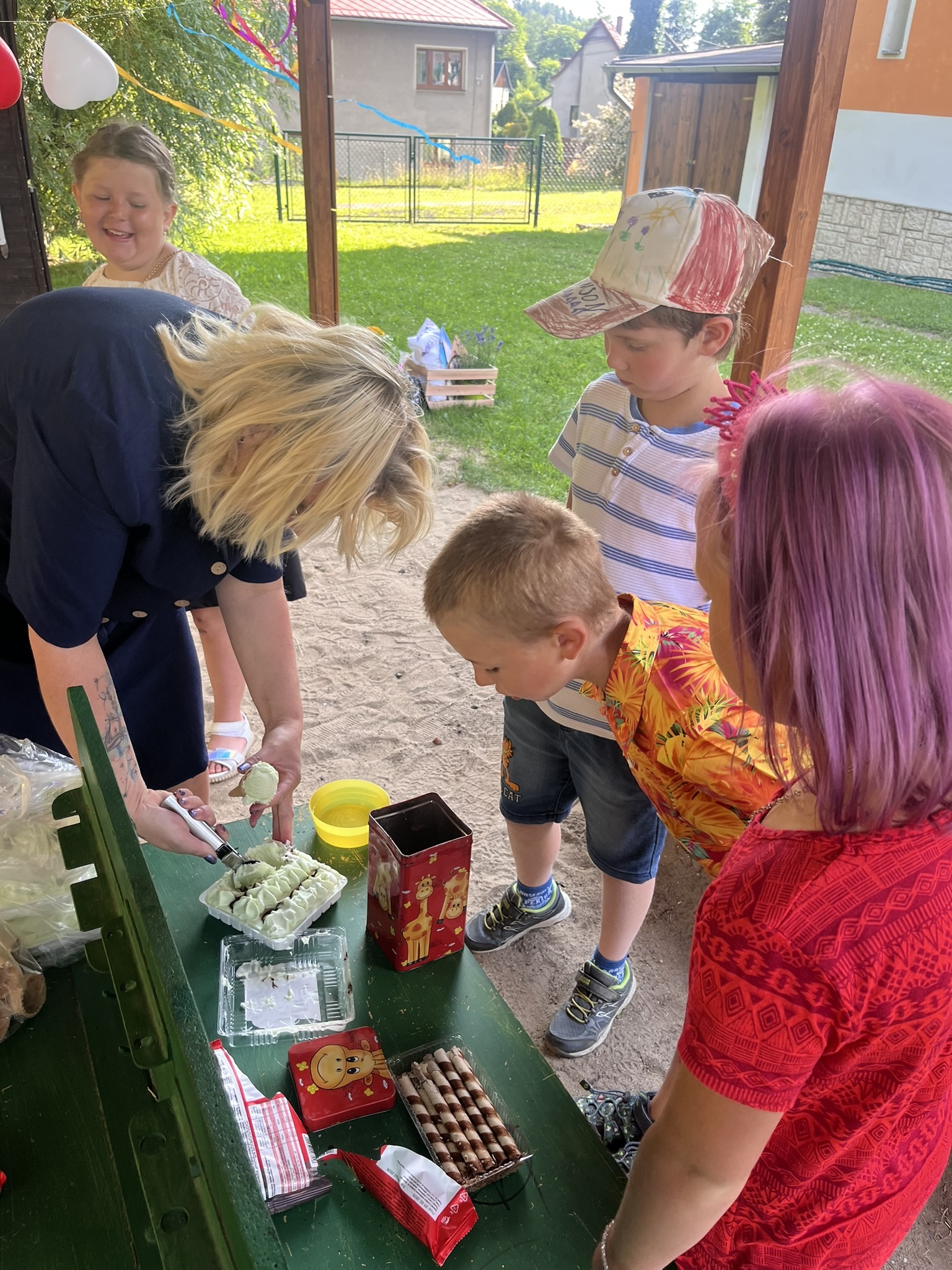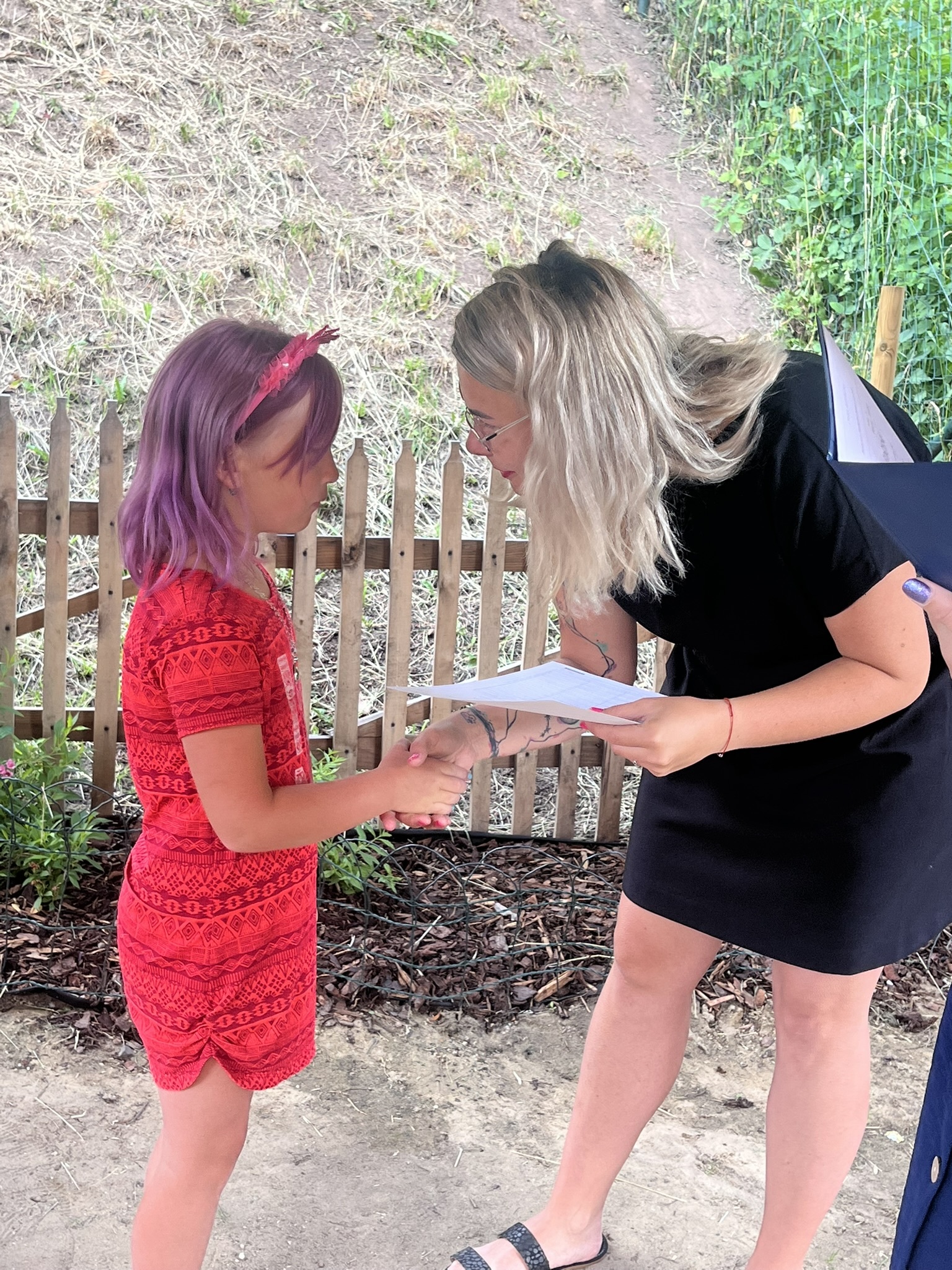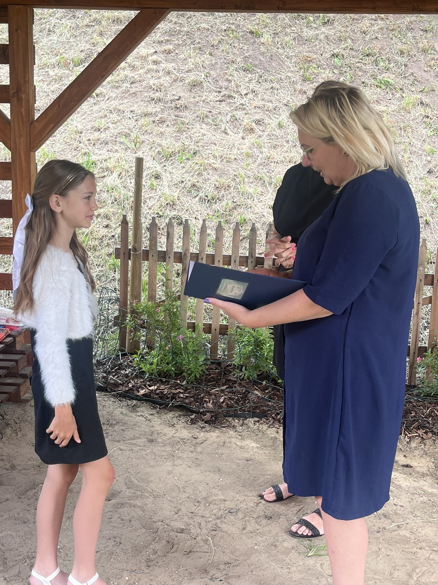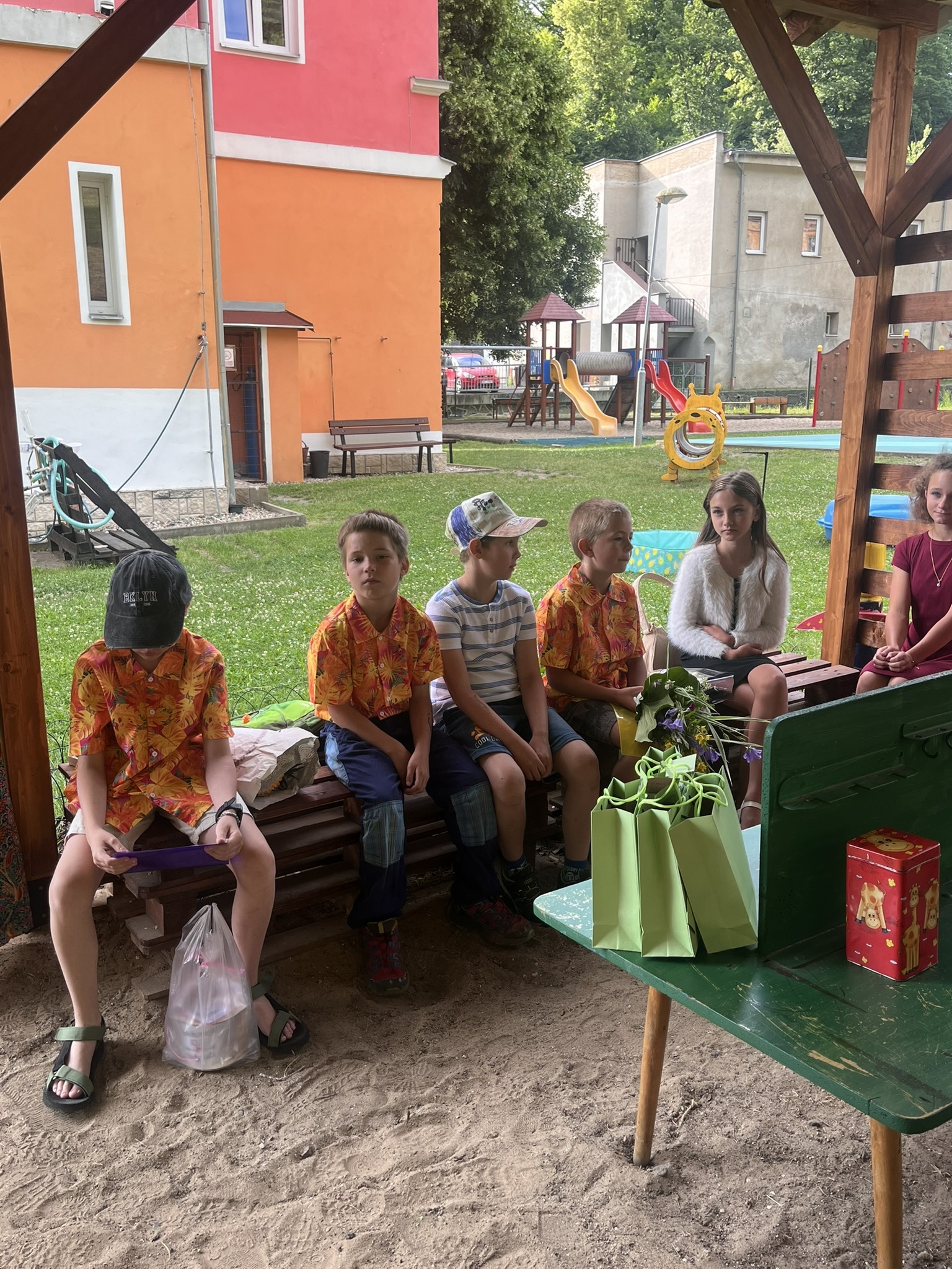 Vysvědčení jsme letos předali venku v naší venkovní učebně – slunce svítilo, děti se usmívaly a pan starosta přijel jako každý rok s čokoládou pro všechny.