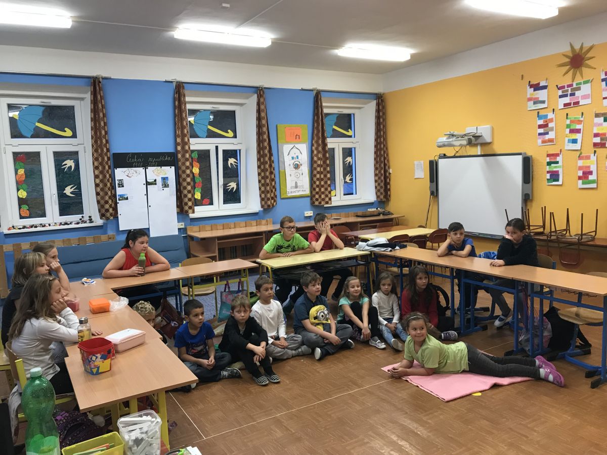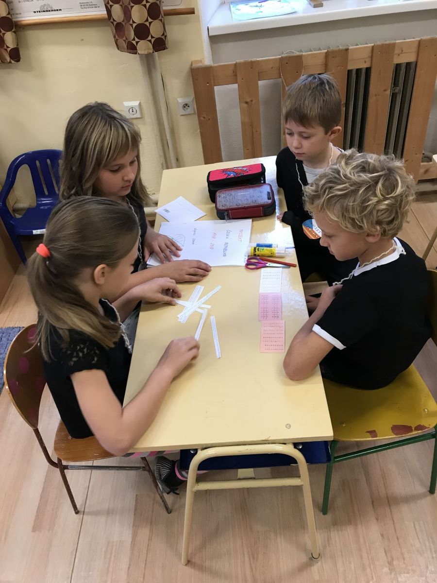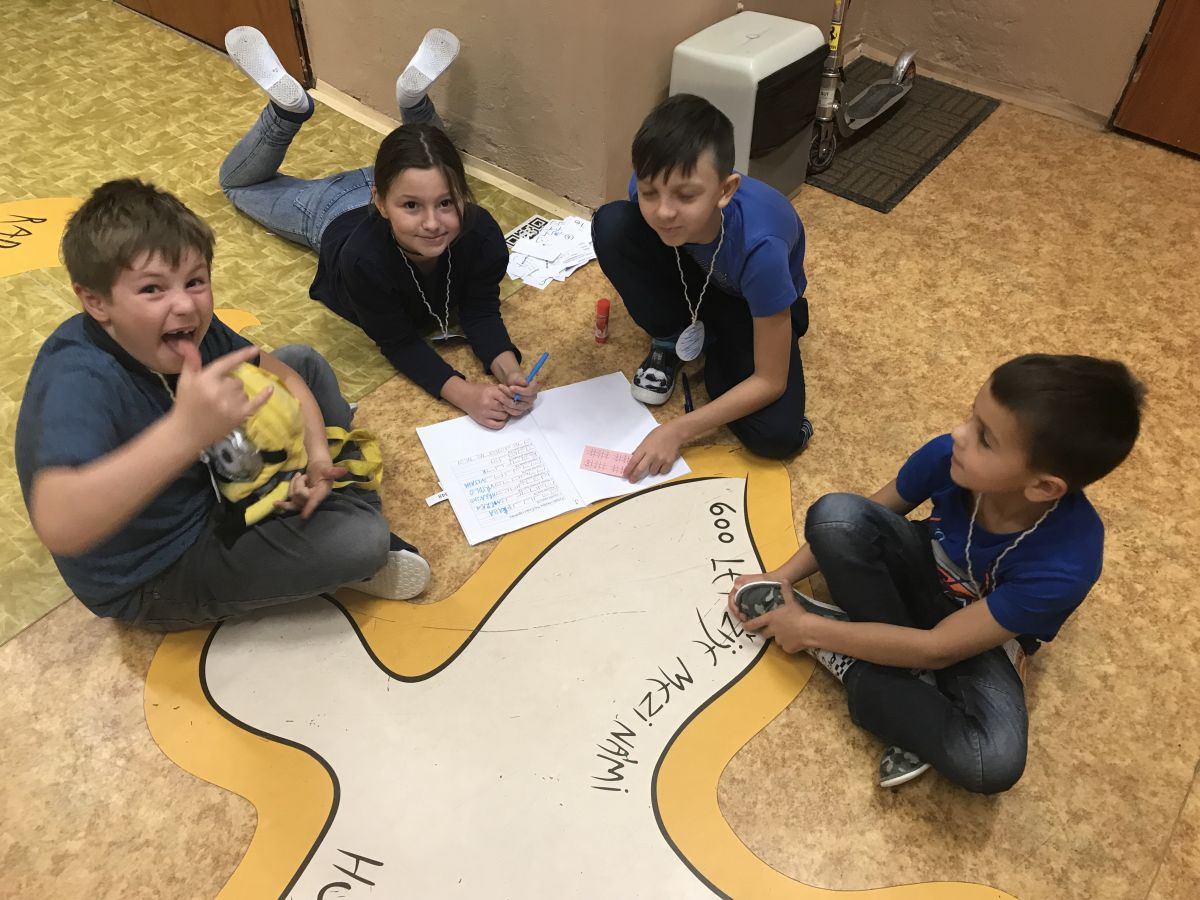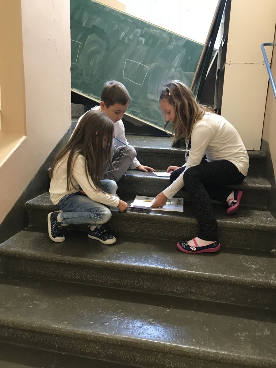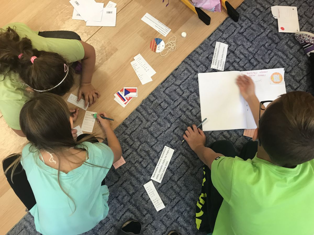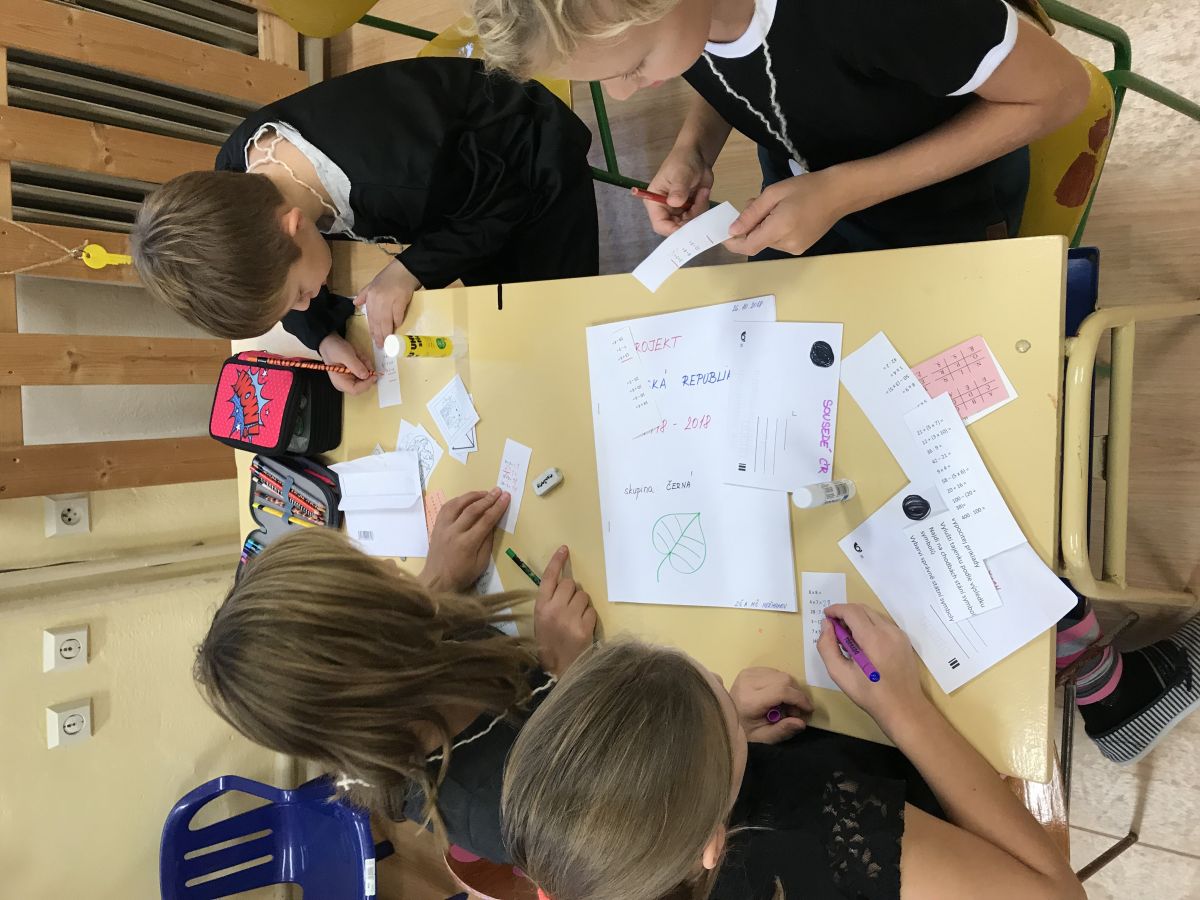 Poté byli žáci rozděleni do 5 týmů napříč ročníky a každý tým musel najít 5 obálek s úkoly, které byly poschovávané po budově školy. Každá skupina měla svůj zápisový arch, do kterého plnila jednotlivé úkoly.
