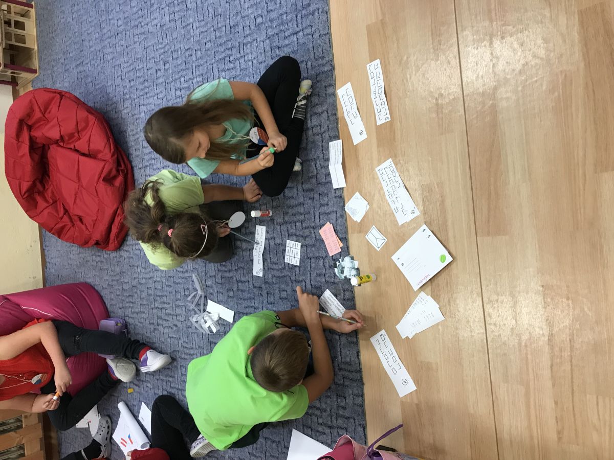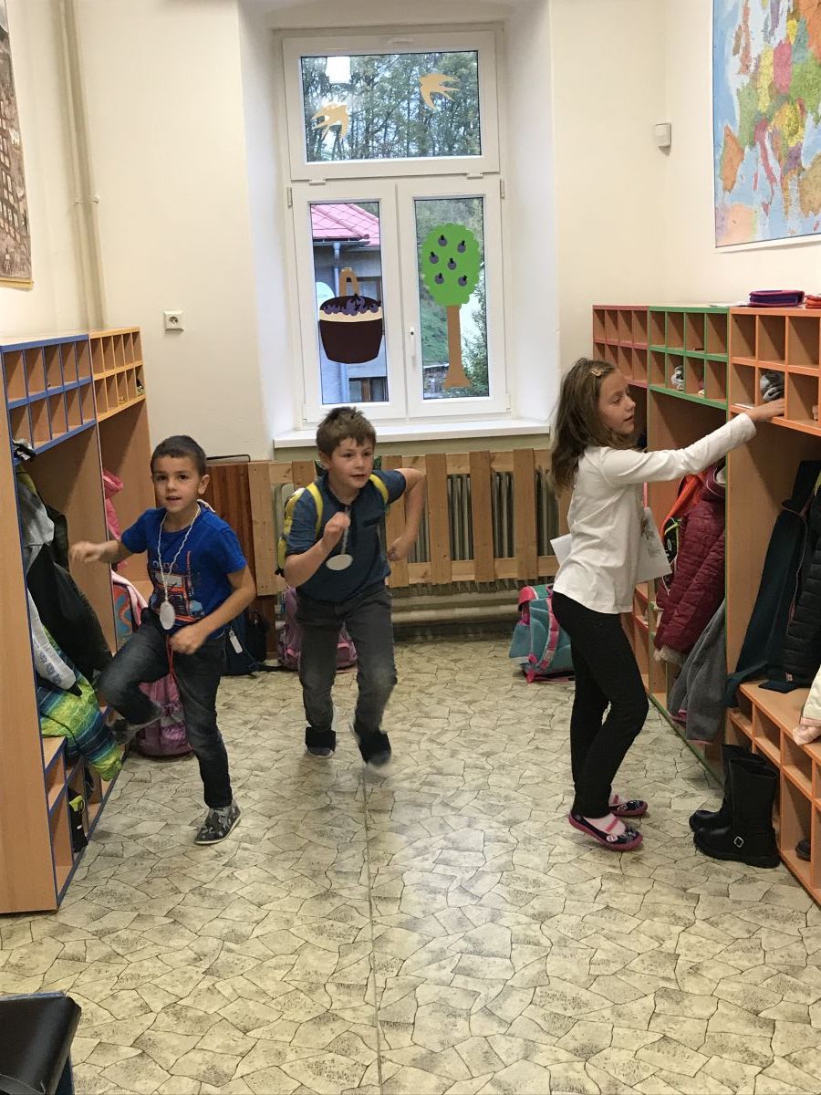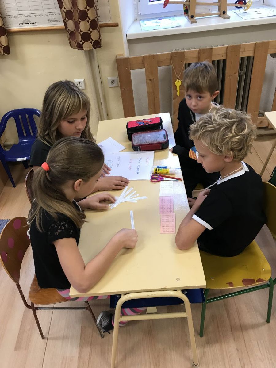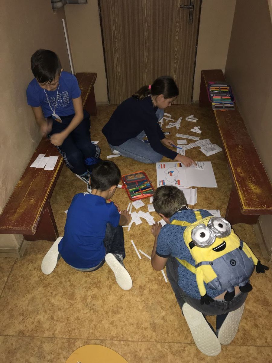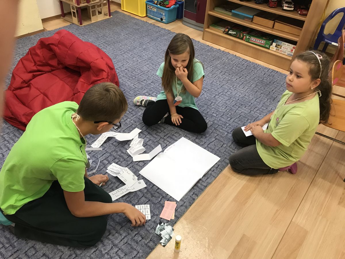 Poté byli žáci rozděleni do 5 týmů napříč ročníky a každý tým musel najít 5 obálek s úkoly, které byly poschovávané po budově školy. Každá skupina měla svůj zápisový arch, do kterého plnila jednotlivé úkoly.