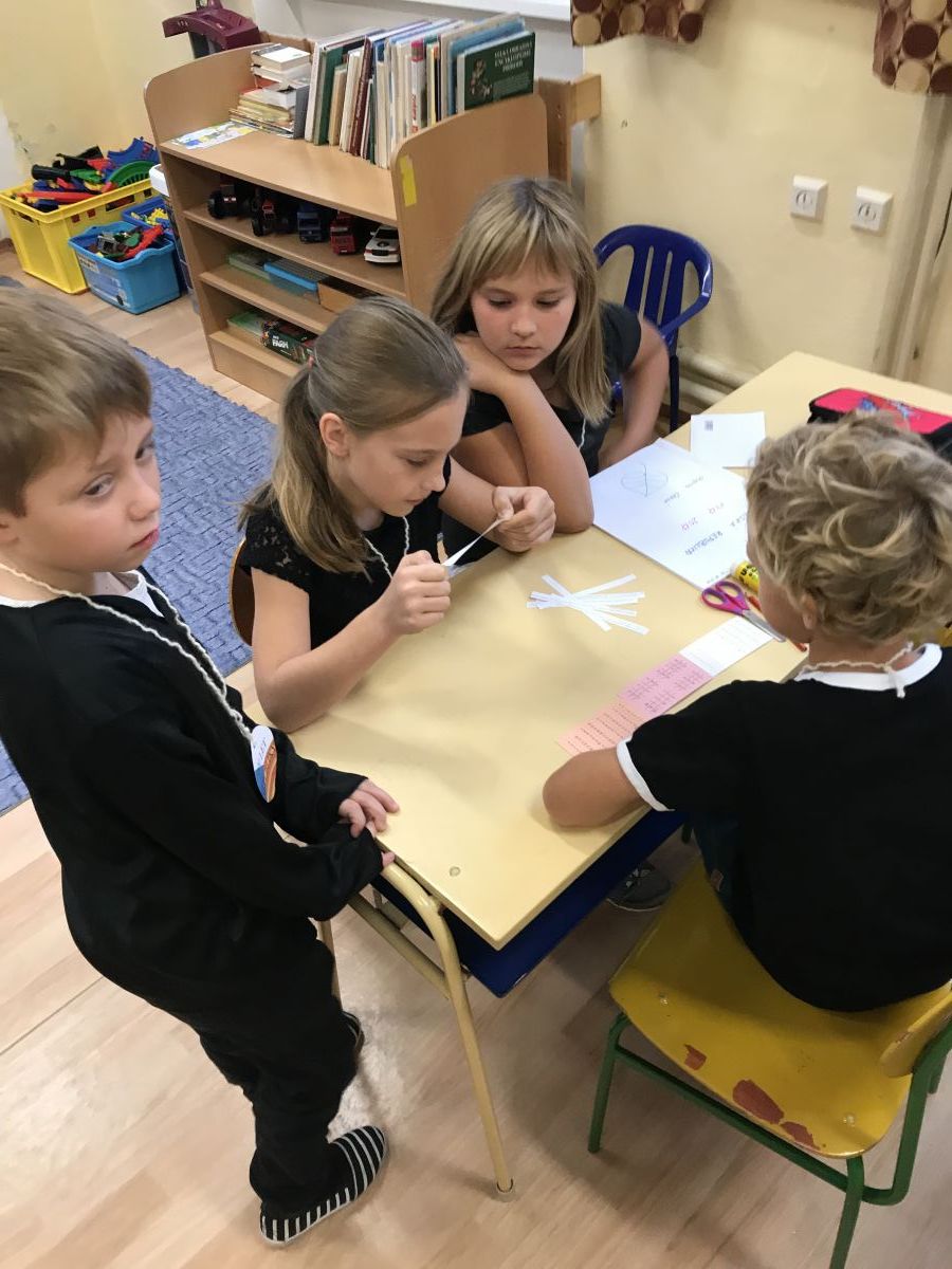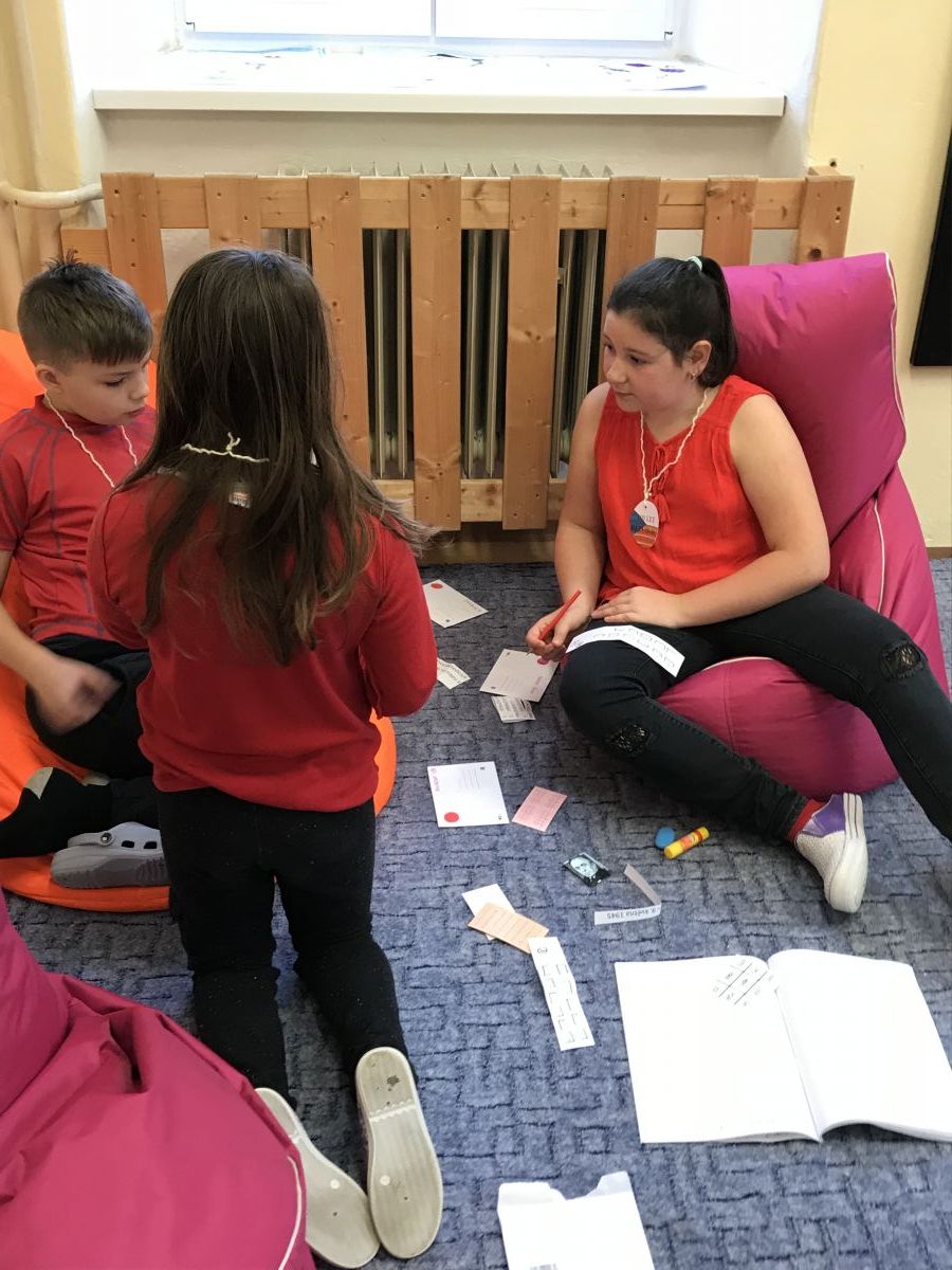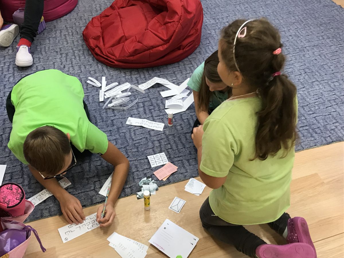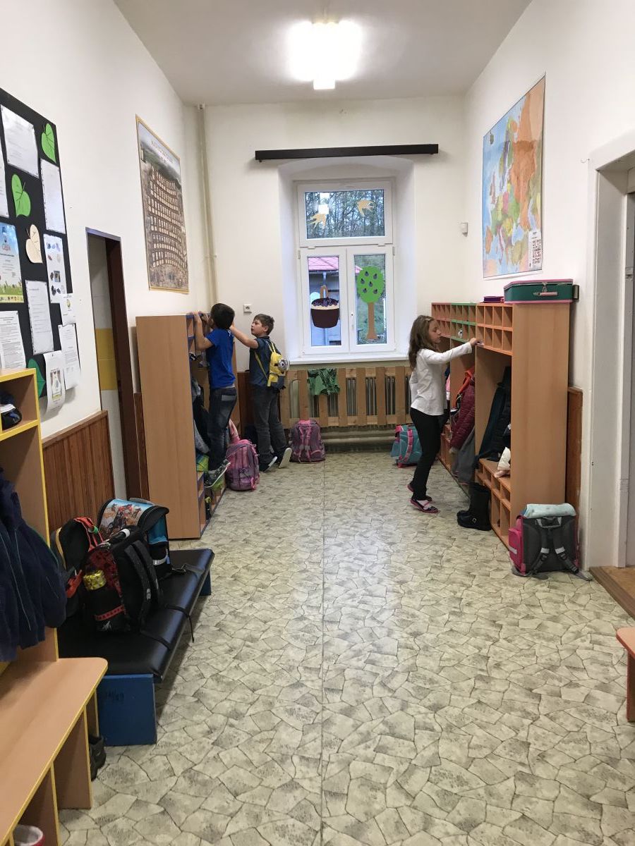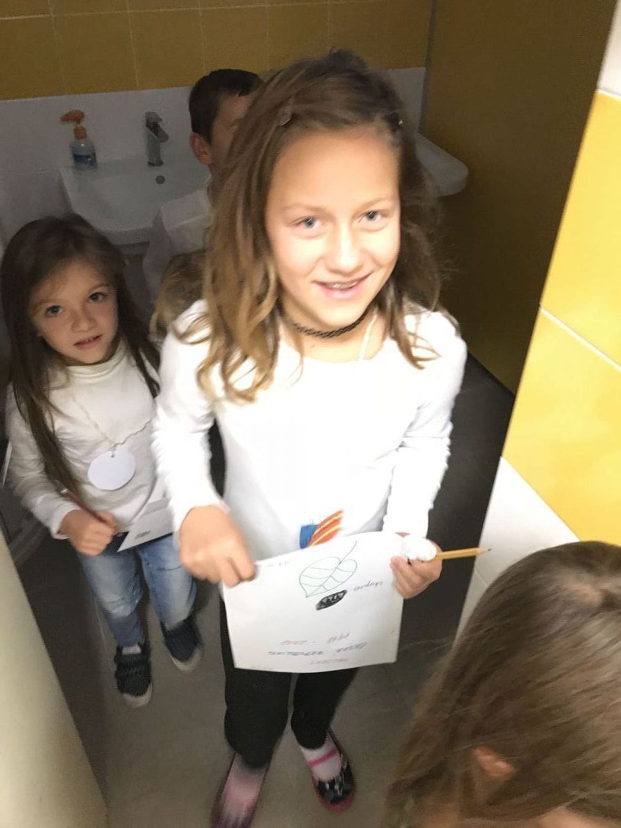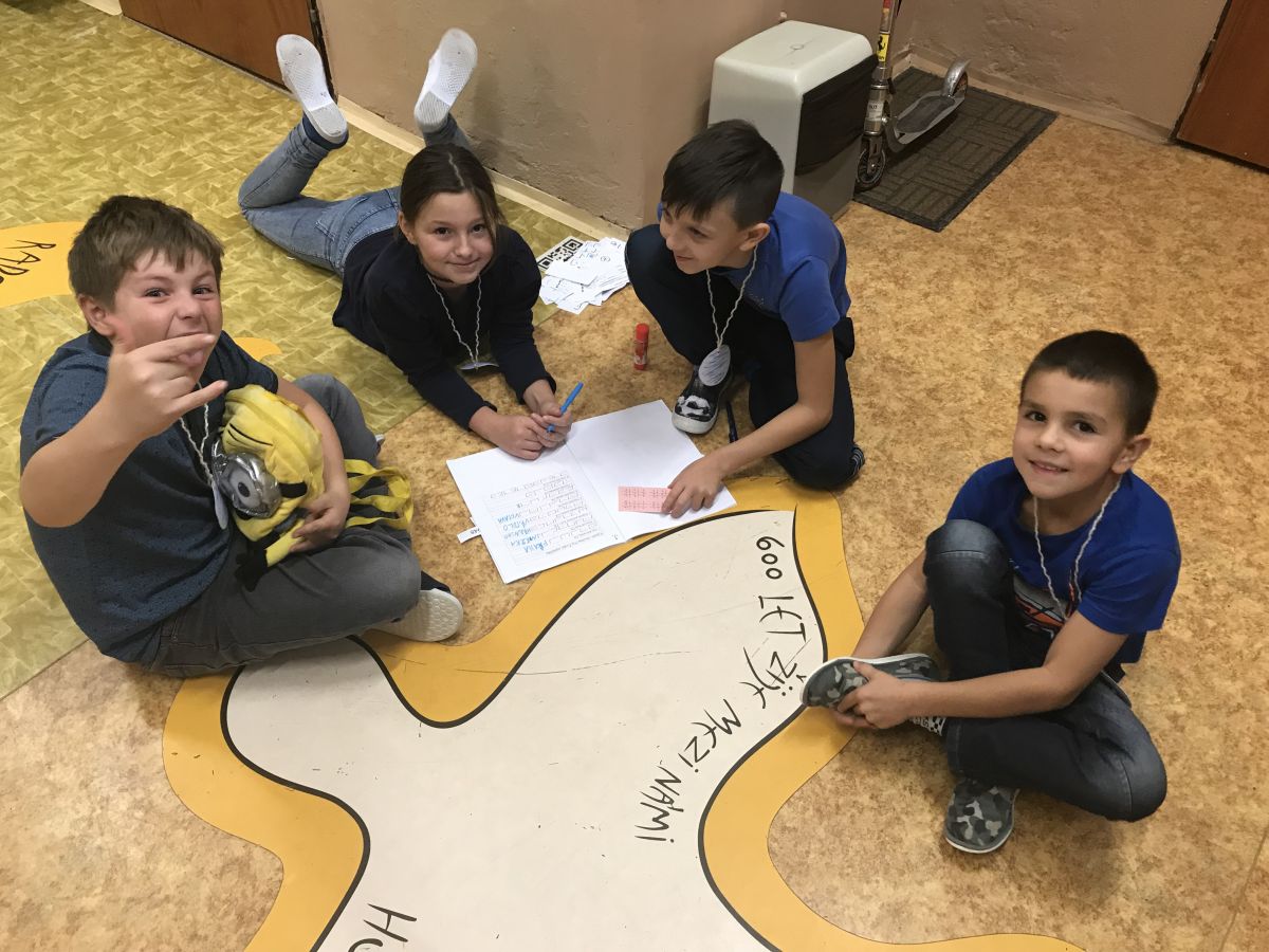 Poté byli žáci rozděleni do 5 týmů napříč ročníky a každý tým musel najít 5 obálek s úkoly, které byly poschovávané po budově školy. Každá skupina měla svůj zápisový arch, do kterého plnila jednotlivé úkoly.