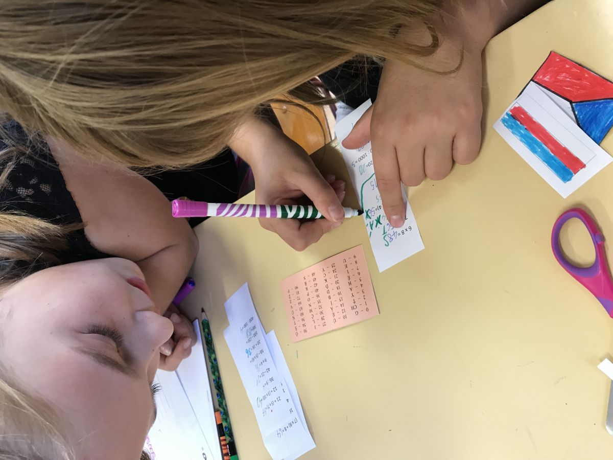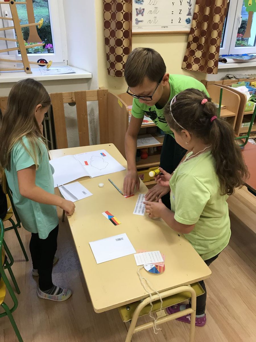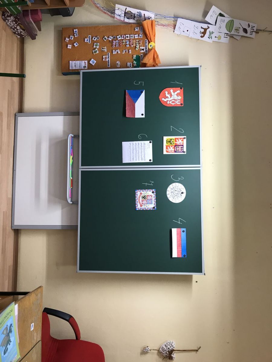 2. Vypočítali příklady a výsledky našli v šifrovací tabulce, poté jim vyšly názvy státních znaků. Obrázky státních znaků vybarvili a přiřadili ke správnému názvu.