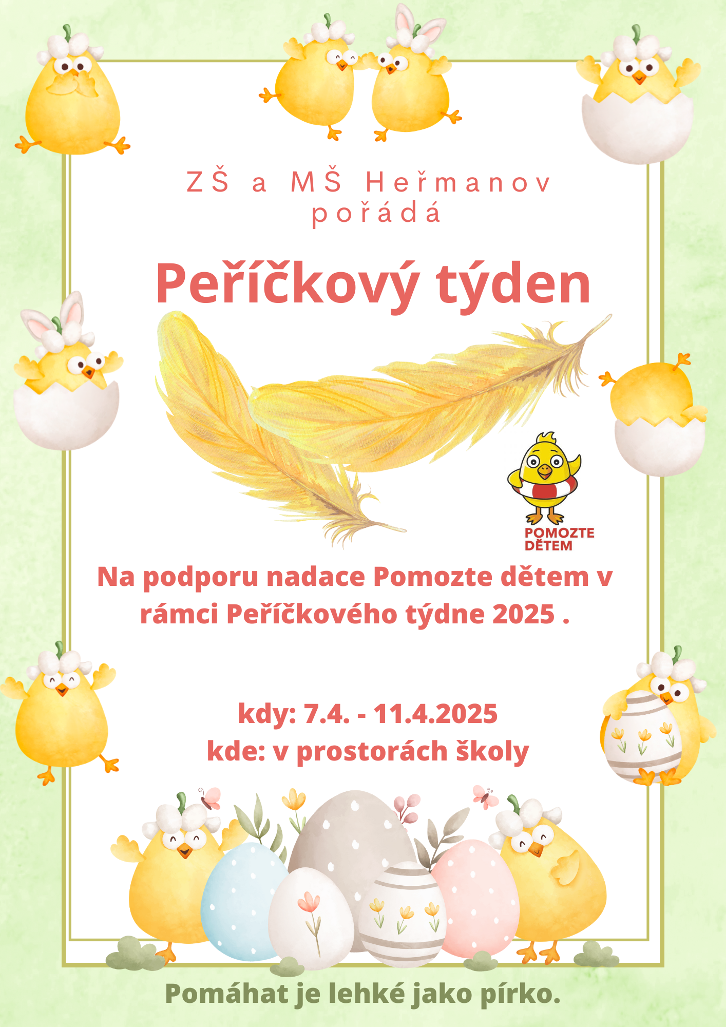 v týdnu od 7.4. - 11.4.2025 proběhne v naší škole Peříčkový týden – charitativní akce na podporu Nadace Pomozme dětem.