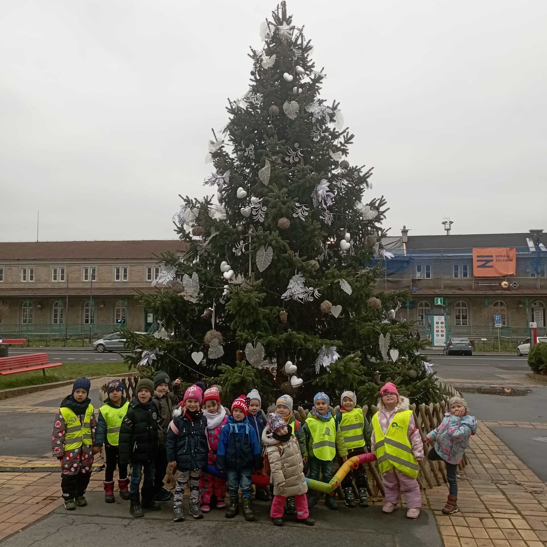 Cestou zpět k autobusu jsme si udělali slavnostní zastávku! Děti se společně vyfotily u nádherně nazdobeného vánočního stromu v Děčíně. Byl to krásný závěr povedeného dopoledne plného kultury a sváteční atmosféry. Už se těšíme na další společný výlet.