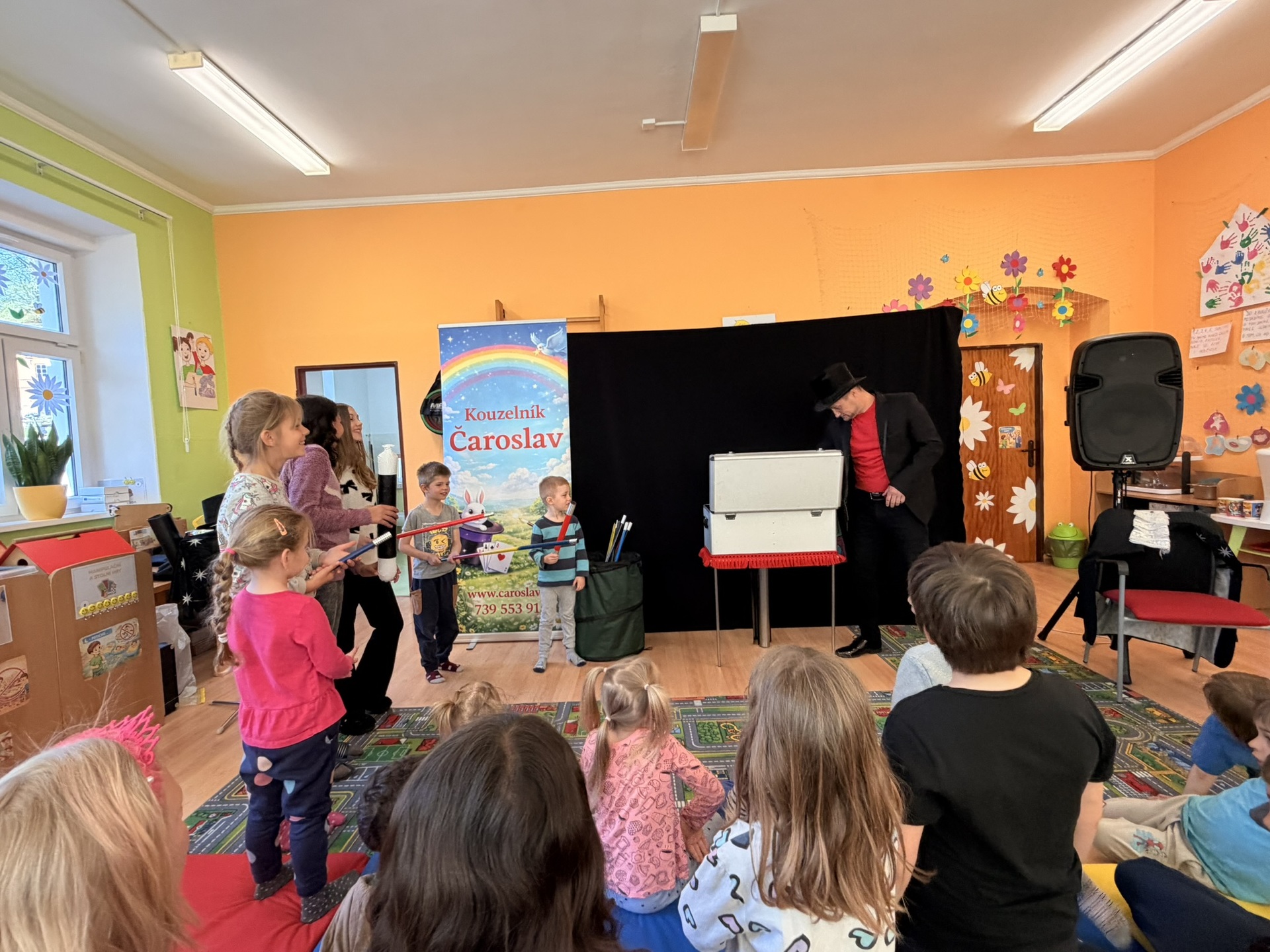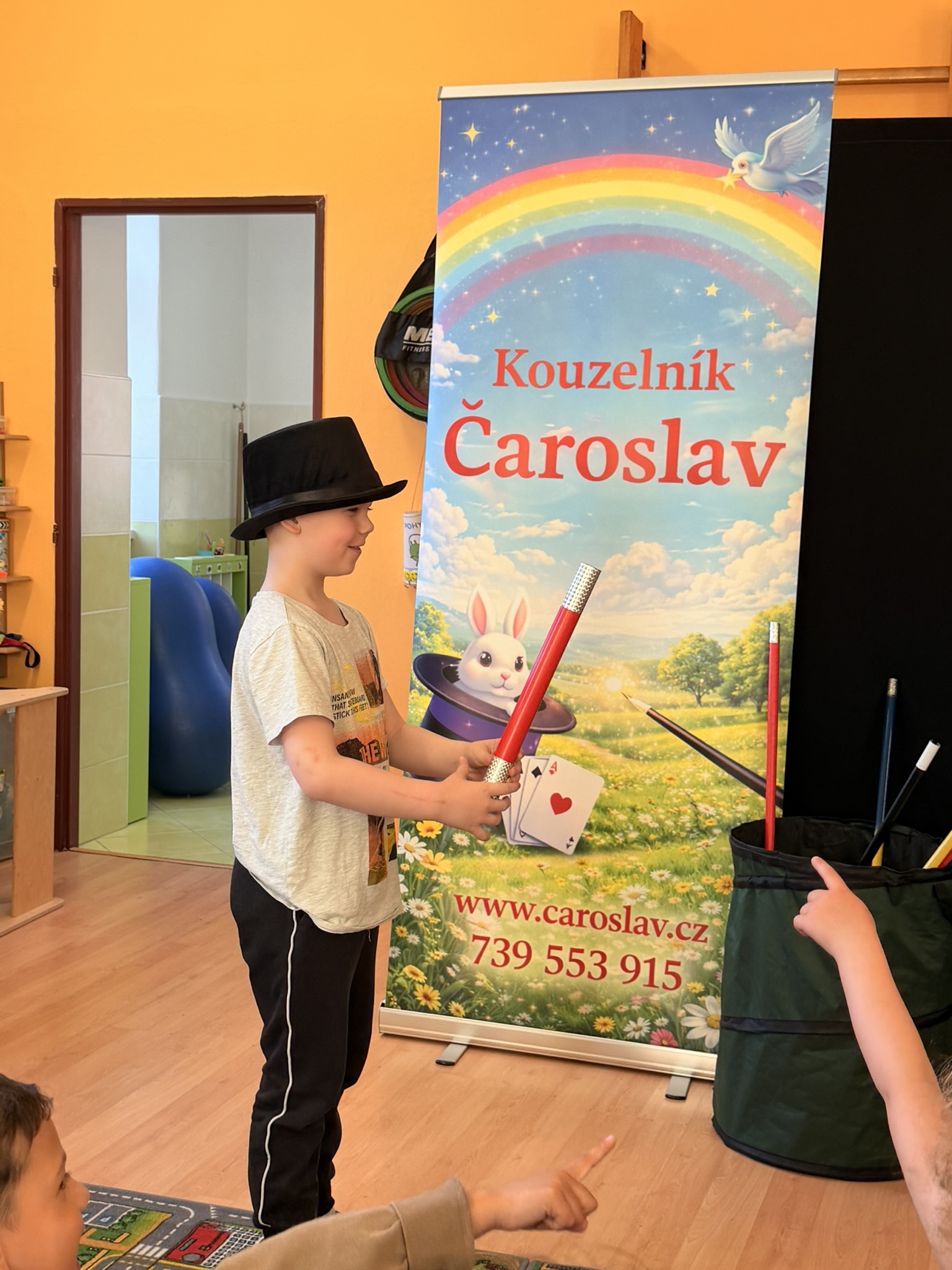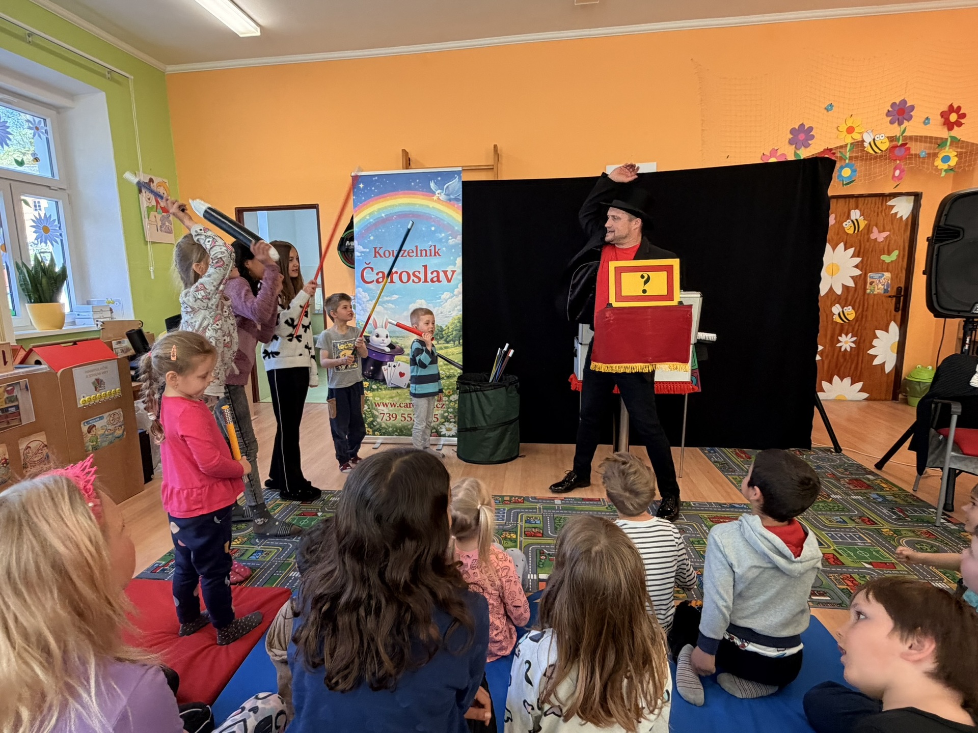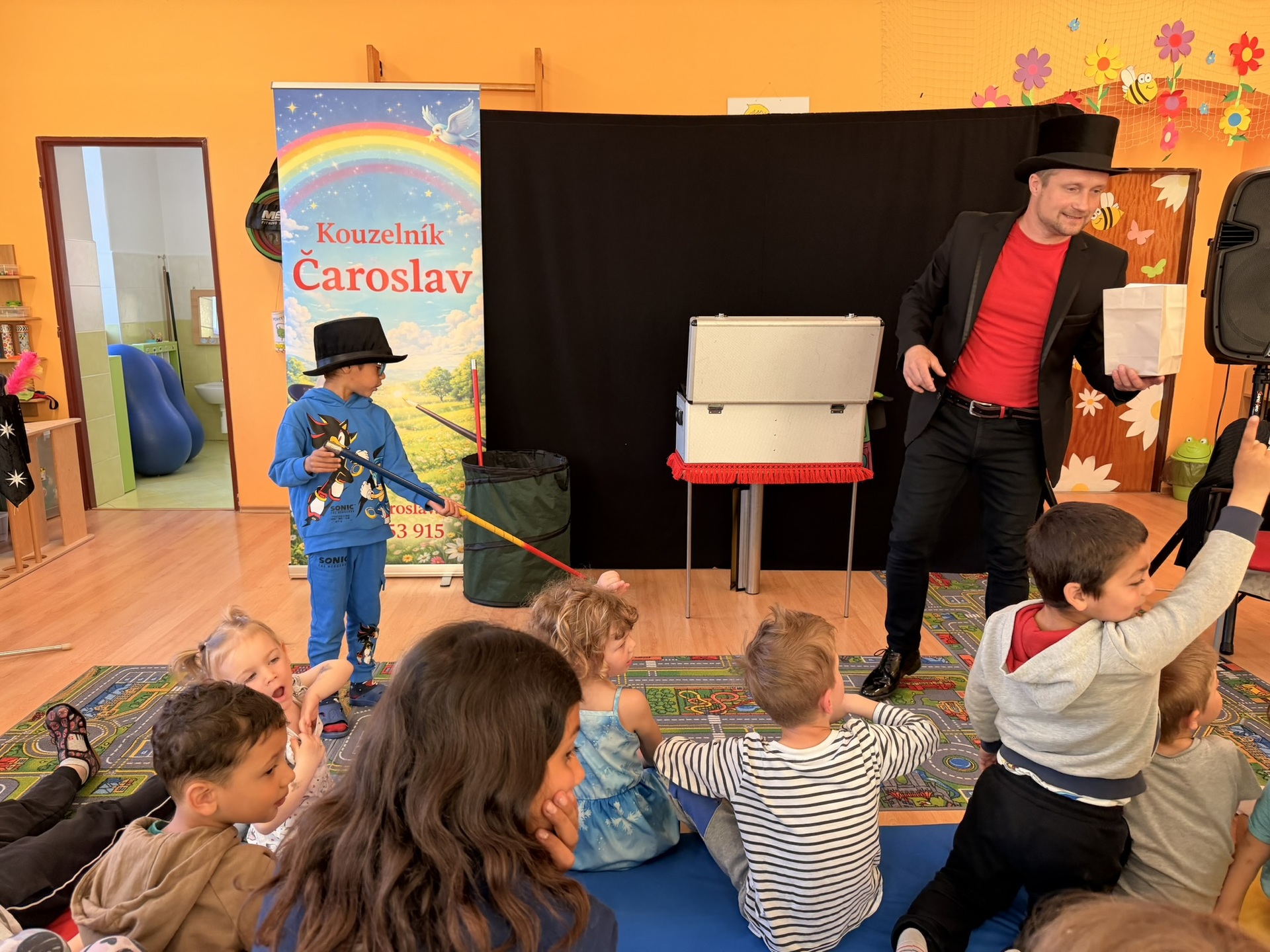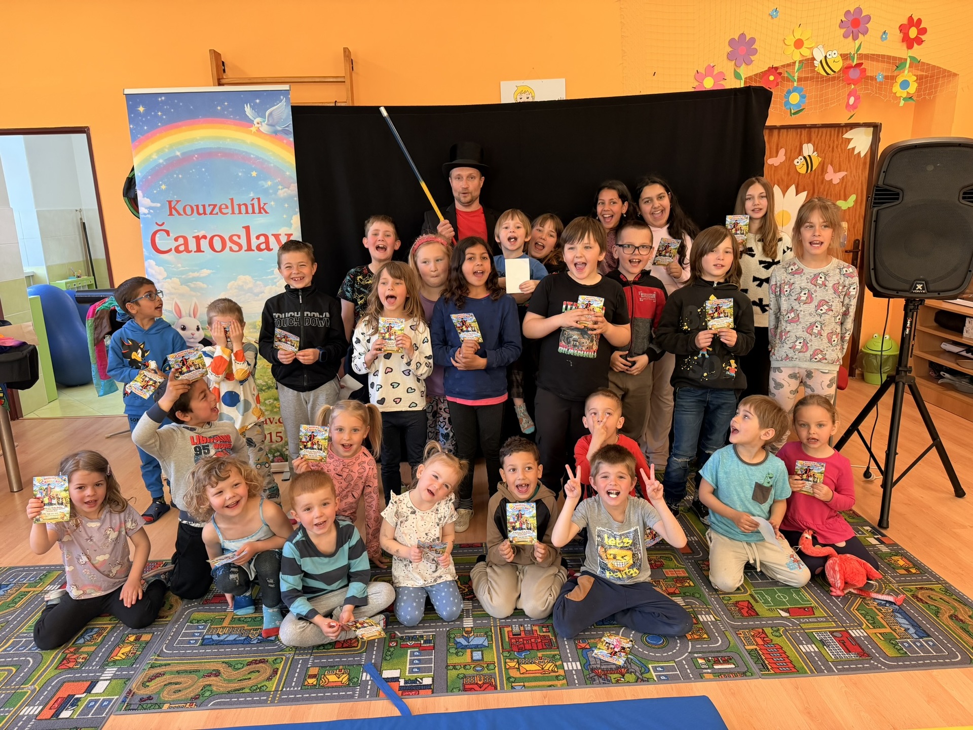 Dnešní den nám zpestřil svou návštěvou kouzelník Čaroslav, který si získal pozornost dětí hned v první minutě svého vystoupení. Od samého začátku bylo jasné, že nás čeká nezapomenutelná show plná překvapení, smíchu a úžasu.