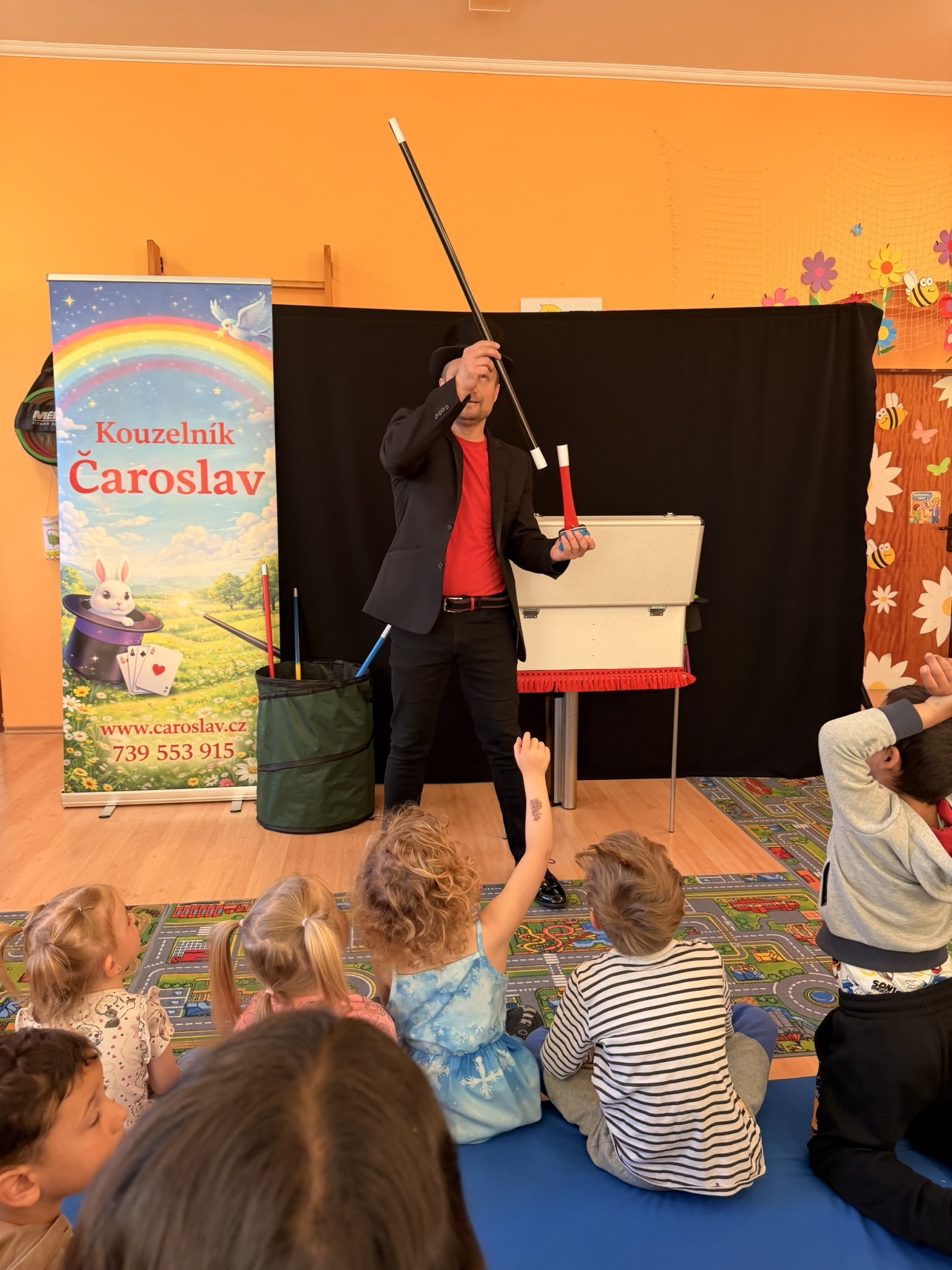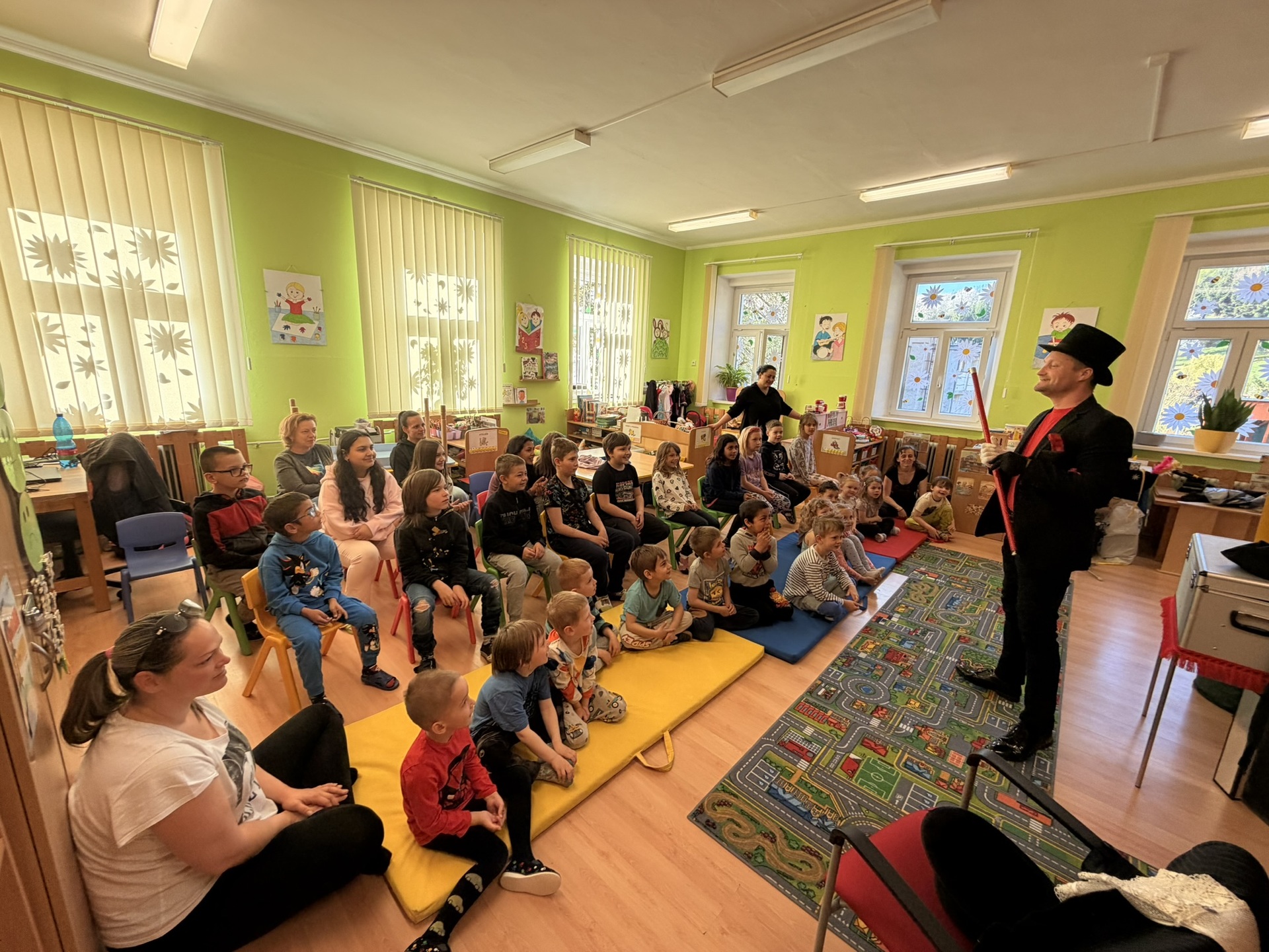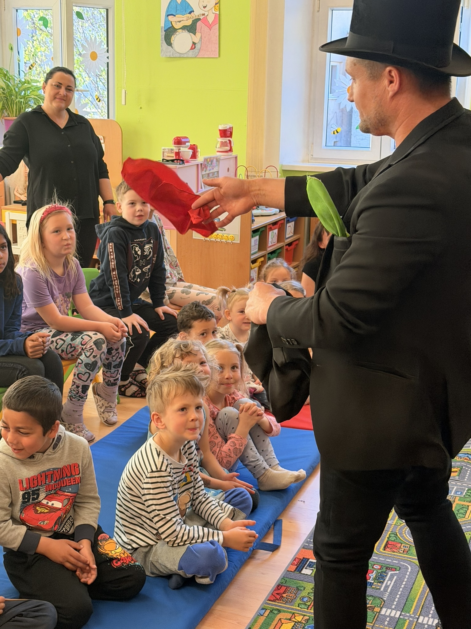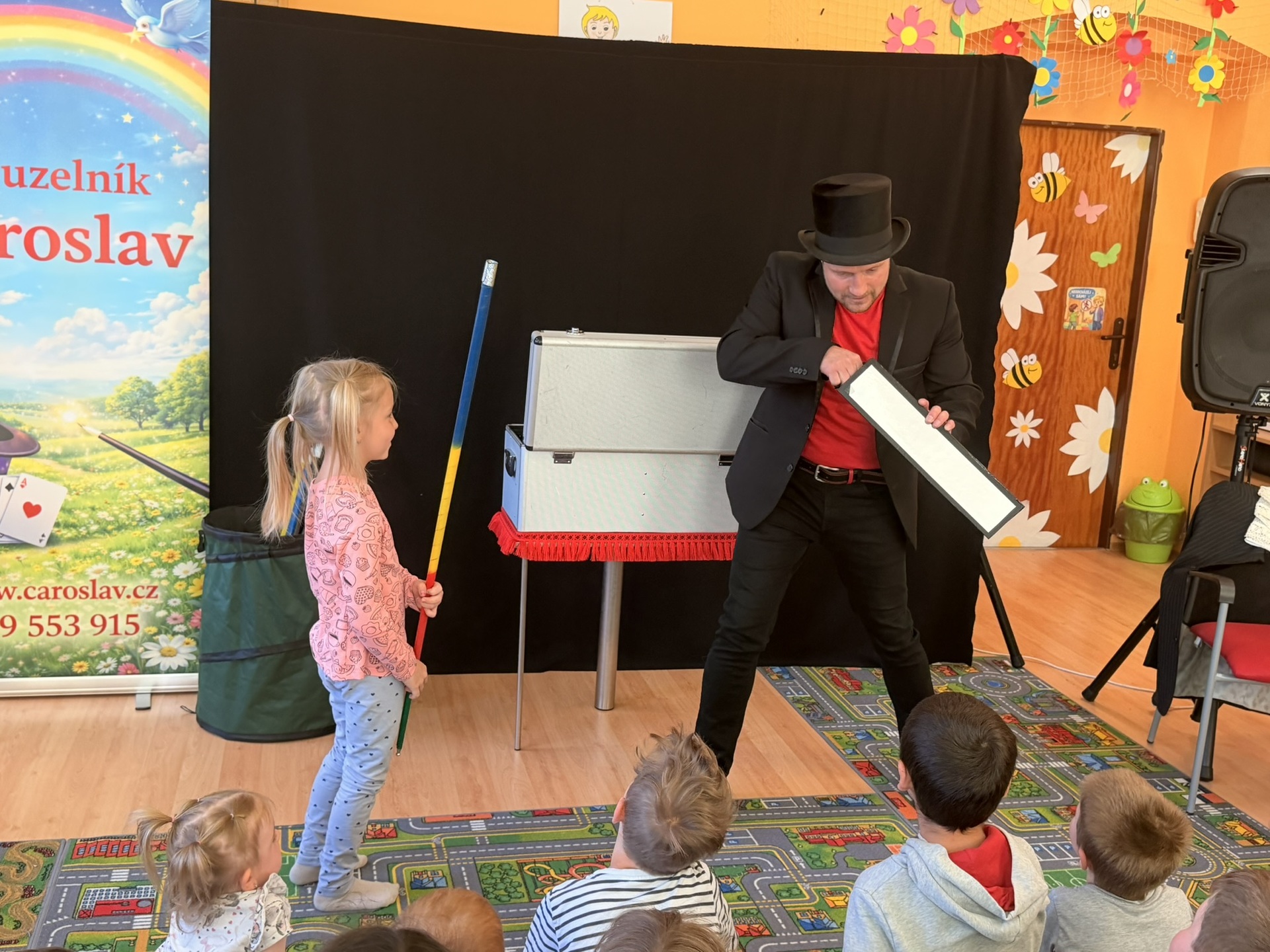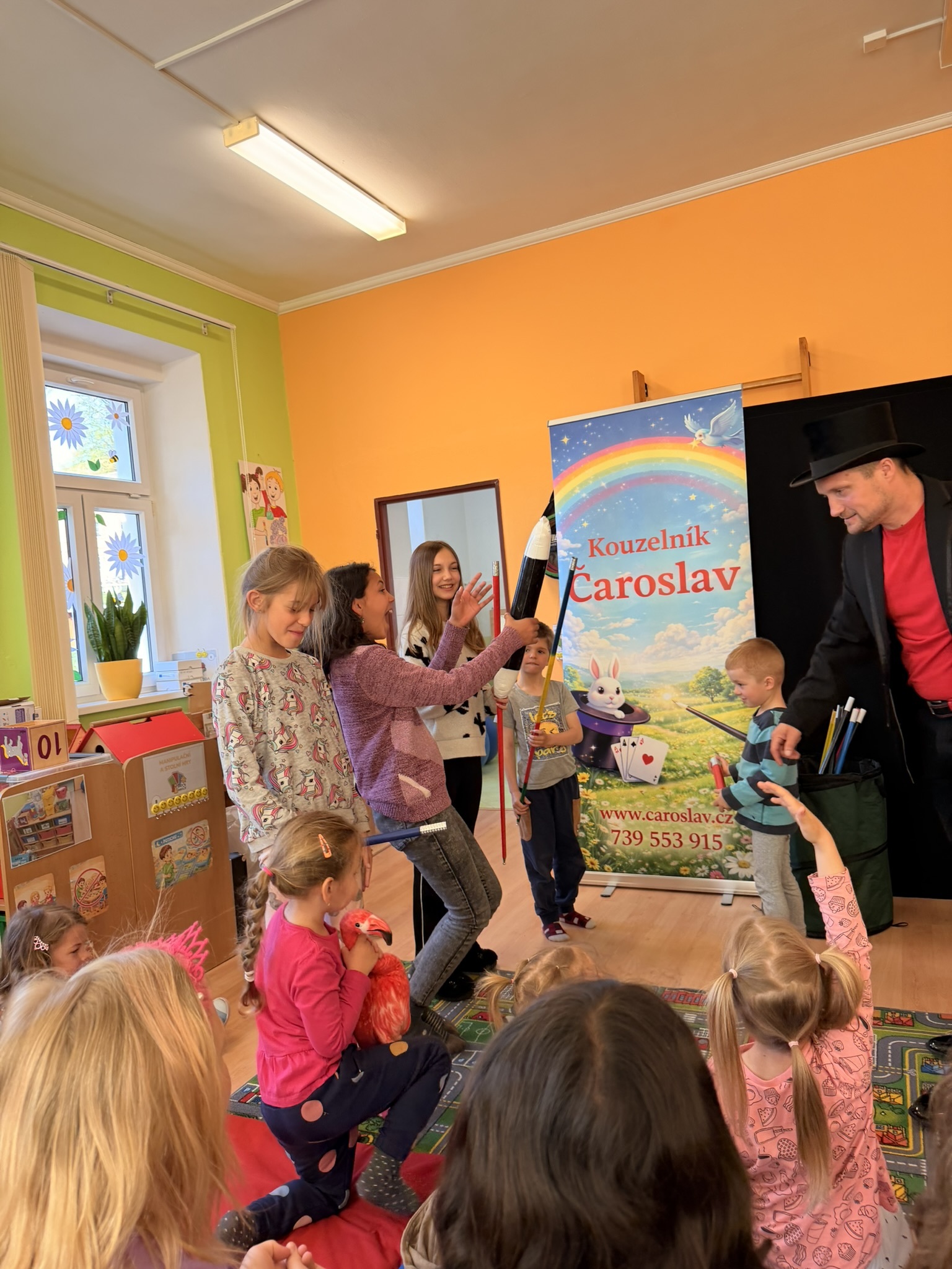 Dnešní den nám zpestřil svou návštěvou kouzelník Čaroslav, který si získal pozornost dětí hned v první minutě svého vystoupení. Od samého začátku bylo jasné, že nás čeká nezapomenutelná show plná překvapení, smíchu a úžasu.