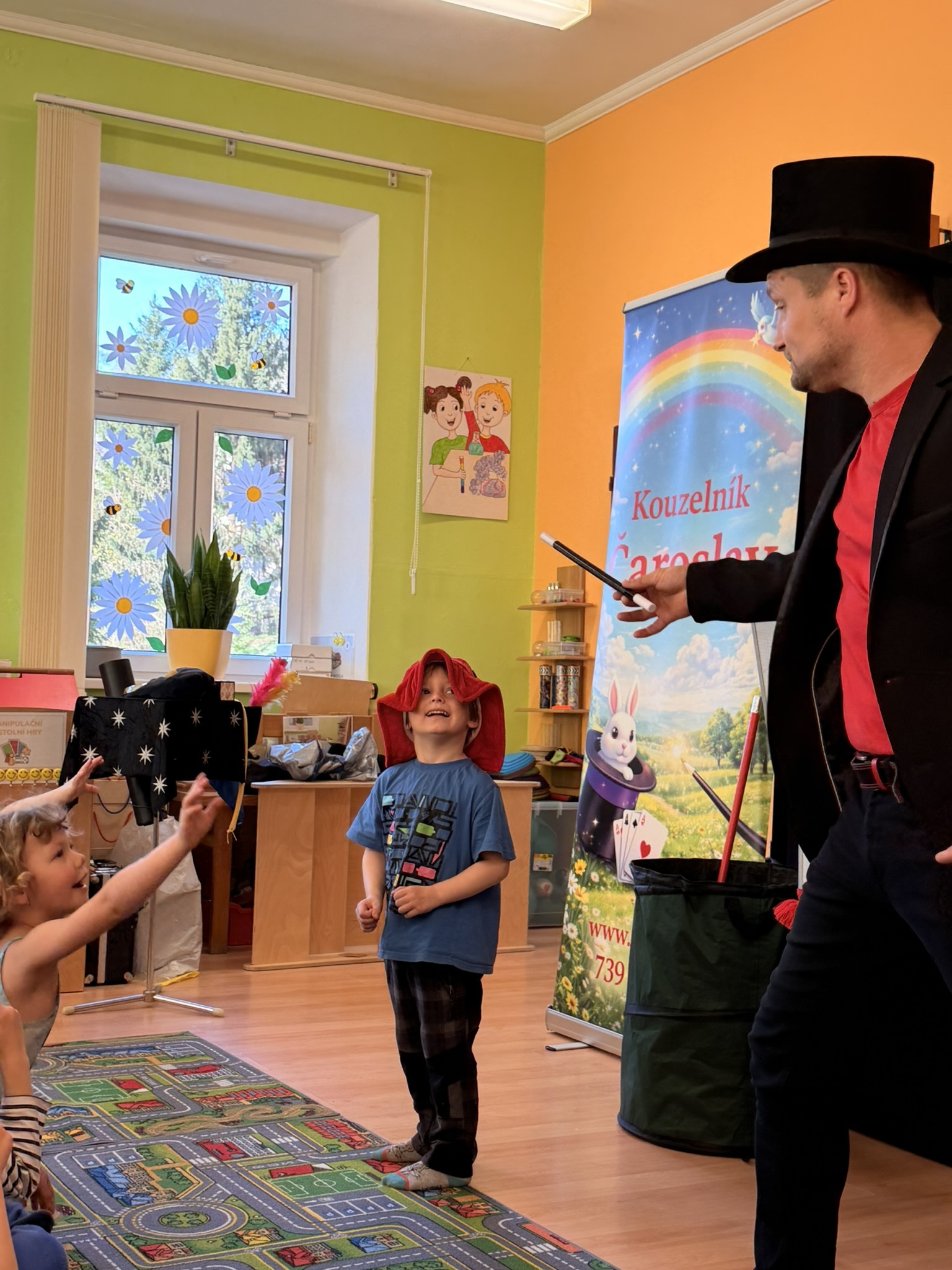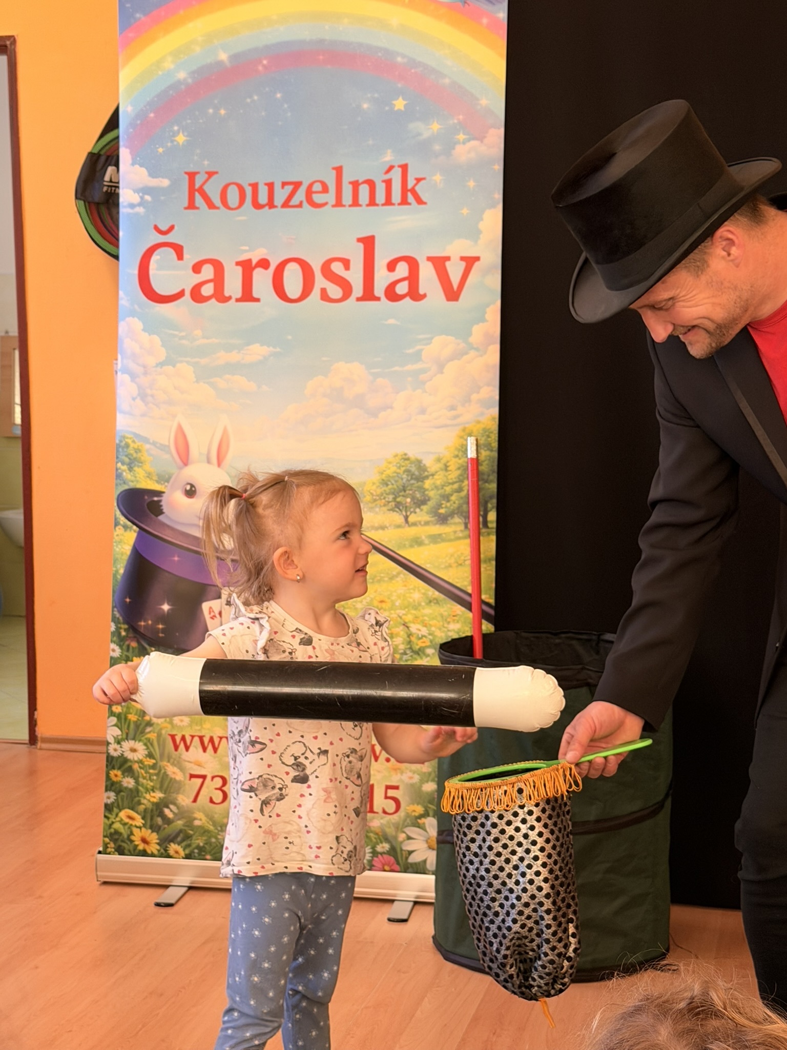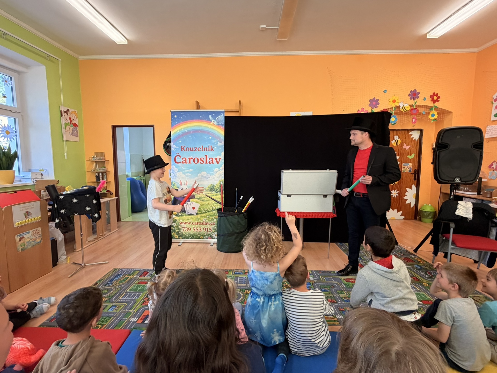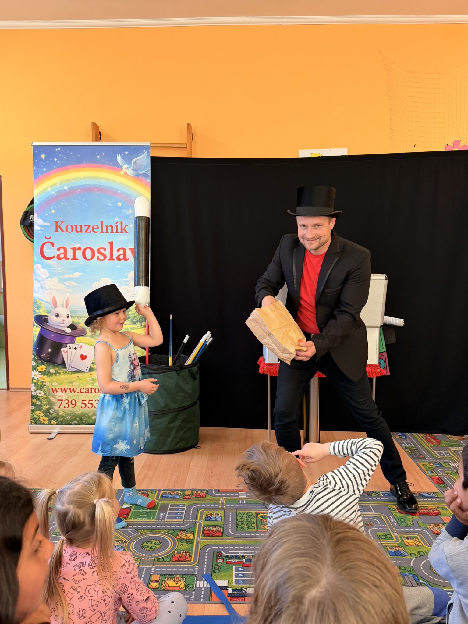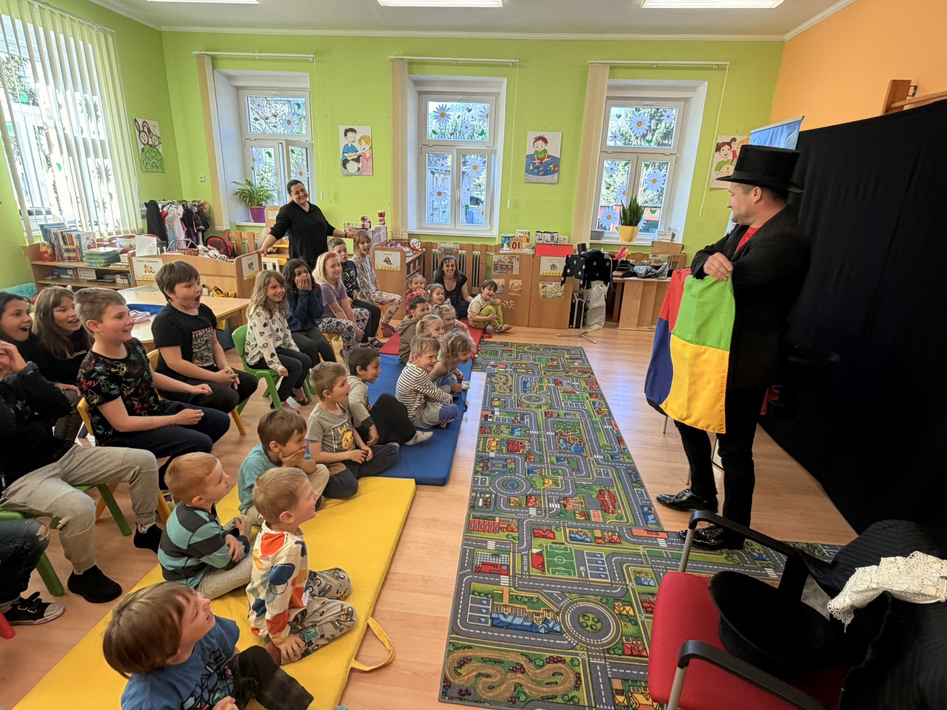 Dnešní den nám zpestřil svou návštěvou kouzelník Čaroslav, který si získal pozornost dětí hned v první minutě svého vystoupení. Od samého začátku bylo jasné, že nás čeká nezapomenutelná show plná překvapení, smíchu a úžasu.