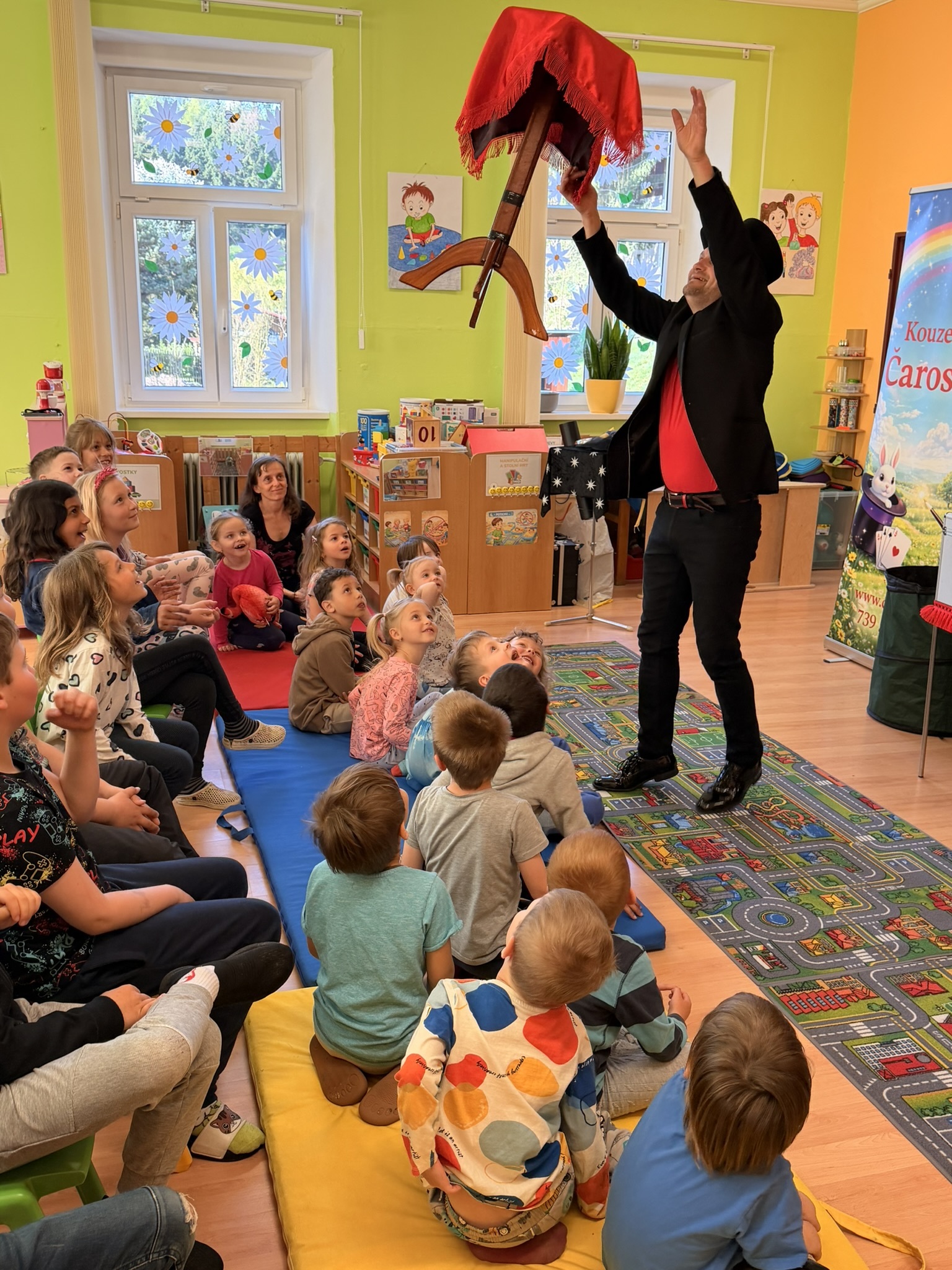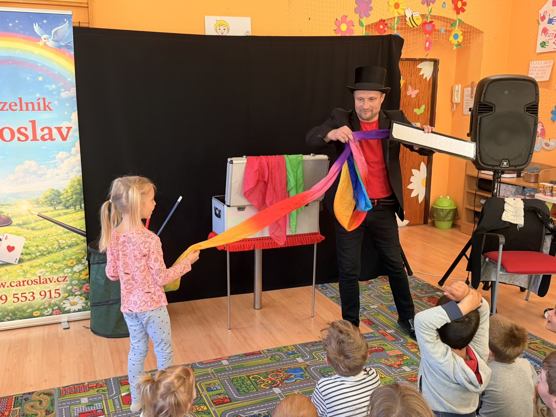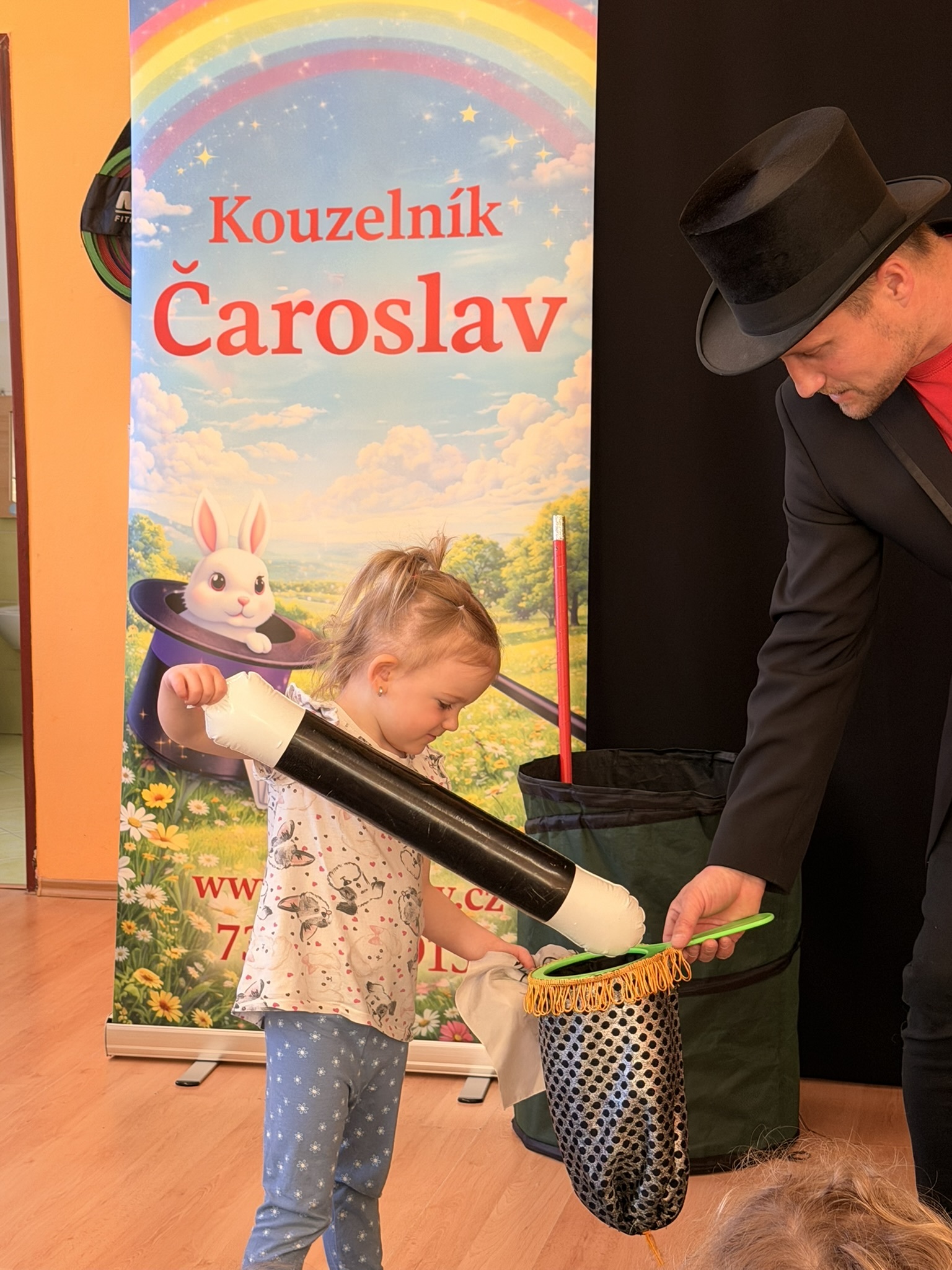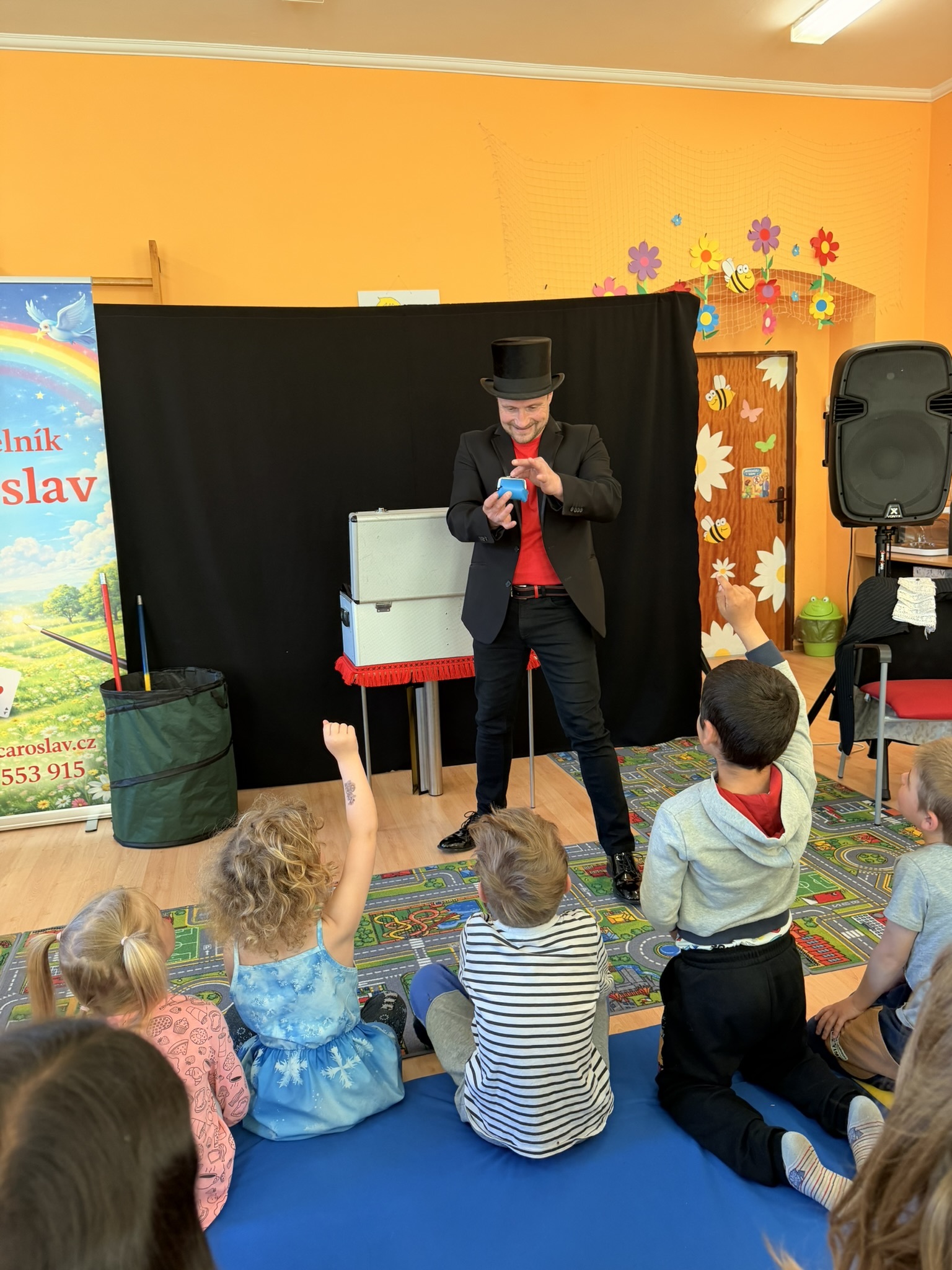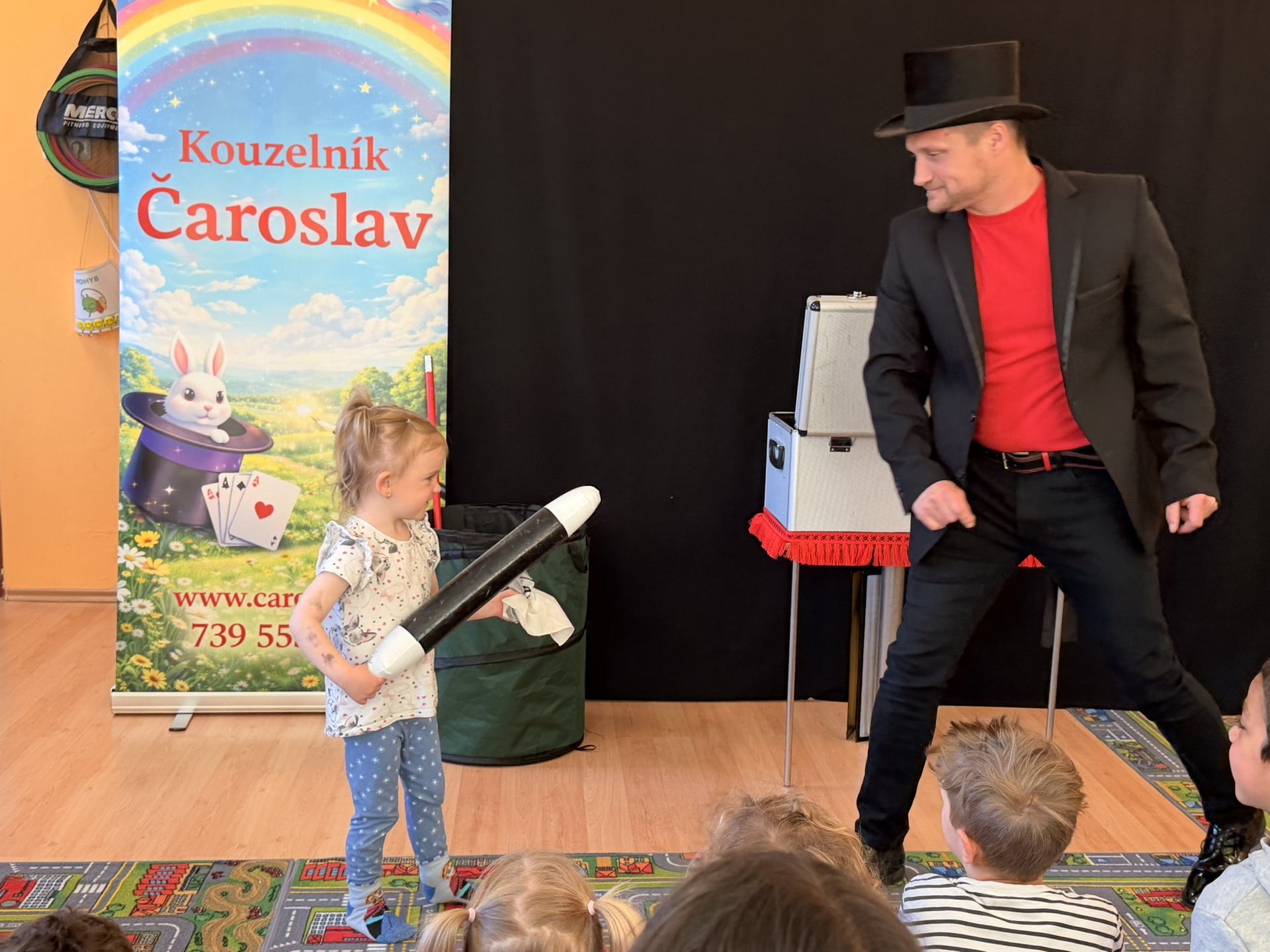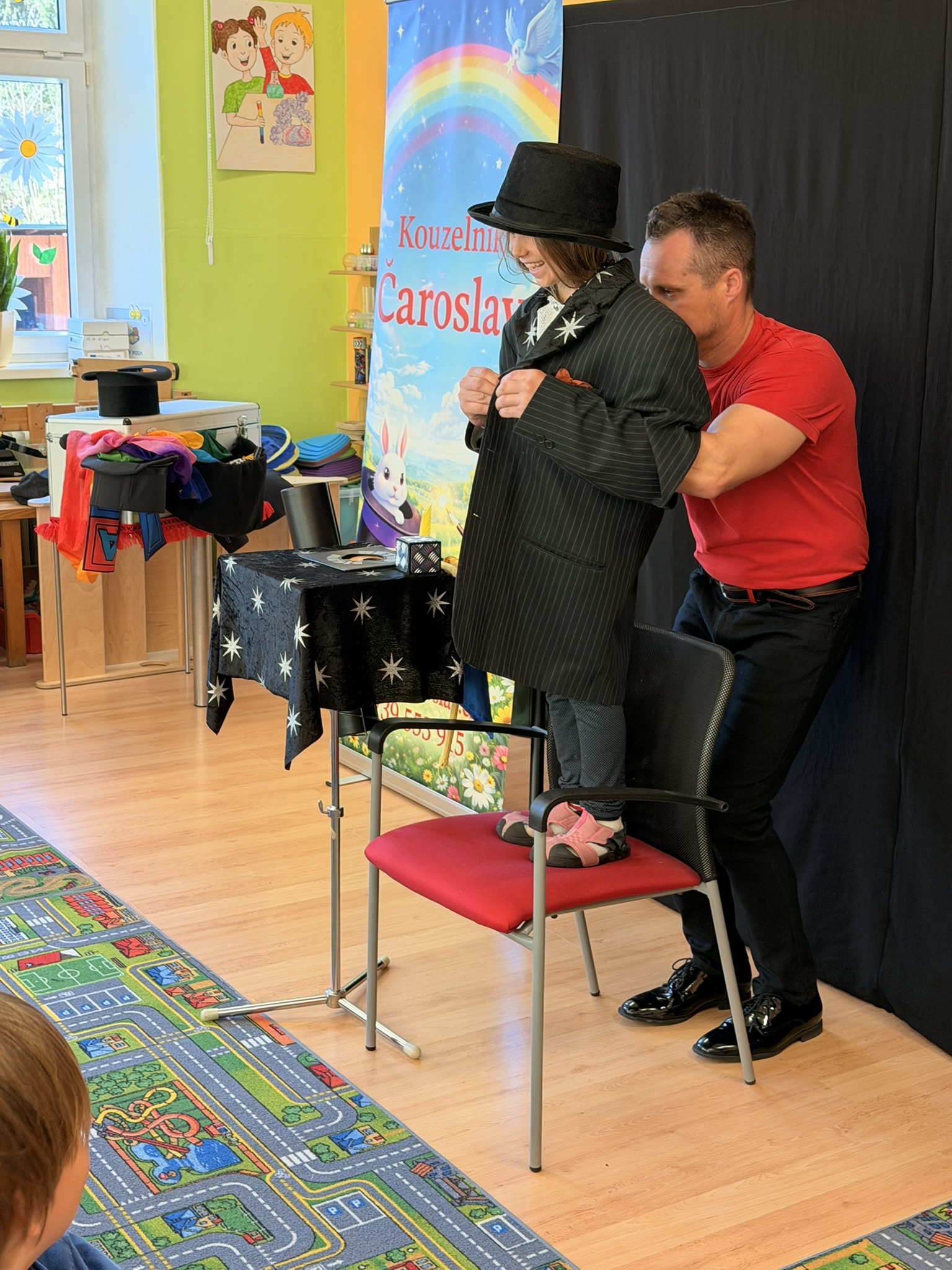 Dnešní den nám zpestřil svou návštěvou kouzelník Čaroslav, který si získal pozornost dětí hned v první minutě svého vystoupení. Od samého začátku bylo jasné, že nás čeká nezapomenutelná show plná překvapení, smíchu a úžasu.