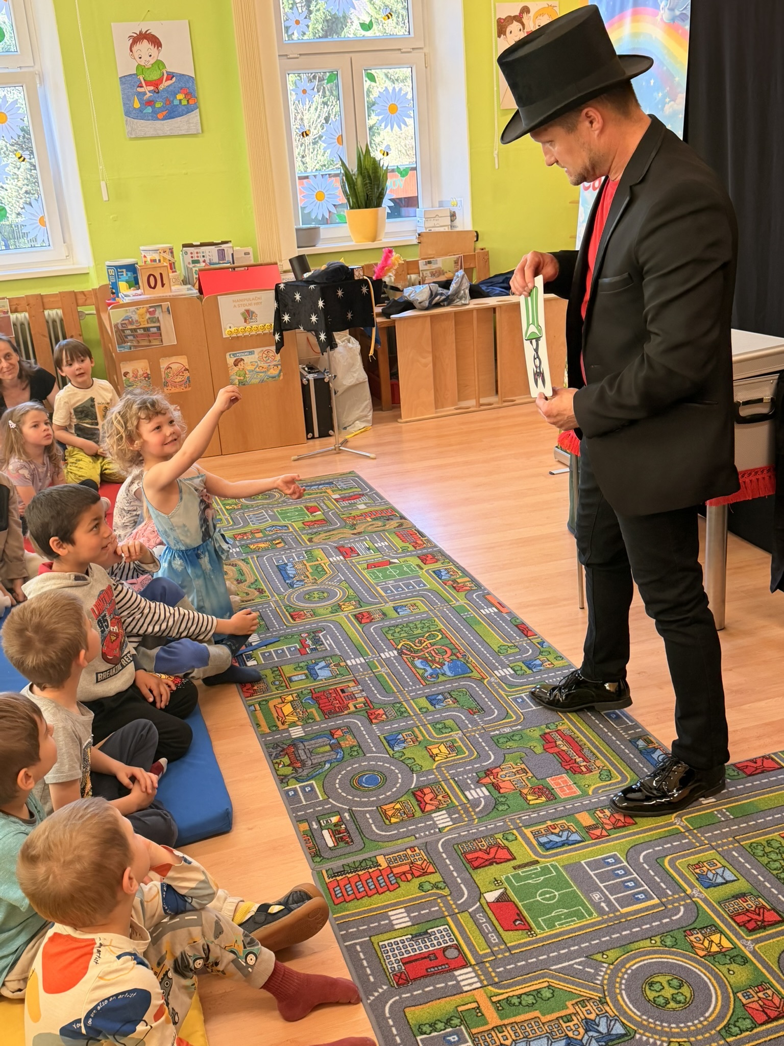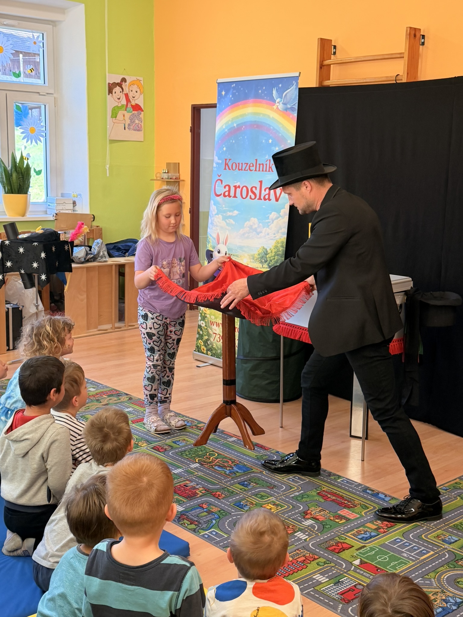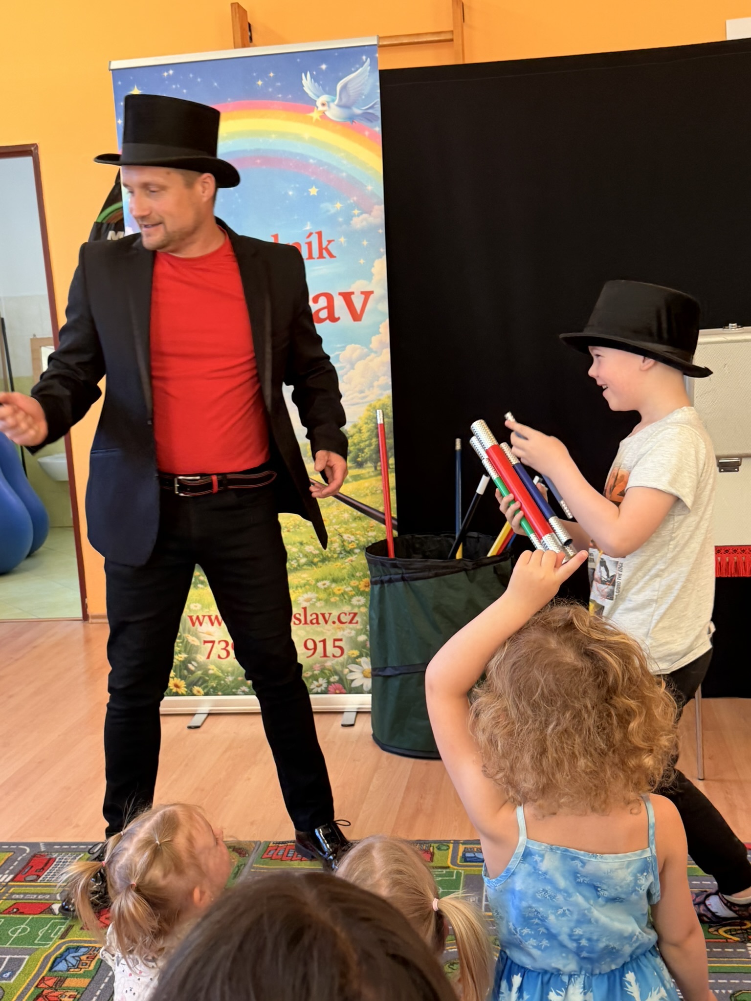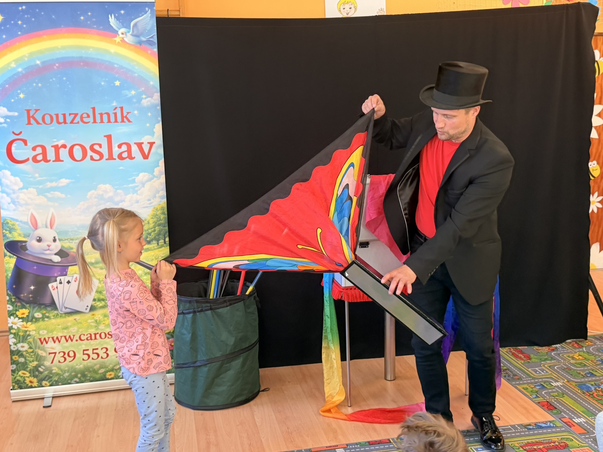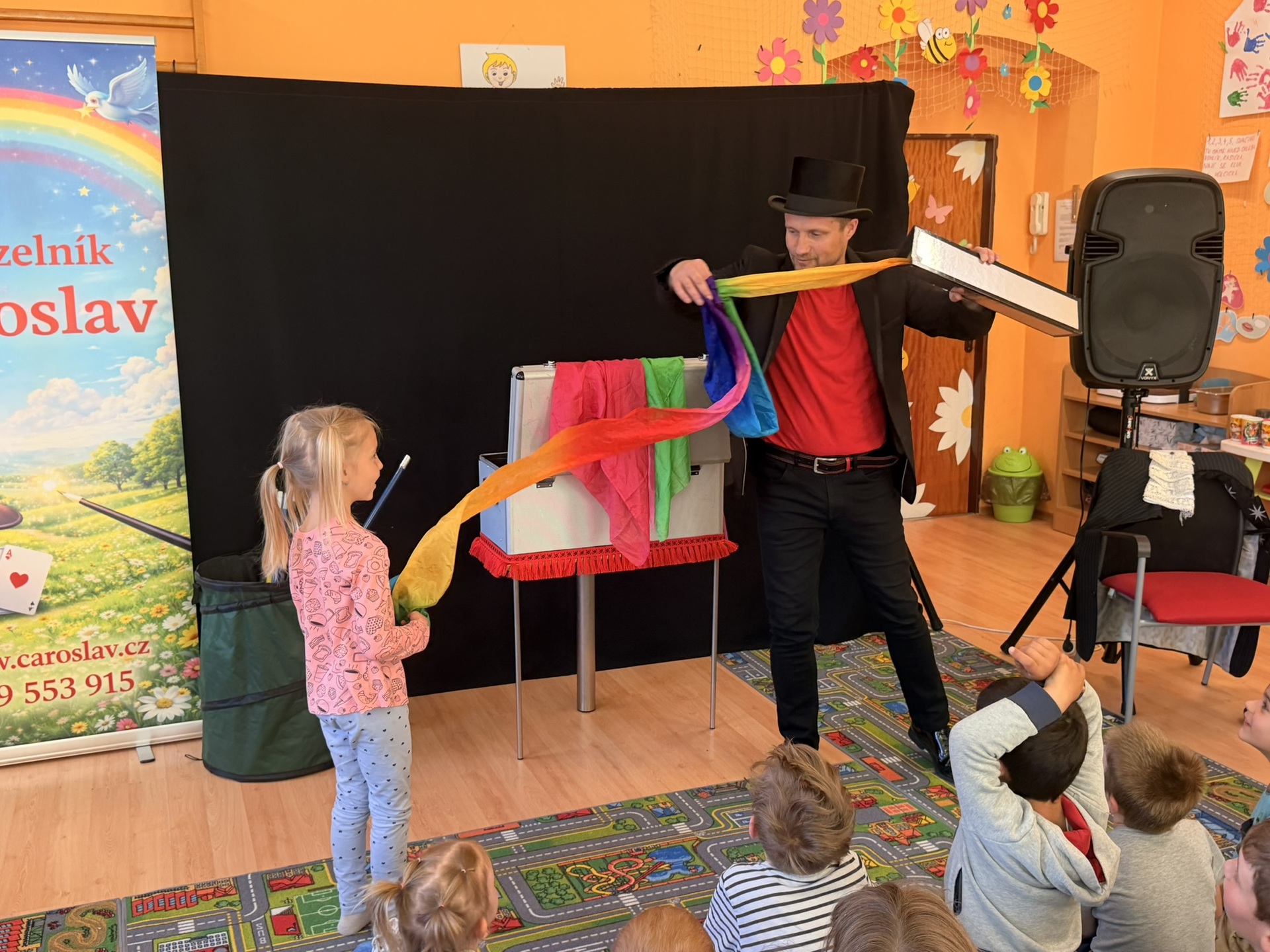 Dnešní den nám zpestřil svou návštěvou kouzelník Čaroslav, který si získal pozornost dětí hned v první minutě svého vystoupení. Od samého začátku bylo jasné, že nás čeká nezapomenutelná show plná překvapení, smíchu a úžasu.