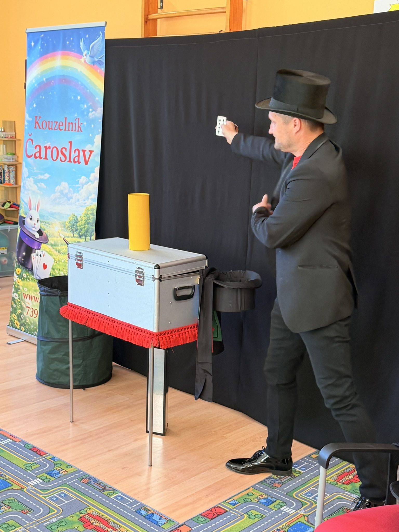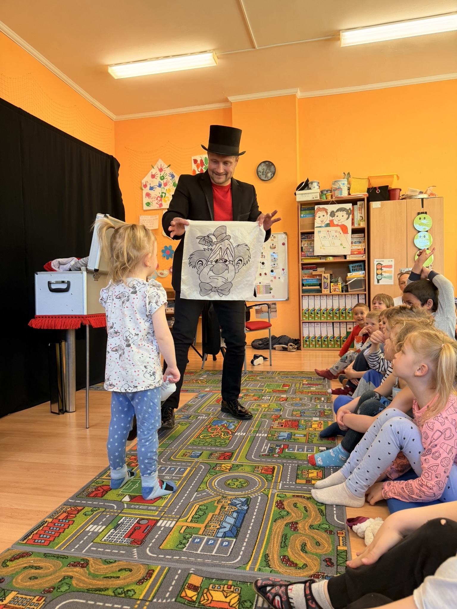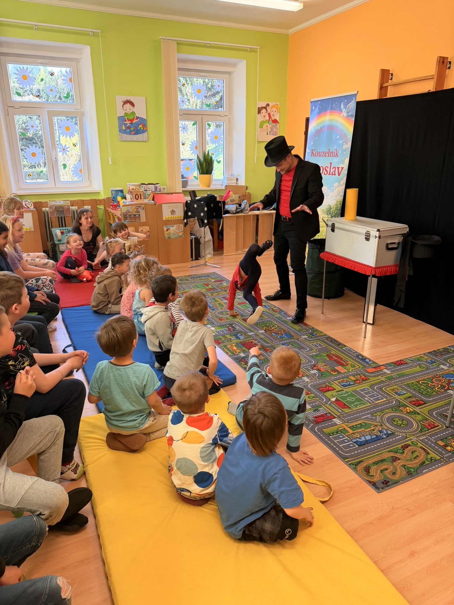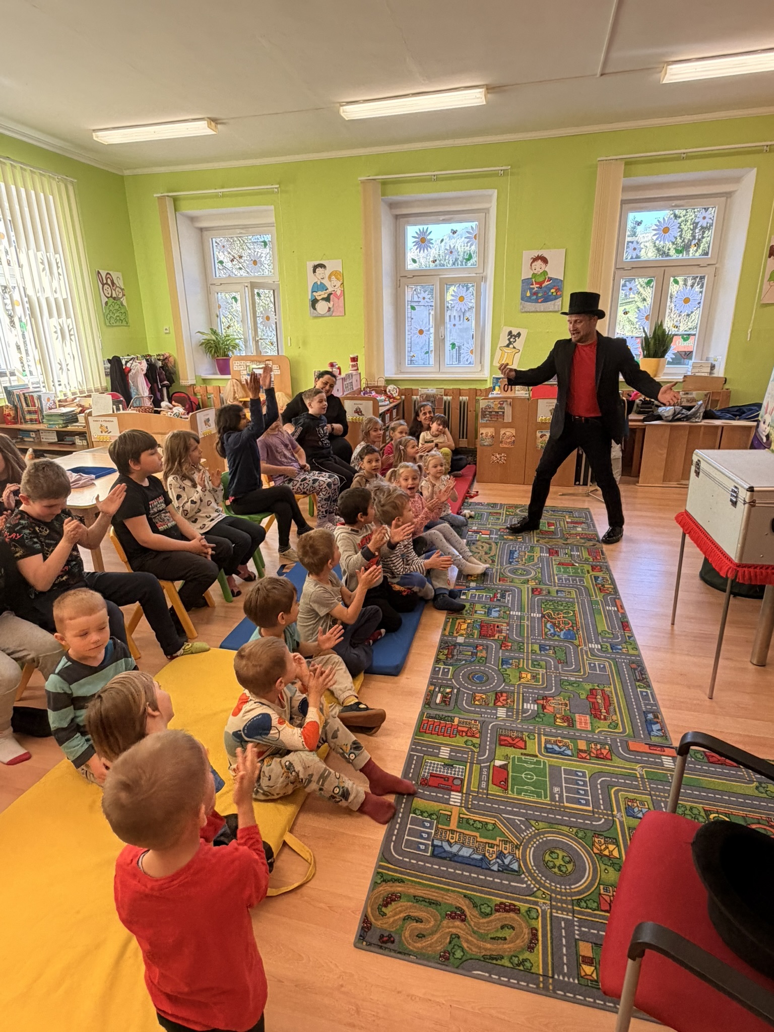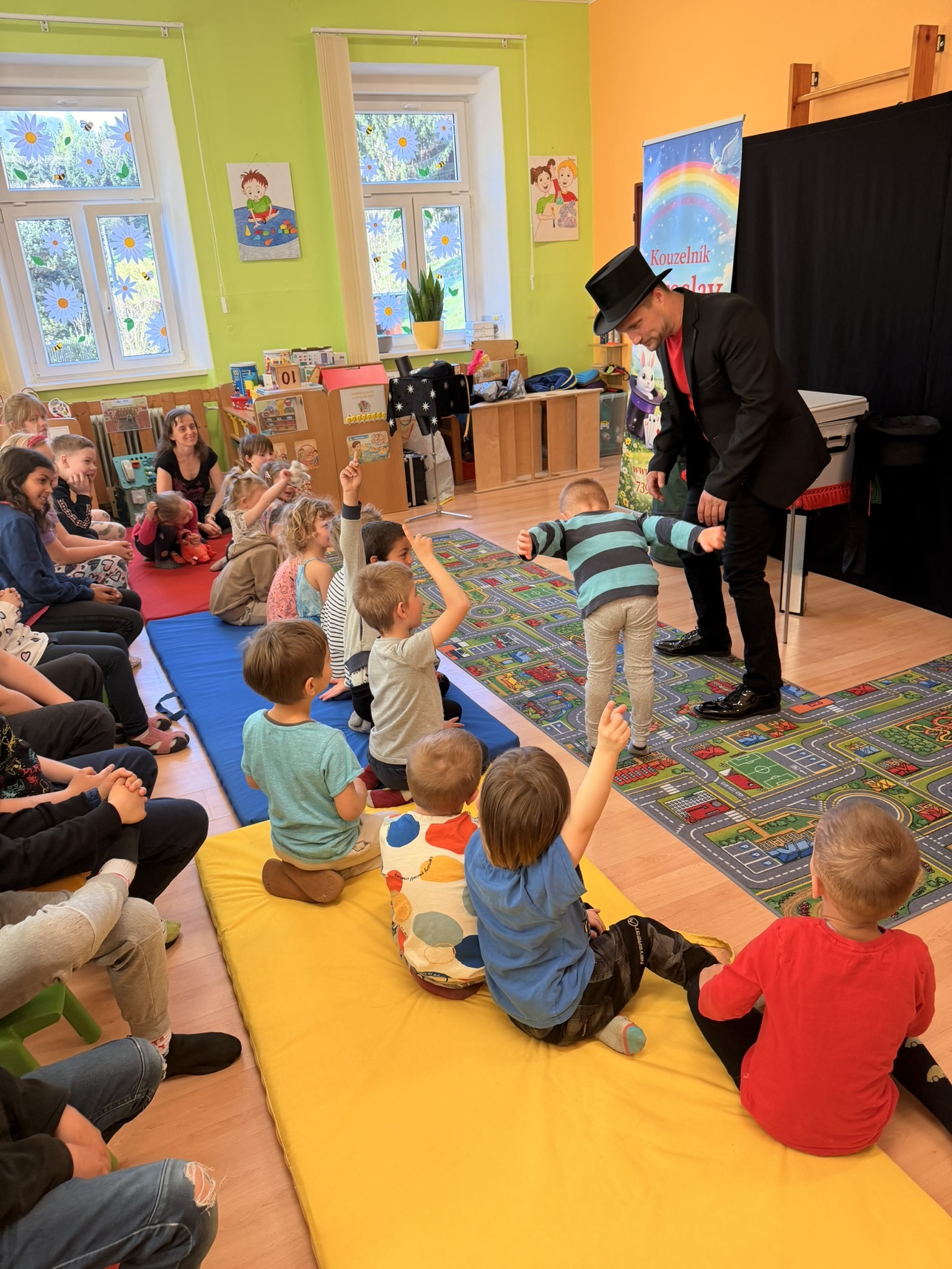 Dnešní den nám zpestřil svou návštěvou kouzelník Čaroslav, který si získal pozornost dětí hned v první minutě svého vystoupení. Od samého začátku bylo jasné, že nás čeká nezapomenutelná show plná překvapení, smíchu a úžasu.