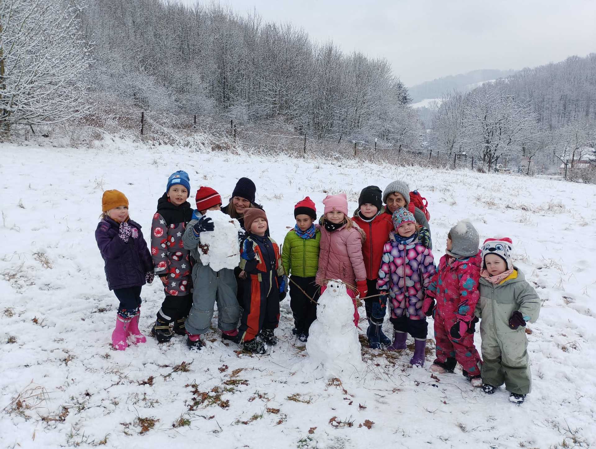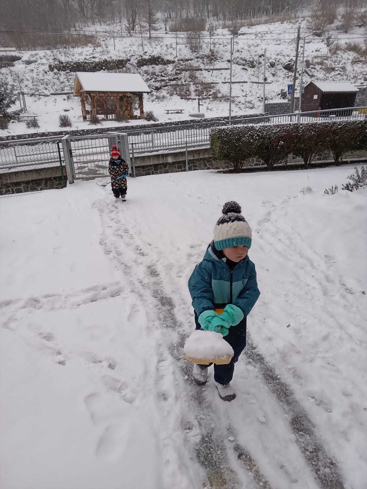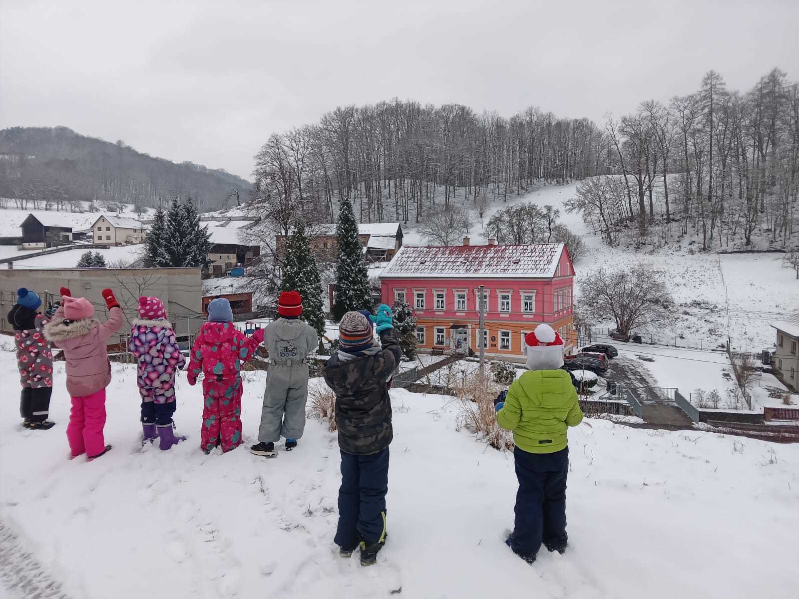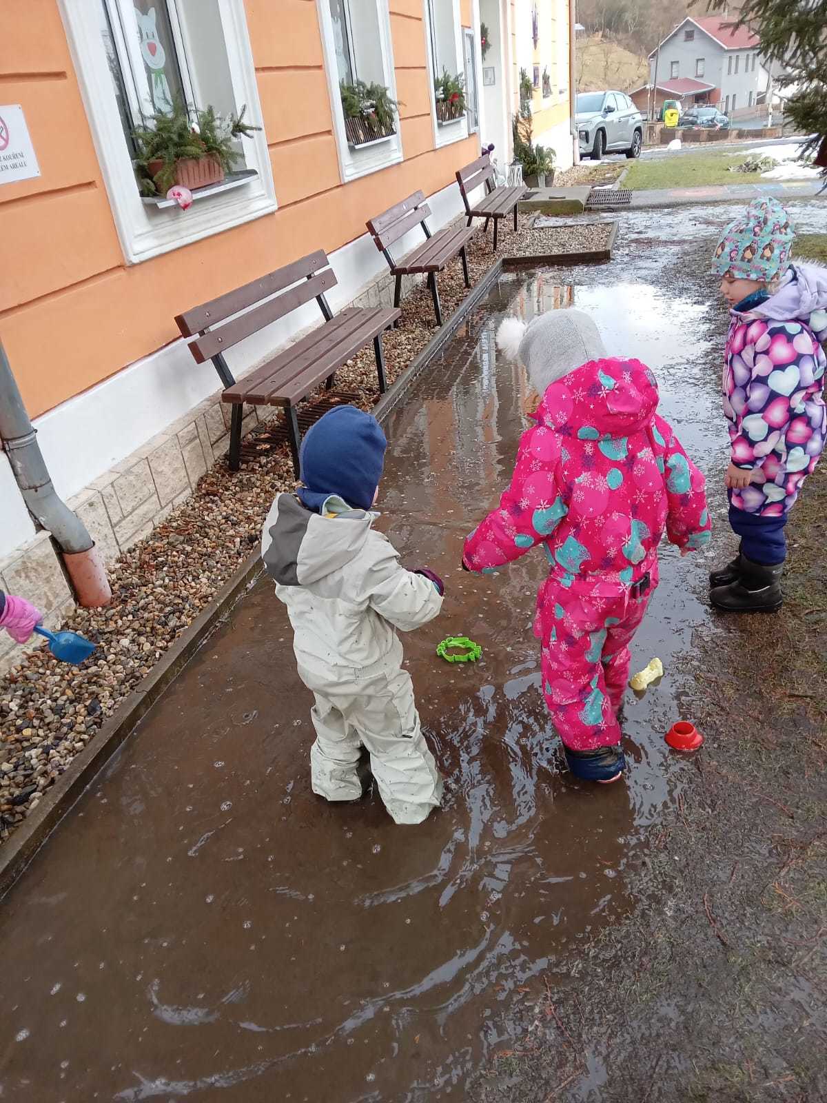 Poslední týden jsme sníh využili do poslední vločky! Každý den jsme trávili venku. Dokud sníh nebyl cvičili jsme s obručemi a míči, ale jakmile napadl, vytáhli jsme ježdíky. Pomáhali jsme odklízet sníh z cesty a ze zmrzlých kusů ledu a sněhu jsme na zahradě postavili celou „Eskymáckou vesnici“. Sníh pro nás byl i příležitost k pokusům. Barvili jsme ho vodovkami a sledovali, jak se barva vpíjí. Zkoumali jsme, kolik vody zbude ve sklenicích, když sníh roztaje. Když venku opravdu mrzlo, pomocí barvy, vody a balónků jsme si vytvořili barevná, ledová vejce. Naopak, když sníh začal tát vzniklo nám na zahradě velké „moře“. Měřili jsme jeho hloubku, délku i šířku a zkoušeli jsme, které předměty plavou a které jdou ke dnu. Samozřejmě nesmělo chybět klasické stavění sněhuláků a koulovačky.