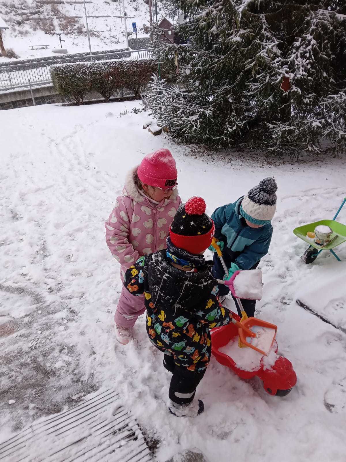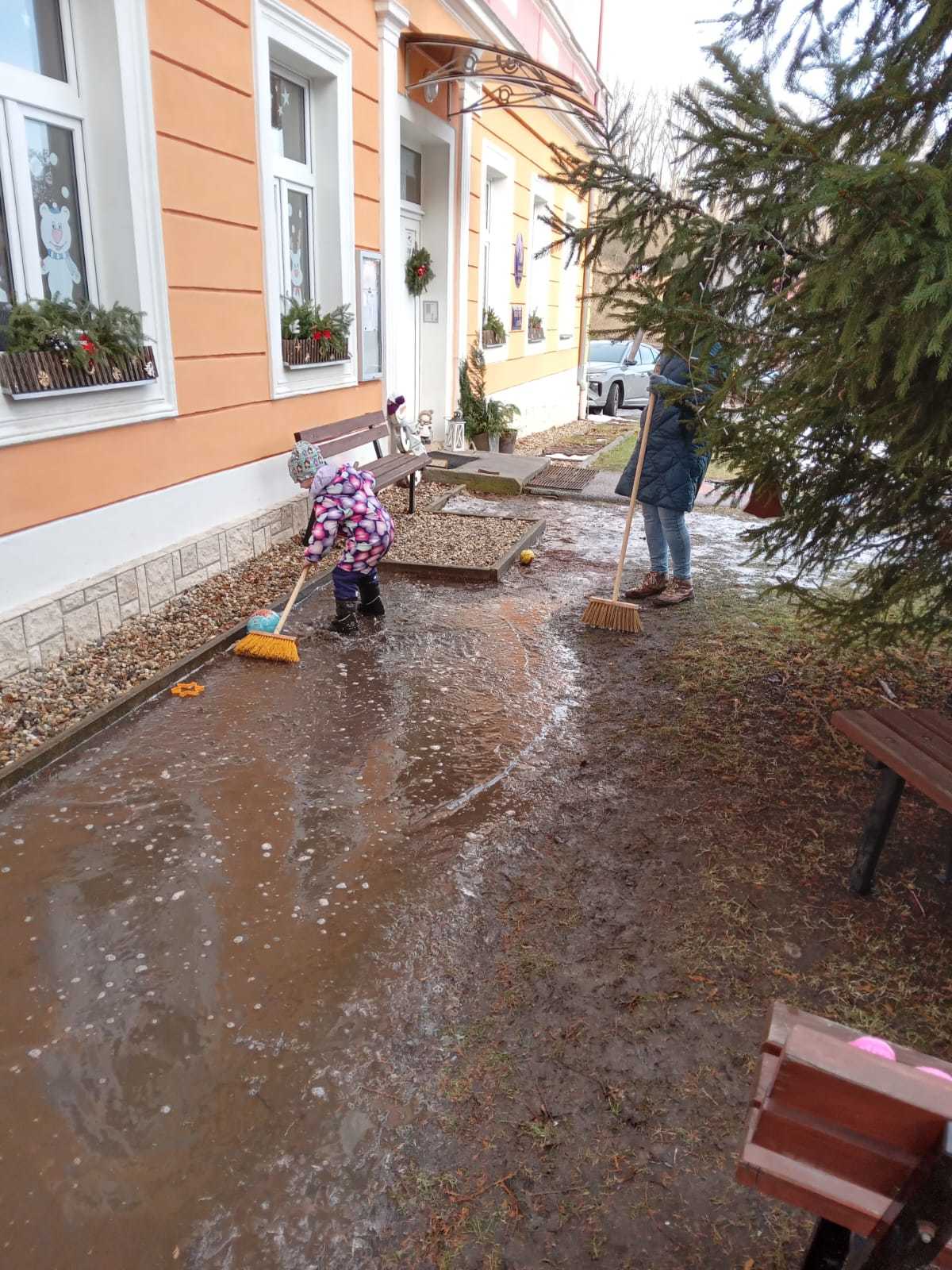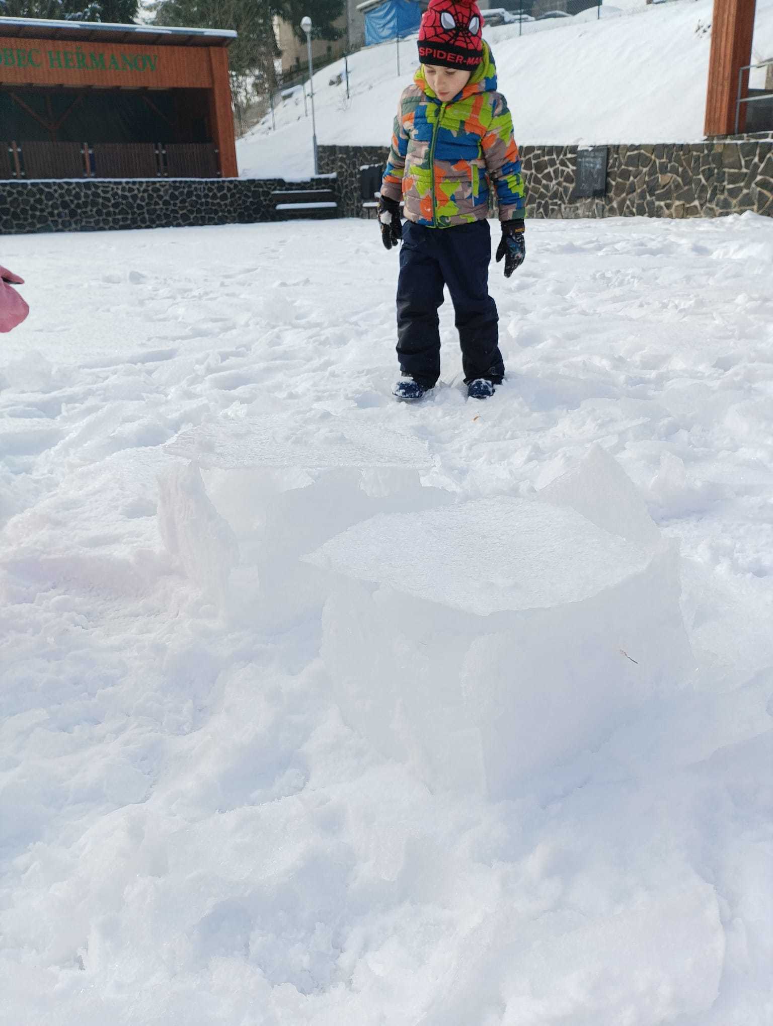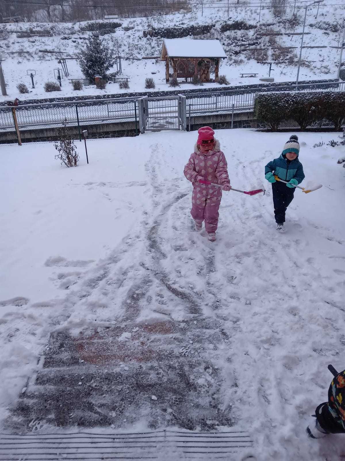 Poslední týden jsme sníh využili do poslední vločky! Každý den jsme trávili venku. Dokud sníh nebyl cvičili jsme s obručemi a míči, ale jakmile napadl, vytáhli jsme ježdíky. Pomáhali jsme odklízet sníh z cesty a ze zmrzlých kusů ledu a sněhu jsme na zahradě postavili celou „Eskymáckou vesnici“. Sníh pro nás byl i příležitost k pokusům. Barvili jsme ho vodovkami a sledovali, jak se barva vpíjí. Zkoumali jsme, kolik vody zbude ve sklenicích, když sníh roztaje. Když venku opravdu mrzlo, pomocí barvy, vody a balónků jsme si vytvořili barevná, ledová vejce. Naopak, když sníh začal tát vzniklo nám na zahradě velké „moře“. Měřili jsme jeho hloubku, délku i šířku a zkoušeli jsme, které předměty plavou a které jdou ke dnu. Samozřejmě nesmělo chybět klasické stavění sněhuláků a koulovačky.