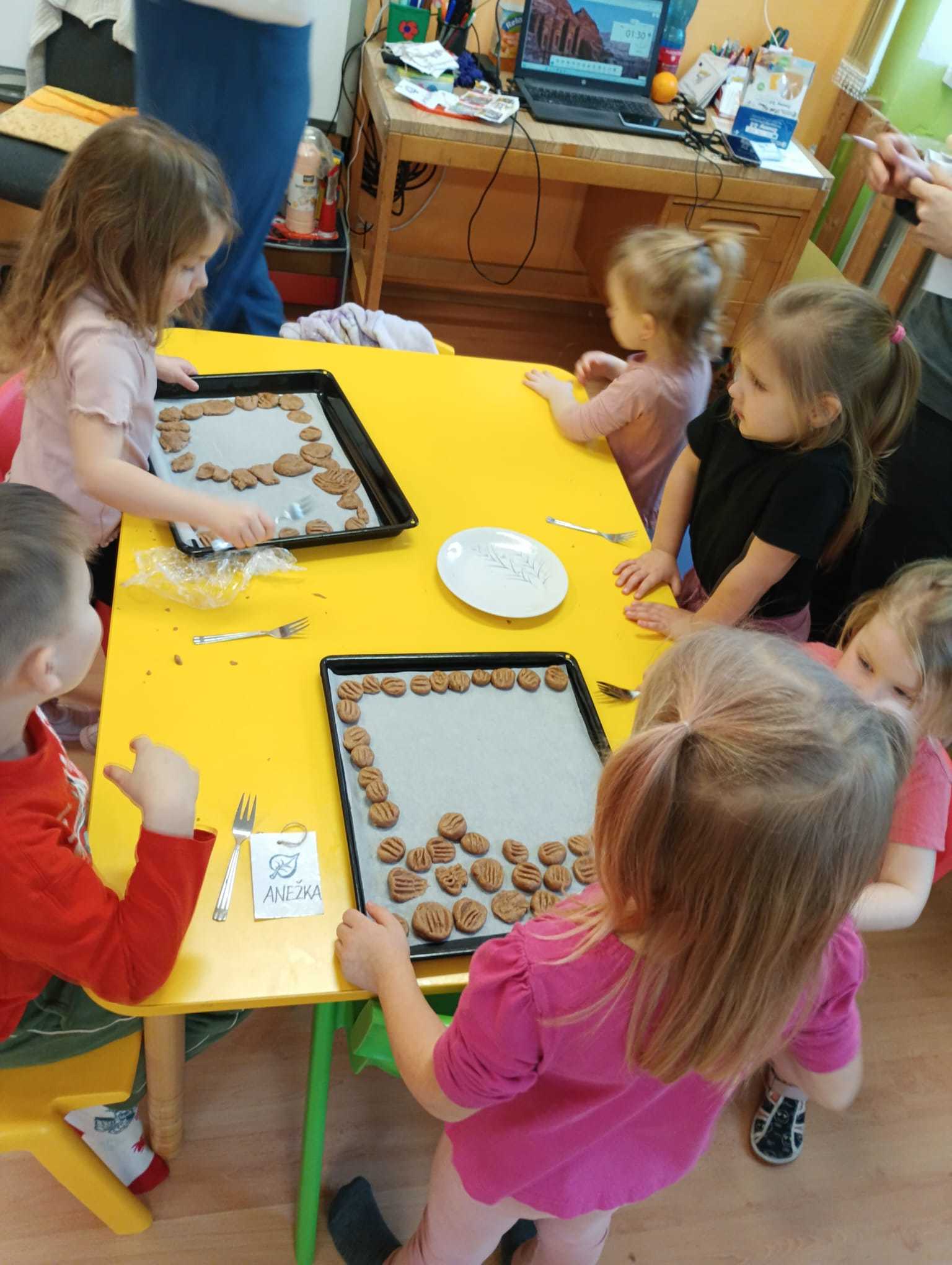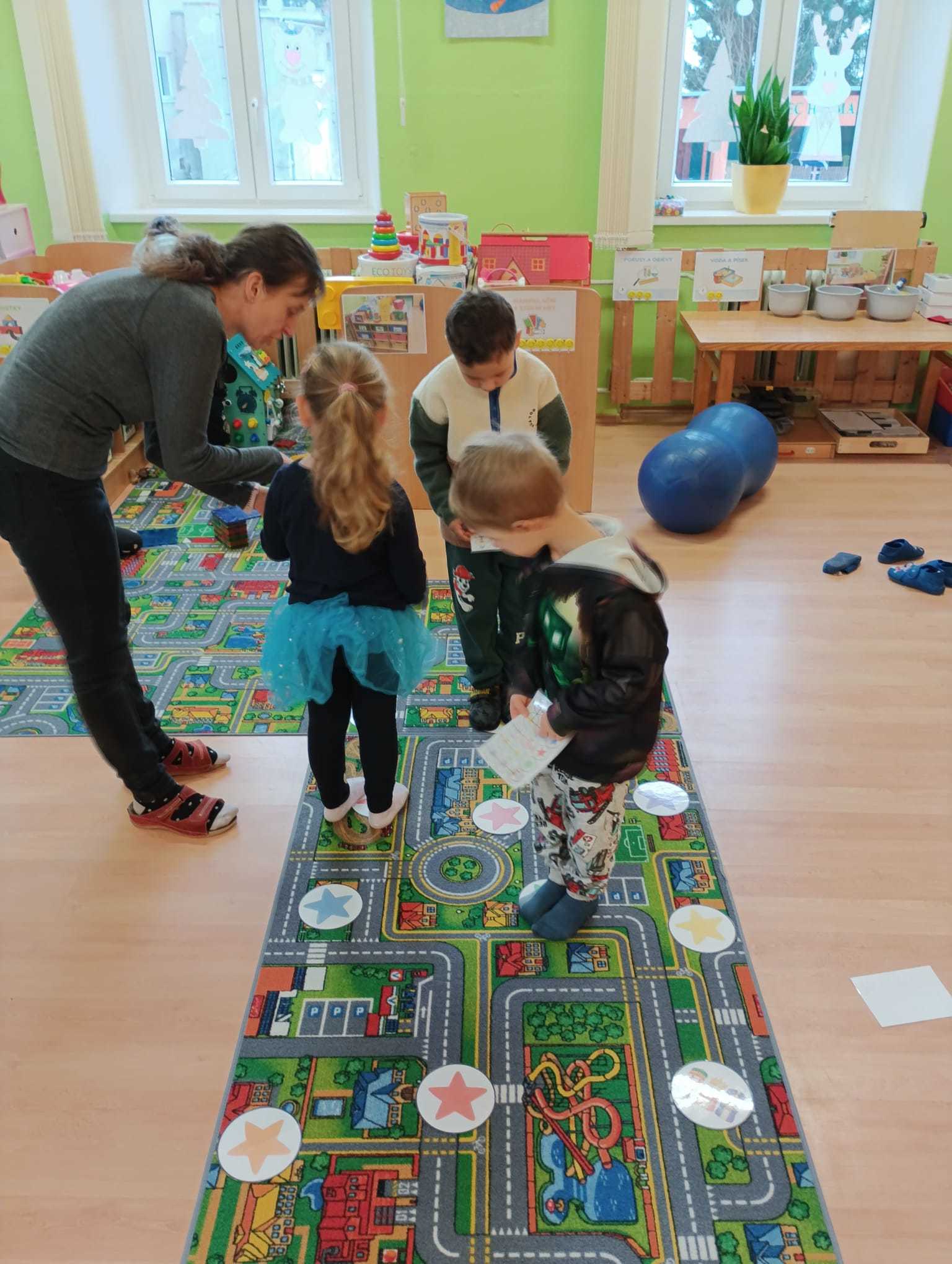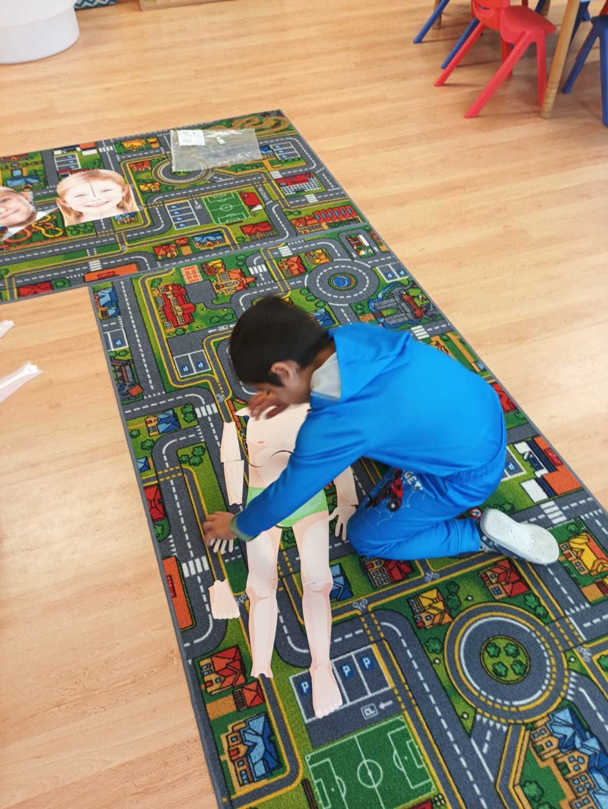 Další týdny patřili tématu „Naše tělo“. Začali jsme u emocí a smyslů, povídali jsme si o tom, jak se cítíme a zapojili jsme všechny smysly. Uvařili jsme si horký štrůdl, ta vůně skořice a chuť jablek nám pomohla pochopit, jak funguje čich a chuť. V centrech pokusy a objevy a knihy a písmena jsme zkoumali encyklopedie a různé obrázky, už víme, k čemu máme kostru, jak pracují svaly a kde máme srdce nebo plíce. V centrech ateliér a manipulace jsme modelovali obličeje, skládali postavy z různých materiálů, a dokonce tvořili maketu lidského těla. Učili jsme se názvy částí těla i to, jak se o sebe starat, abychom byli zdraví. Vysvětlili jsme si, co jsou to bacily a jak se šíří, v ateliéru jsme si tyto „potvůrky“ namalovali, abychom se jich nebáli, ale věděli, jak je porazit – mýdlem, vitamíny a čerstvým vzduchem. Povídali jsme si také o úrazech a první pomoci, abychom věděli, jak se zachovat, když se kamarádovi něco stane.