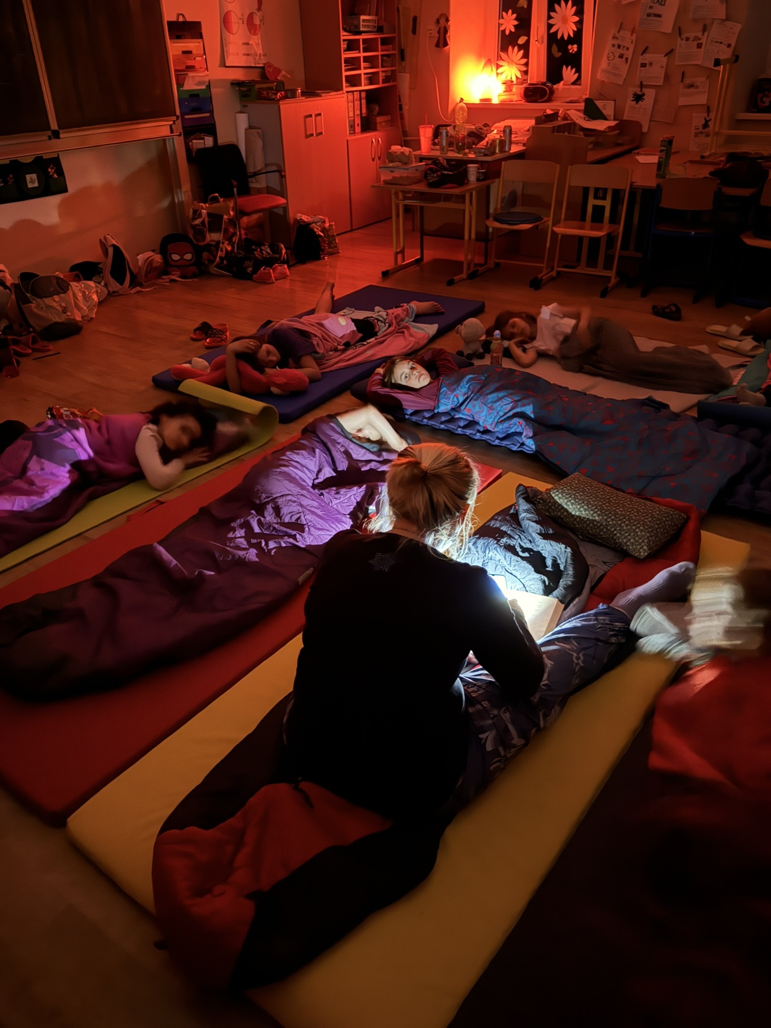 Po večerní hygieně jsme se všichni uvelebili do spacáků. Paní ředitelka dětem před spaním přečetla pohádku Cínový vojáček a navodila tak tu pravou pohádkovou atmosféru. Protože se nám ještě nechtělo spát, pustili jsme si také Děvčátko se sirkami a Císařovy nové šaty.