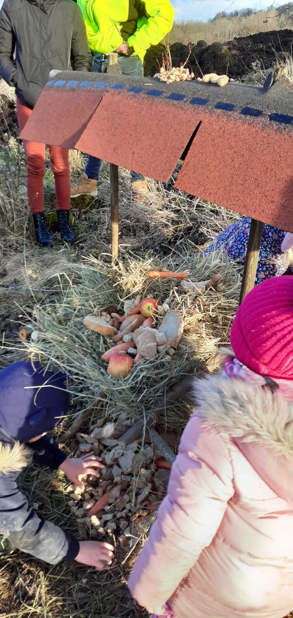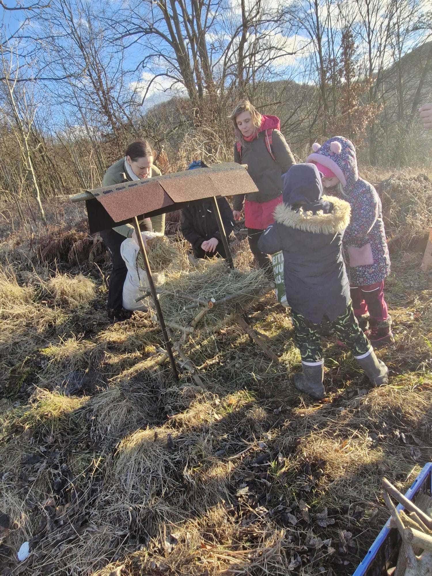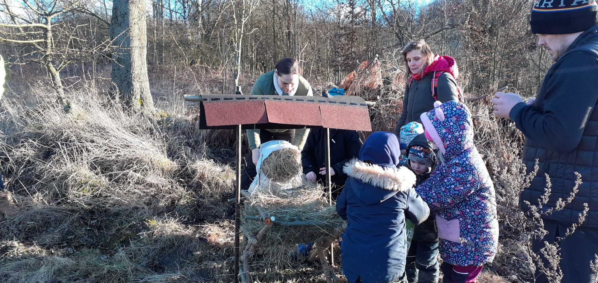 Děti si vyzkoušely řezání pilkou i zatloukání hřebíků, zatímco šikovní rodiče pomáhali s konstrukcí samotného krmelce, včetně stříšky. Po dokončení jsme krmelec naplnili jídlem pro zvěř, které děti s rodiči přinesli. Připravili jsme tak opravdovou hostinu pro lesní zvířátka, aby měla něco navíc do zásoby během zimních měsíců. Byly tam, oříšky pro veverky, jablka a mrkve pro zajíčky a seno pro srny a jeleny.