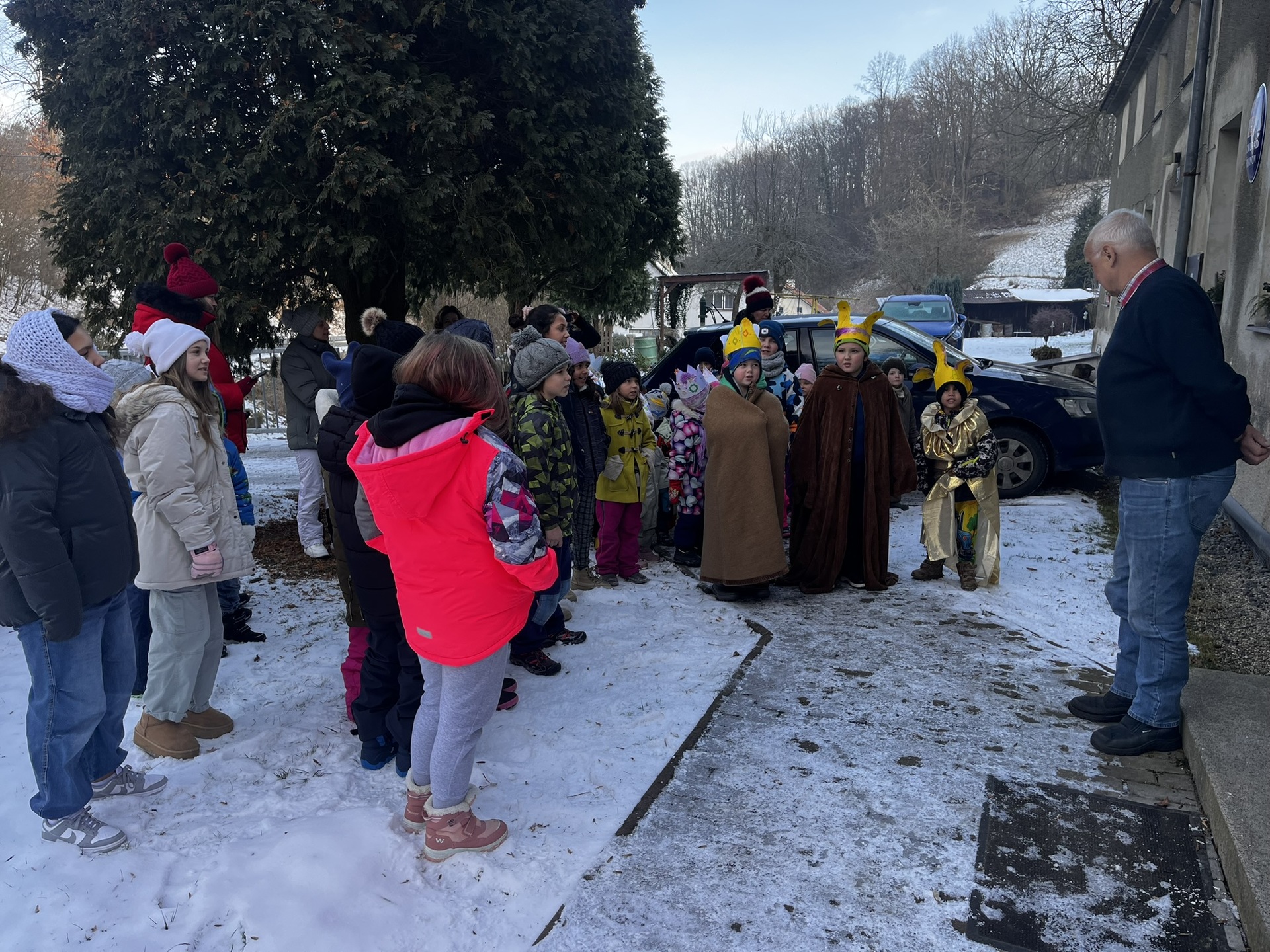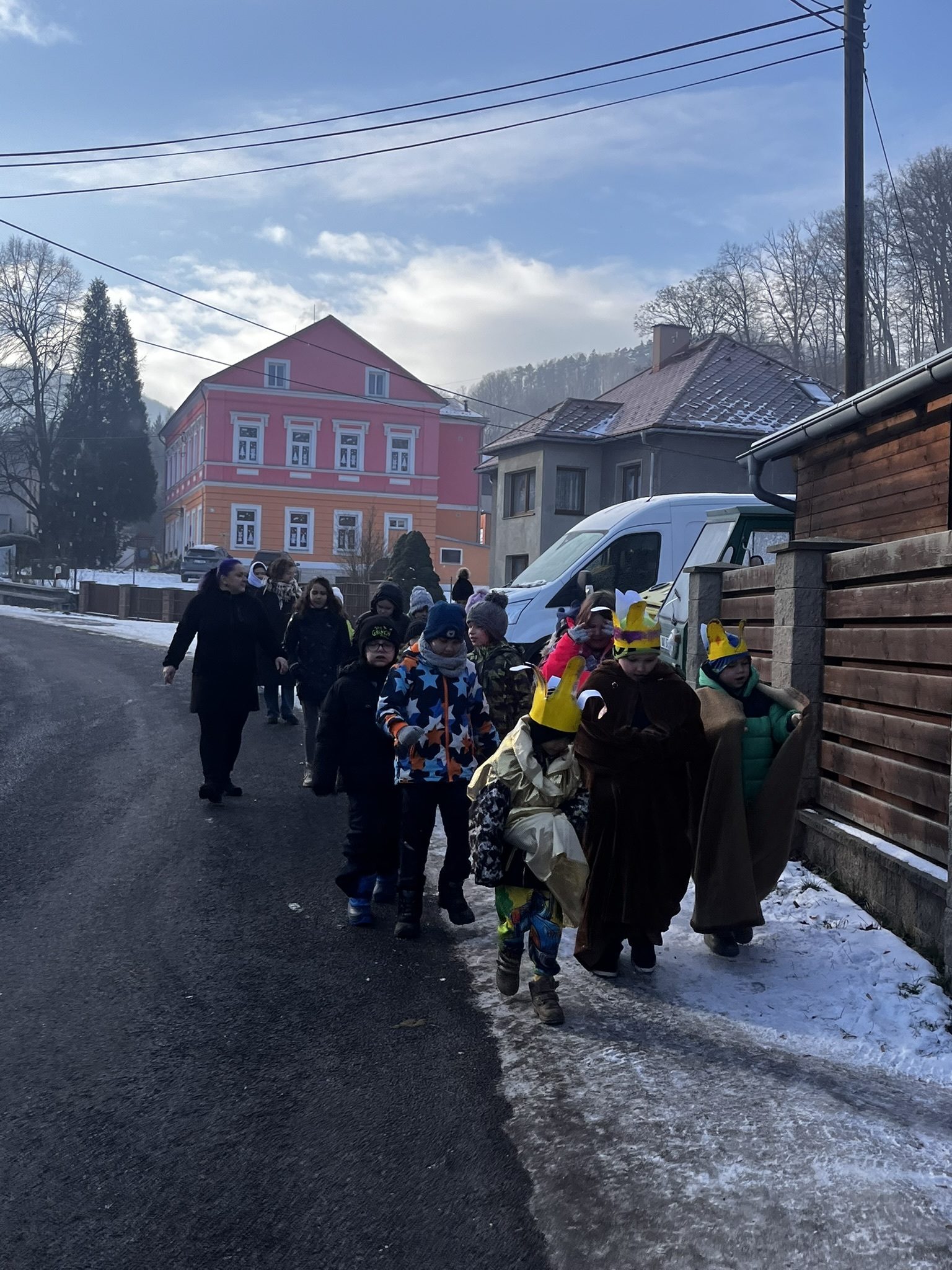 V úterý 6. ledna se děti z naší mateřské školy i základní školy vydaly na milou novoroční návštěvu k panu starostovi. Nešly samy – doprovod jim dělali také Tři králové, kteří celému setkání dodali pravou sváteční atmosféru.