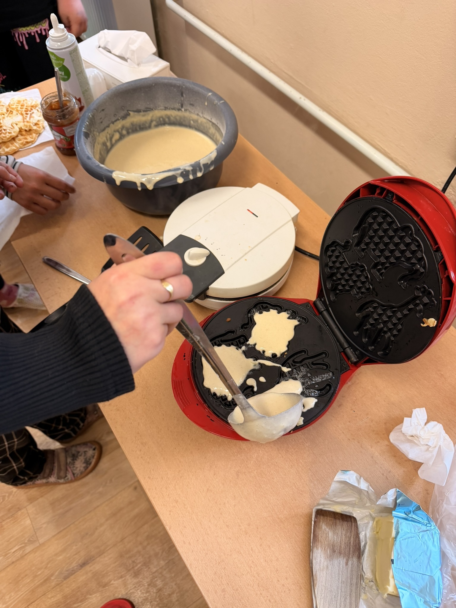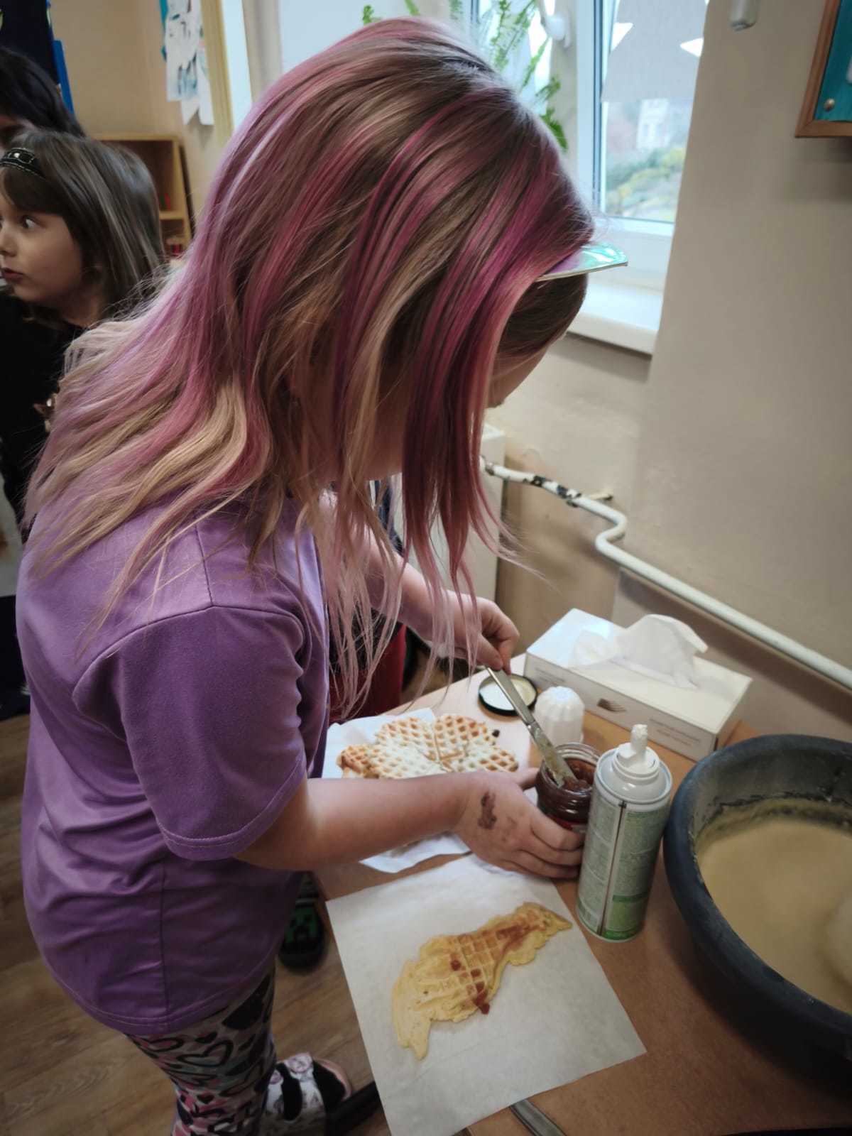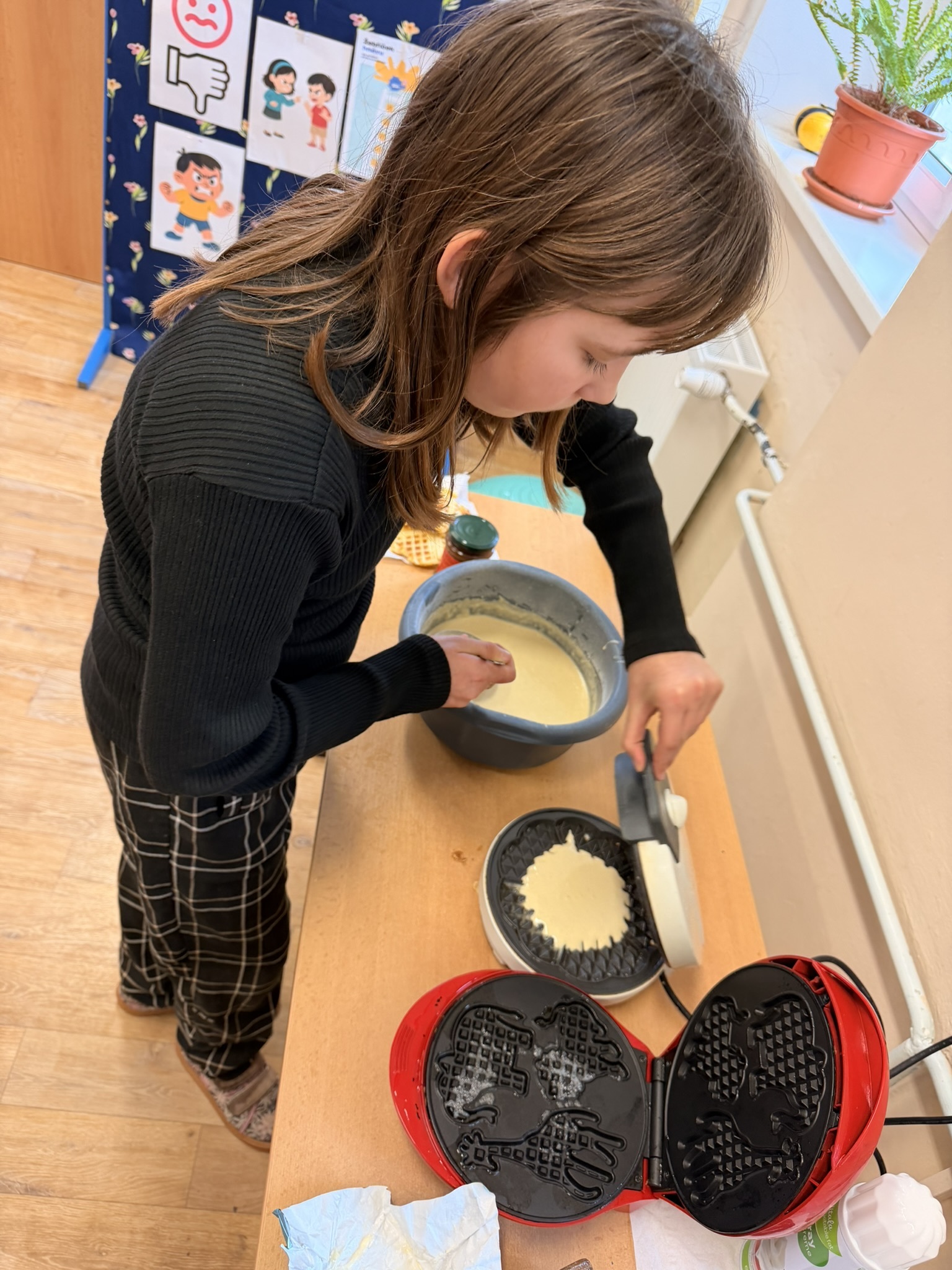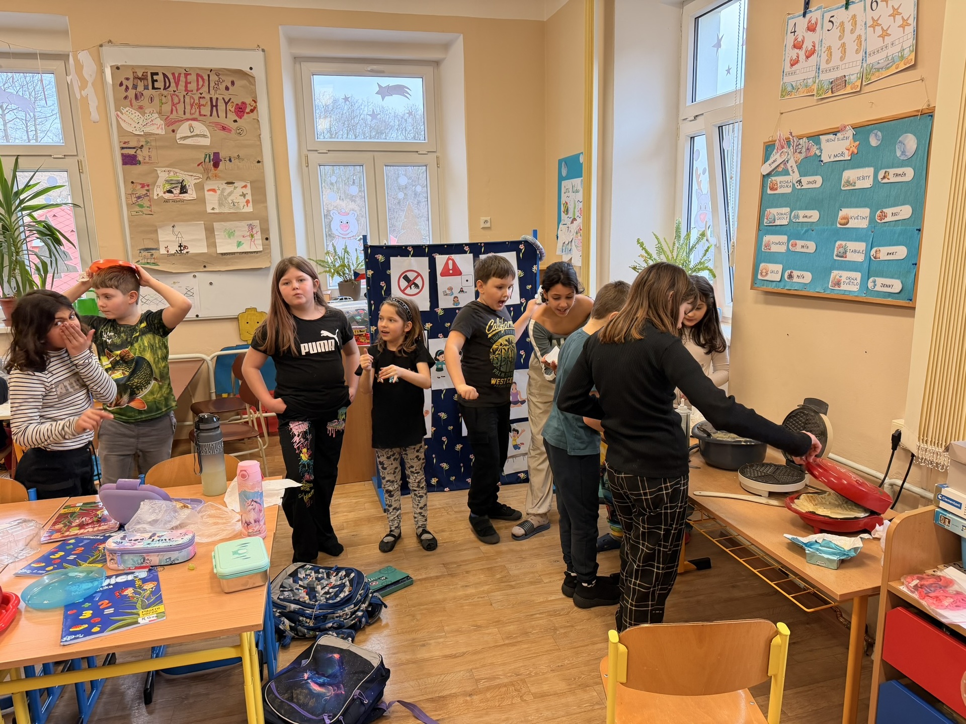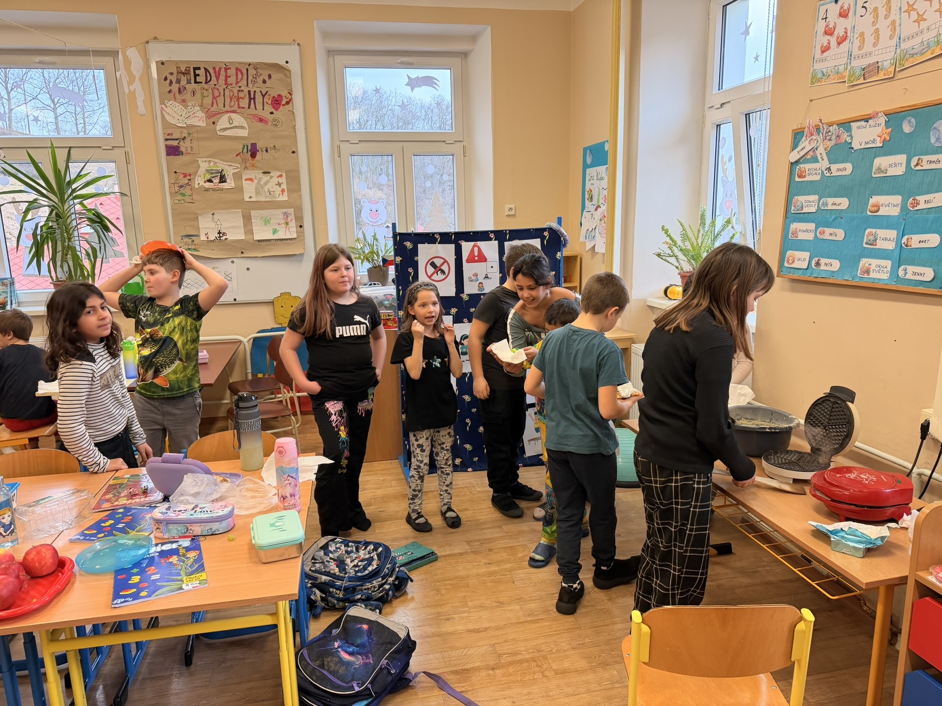 Celý týden jsme zakončili společnou tečkou – svačinou, kterou si žáci sami připravili. Ve třídě to vonělo po čerstvých waflích s marmeládou a křupavých toustech. Děti si rozdělily úkoly, spolupracovaly a s chutí si pak vychutnaly výsledek své práce.