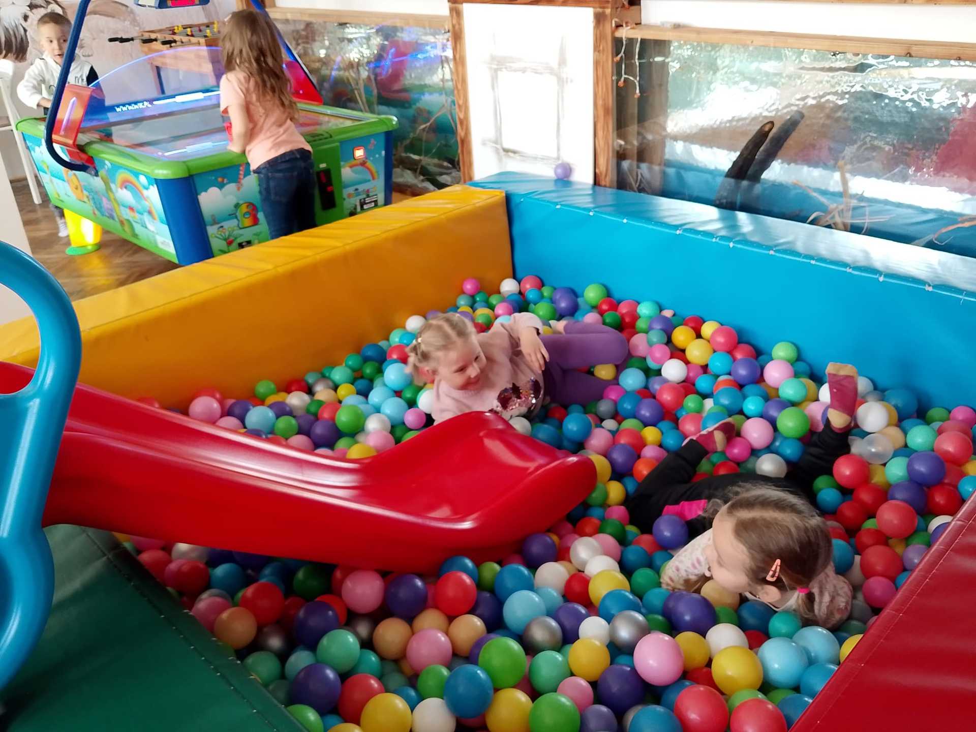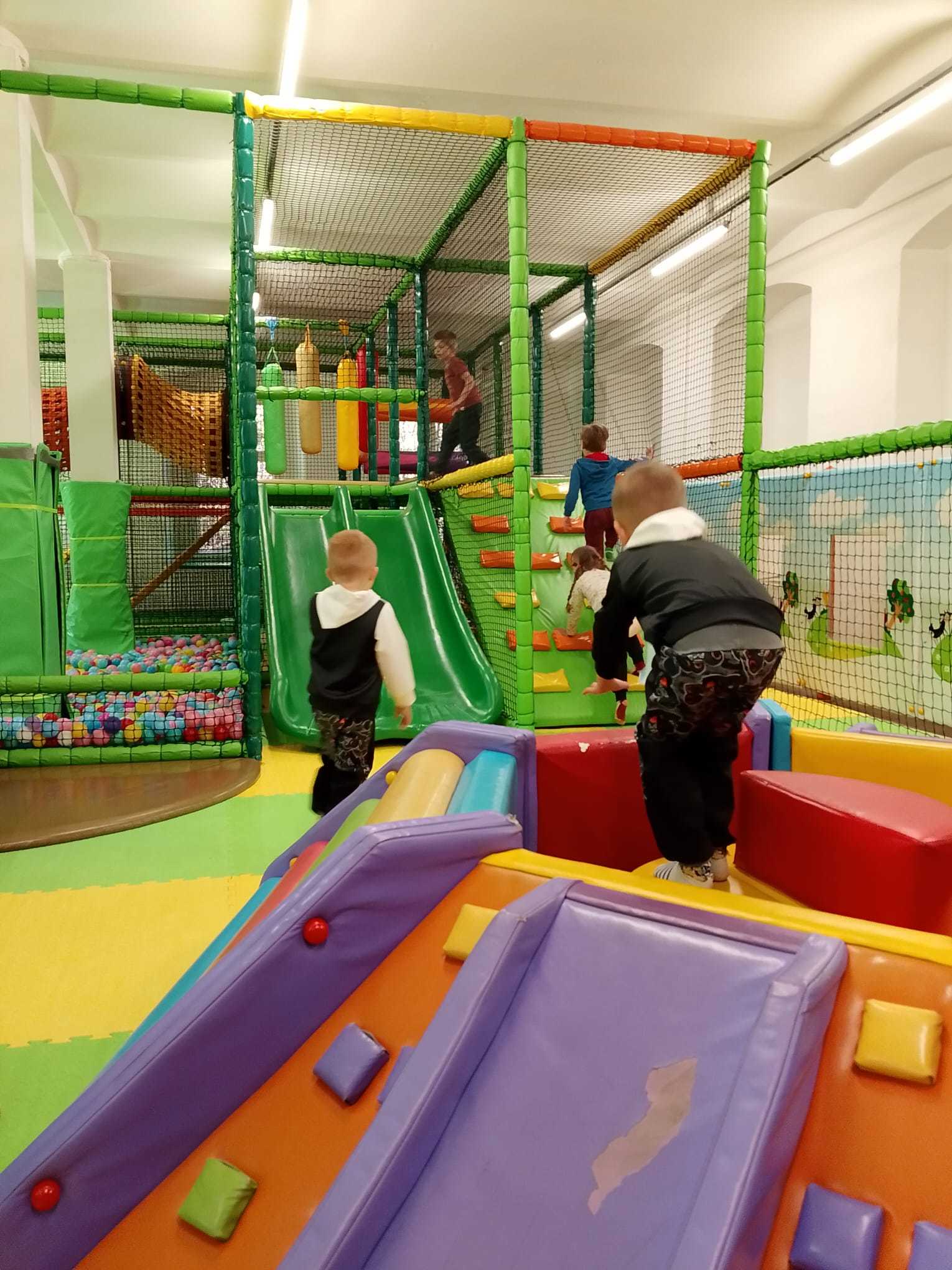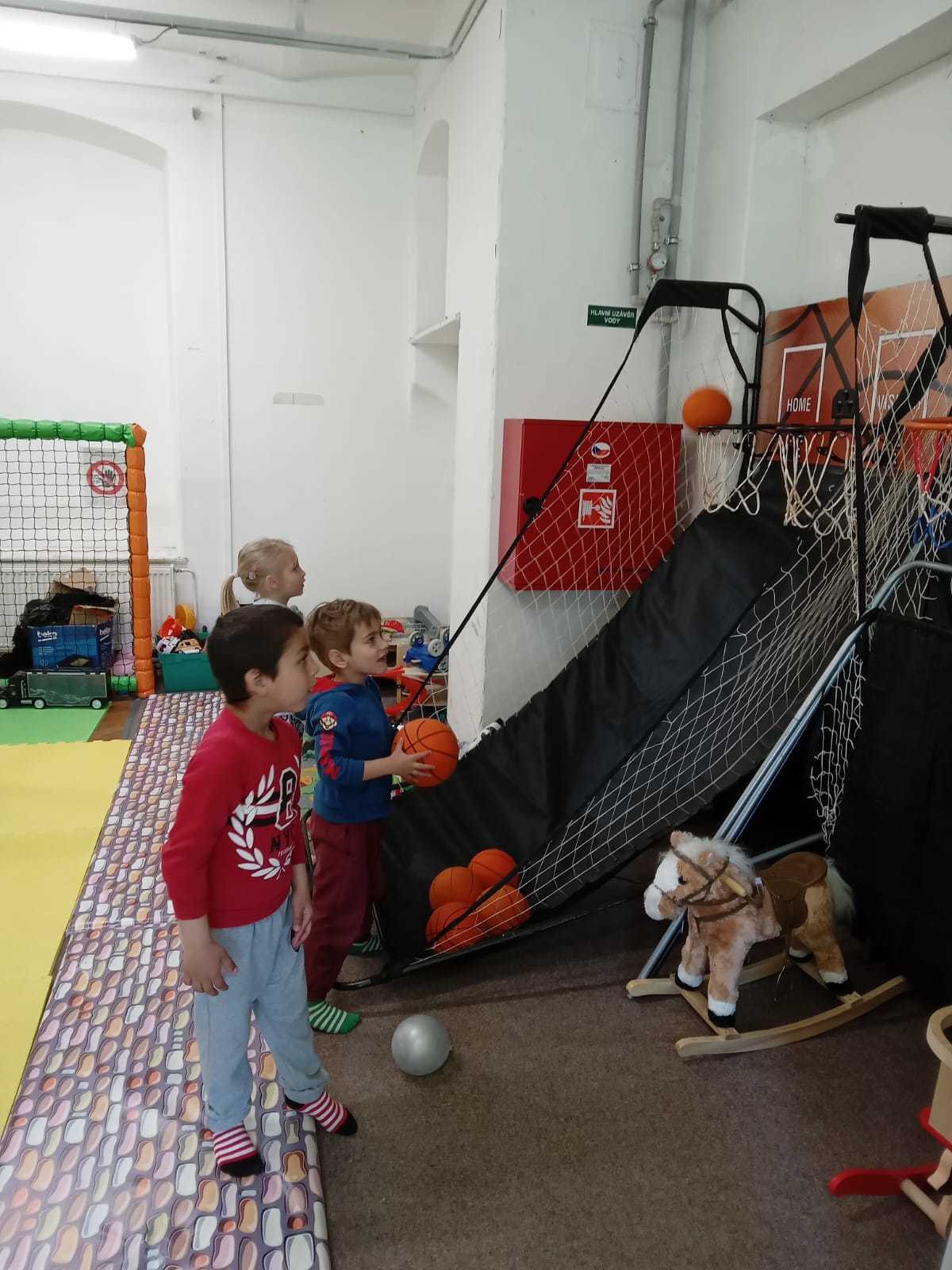 Děti využily čas v herně na maximum. Jezdily po dráze na odstrkovadlech, prolézaly všechny možné prolézačky a překážky, skákaly na trampolíně a velký úspěch měly také bazénky plné malých míčků. S nadšením si hrály s velkými kostkami, vařily v dětské kuchyňce a zkoušely svou přesnost při házení basketbalových míčů na koš. Každý si našel něco, co ho bavilo, a radost byla vidět na všech stranách.