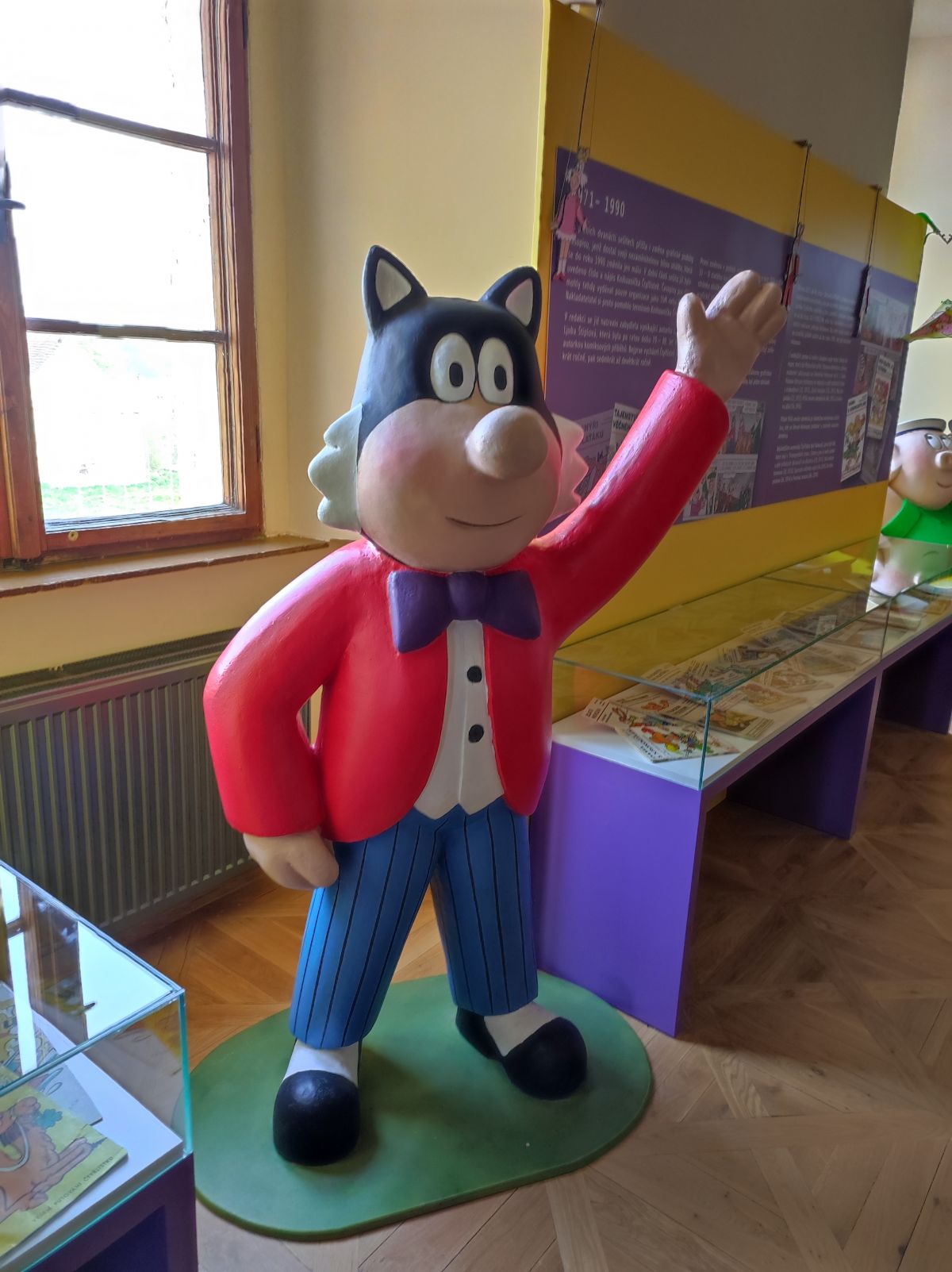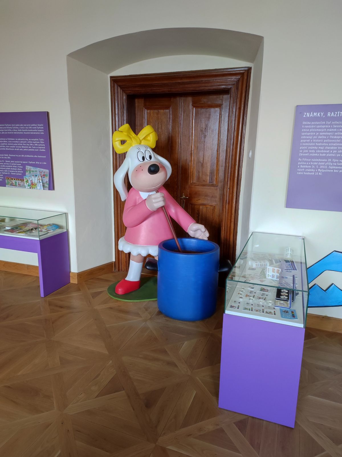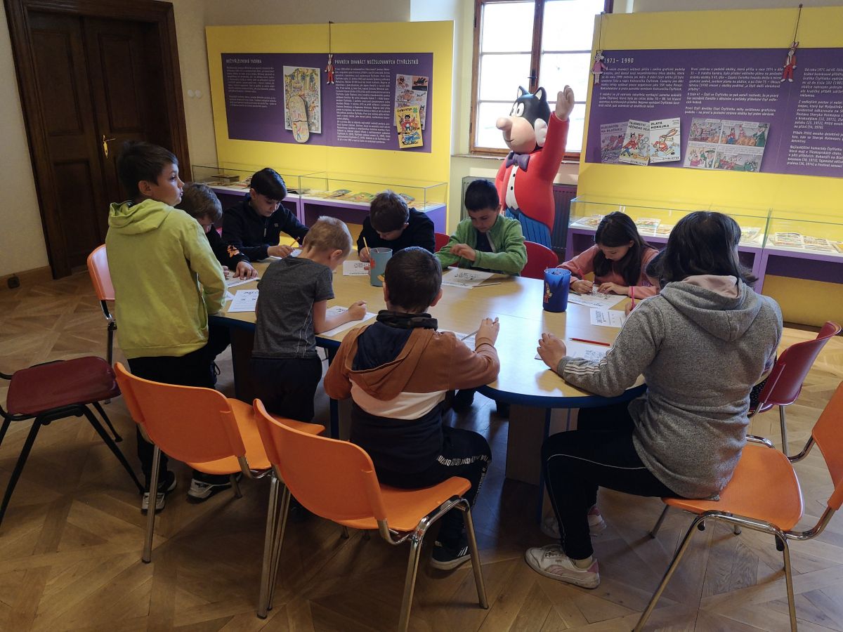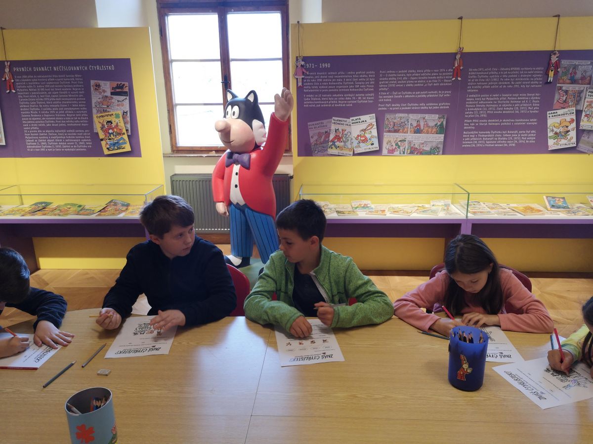 V další části prohlídky byly děti seznámeny s hlavními postavami komiksu a jejich povahami. Myšpulín je bystrý vynálezce, Bobík – nebojácný silák, Fifinka je hodná, pečující a stará se o domácnost, Pinďa jako tichý a bojácný, nejméně výrazný. Byla zmíněna i záporná postava Zádrhela, která se v pohádkových příbězích vyskytuje. Odborník dětem vysvětlil, proč Zádrhel vypadá jako Superman. Autor se skutečně nechal postavou Supermana inspirovat. Současně se děti dozvěděly zajímavost spojenou s počtem vlasů Zádrhela, který je na každém obrázku odlišný a je spojený s náladou postavy (spokojený, rozzlobený). Děti zde potkaly jednotlivé postavy v životní velikosti, což byl pro ně velký zážitek. Děti se vyfotily v Myšpulínově automobilu a v tematickém foto-koutku.