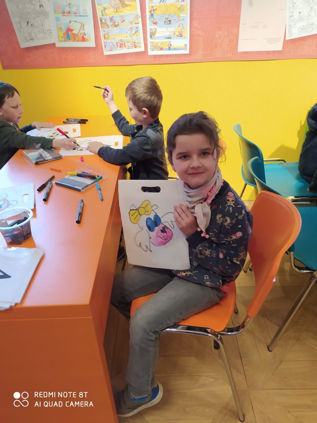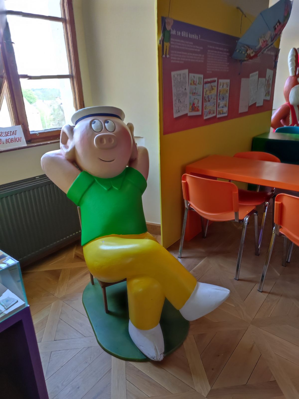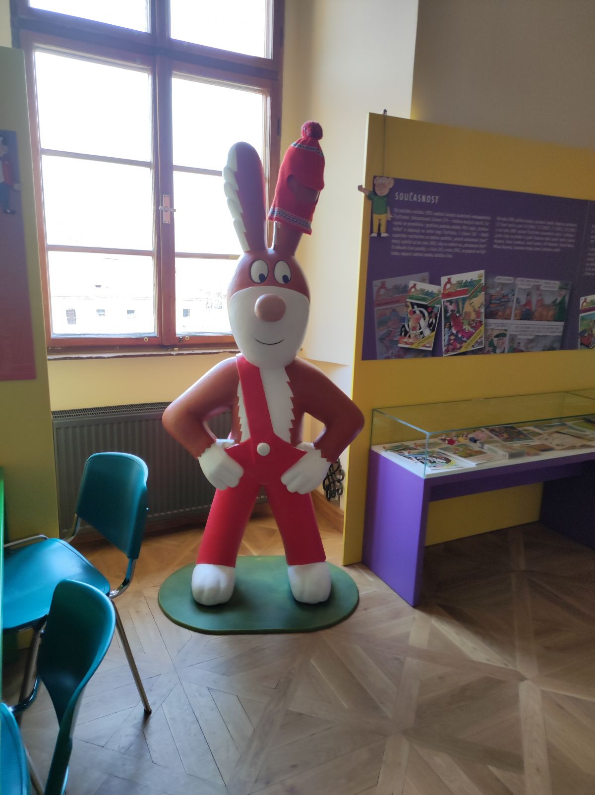 V další části prohlídky byly děti seznámeny s hlavními postavami komiksu a jejich povahami. Myšpulín je bystrý vynálezce, Bobík – nebojácný silák, Fifinka je hodná, pečující a stará se o domácnost, Pinďa jako tichý a bojácný, nejméně výrazný. Byla zmíněna i záporná postava Zádrhela, která se v pohádkových příbězích vyskytuje. Odborník dětem vysvětlil, proč Zádrhel vypadá jako Superman. Autor se skutečně nechal postavou Supermana inspirovat. Současně se děti dozvěděly zajímavost spojenou s počtem vlasů Zádrhela, který je na každém obrázku odlišný a je spojený s náladou postavy (spokojený, rozzlobený). Děti zde potkaly jednotlivé postavy v životní velikosti, což byl pro ně velký zážitek. Děti se vyfotily v Myšpulínově automobilu a v tematickém foto-koutku.
