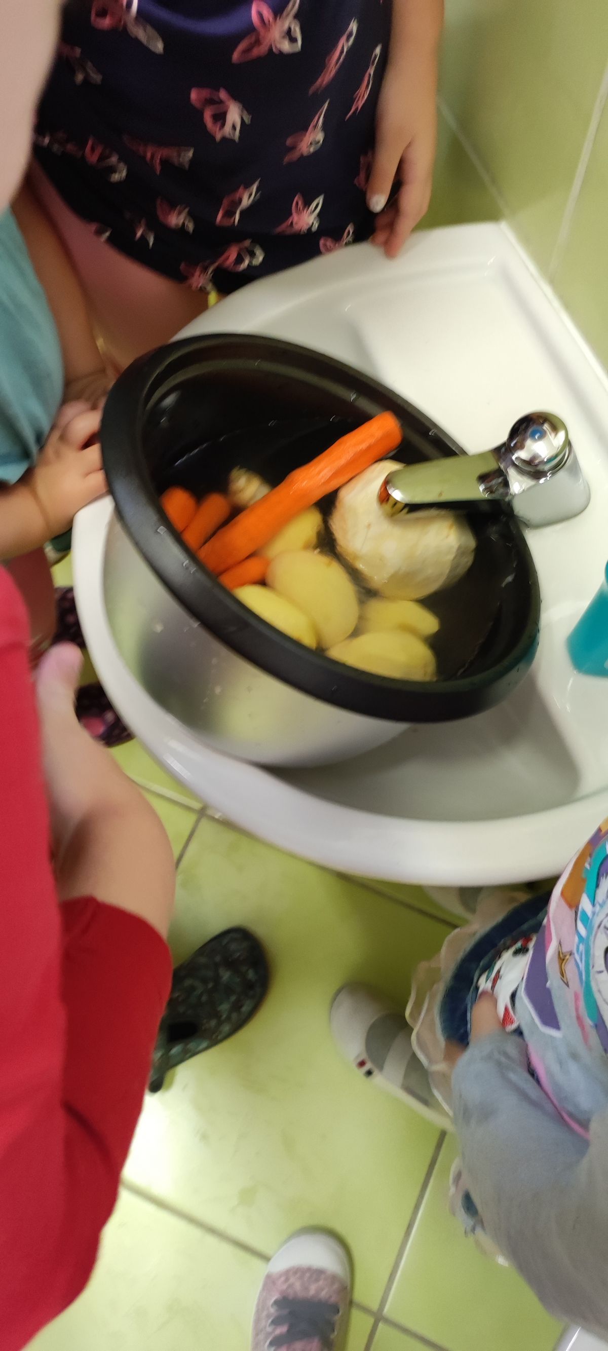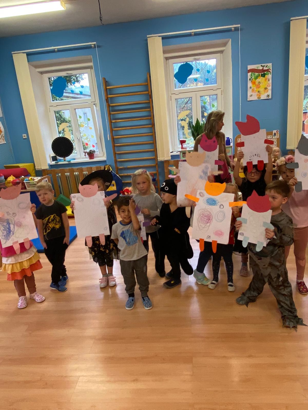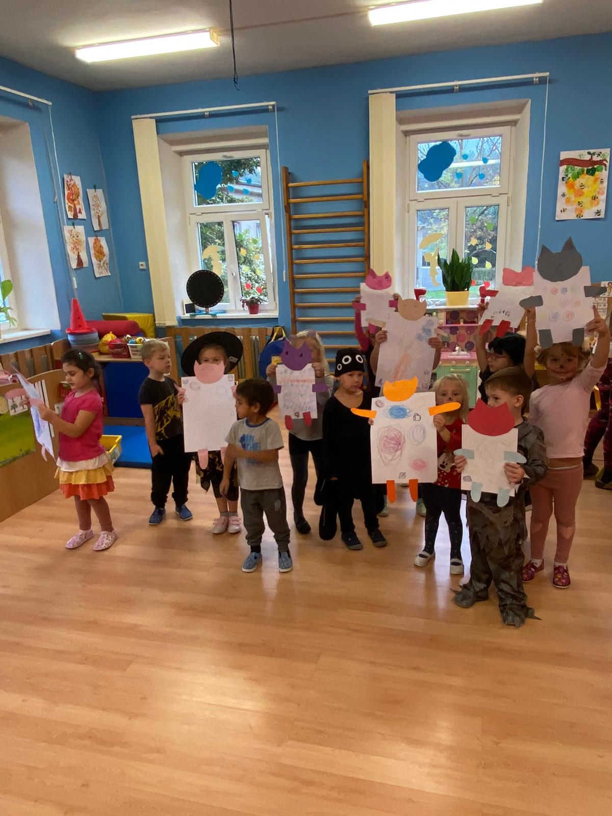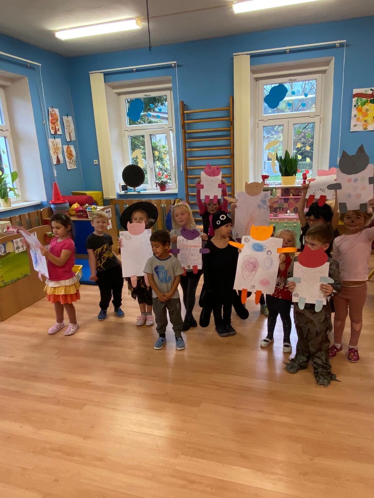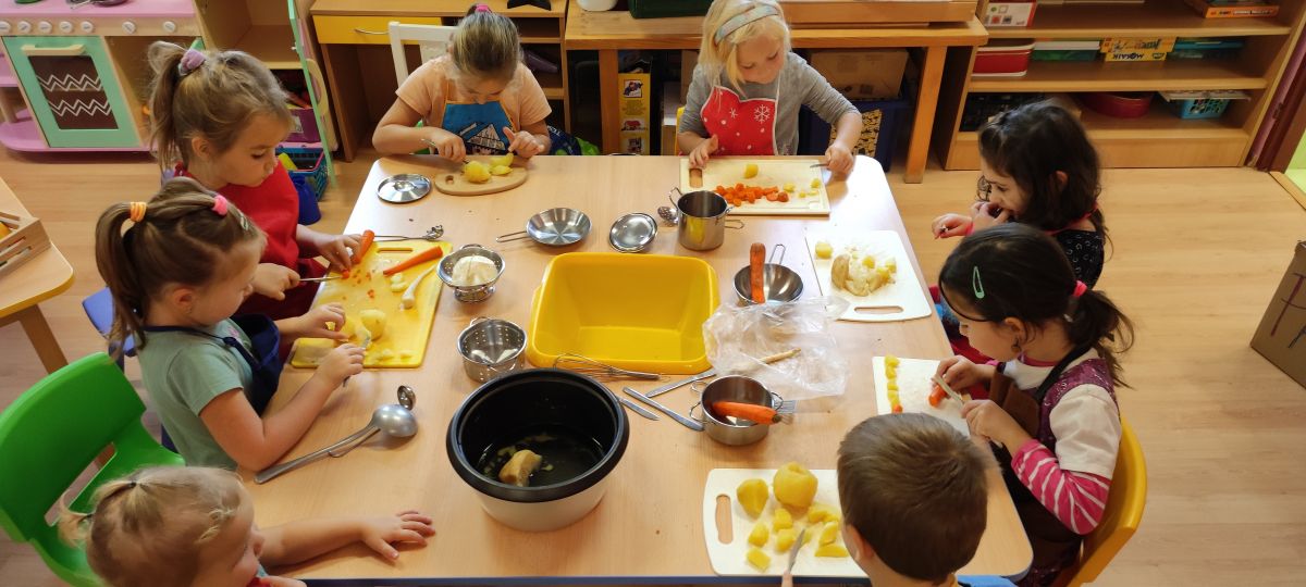 Nejprve jsme si přečetli pohádku, seznámili se s příběhem a pojmenovali si potraviny, které Pejsek s Kočičkou přidali do dortu. K zapamatování si ingrediencí jsme využili i naši robotickou pomůcku. Počítali a trénovali jsme čísla 1 a 2. Zpívali jsme písničky Kočka leze dírou a narozeninovou písničku s doprovodem na hudební nástroj. Vyprávěli jsme si také, jak se různě mohou slavit narozeniny a co k tomu patří. Například takový bramborový salát. No, a tak jsme se rozhodli, že si takový salát uděláme také. Než jsme se pustili do samotného vaření, vyrobili jsme si každý svou barevnou zástěru. Na přípravu našeho salátu si paní učitelky připravili obrázkový recept, ingredience (celer, mrkev, petržel, brambory). Děti určovaly, co do našeho salátu patří a co ne. Polovinu ingrediencí jsme dali vařit do samovarného hrnce. Pozorováním jsme zjistili že z hrnce uniká pára, která se vysráží na studeném okně a jako kapky stékají dolů. A hle, byl tu i pokus s koloběhem vody v přírodě. Po vychladnutí si děti samy zkoušely rozdíl mezi krájením syrové a vařené zeleniny, předávaly si zkušenosti sebou, hodnotily a komentovaly činnost. Nakonec všechnu zeleninu promíchali a ochutili solí, octem a špetičkou cukru. Hotový salát všem moc chutnal a nezapomněli dát ochutnat také školákům a paním učitelkám.