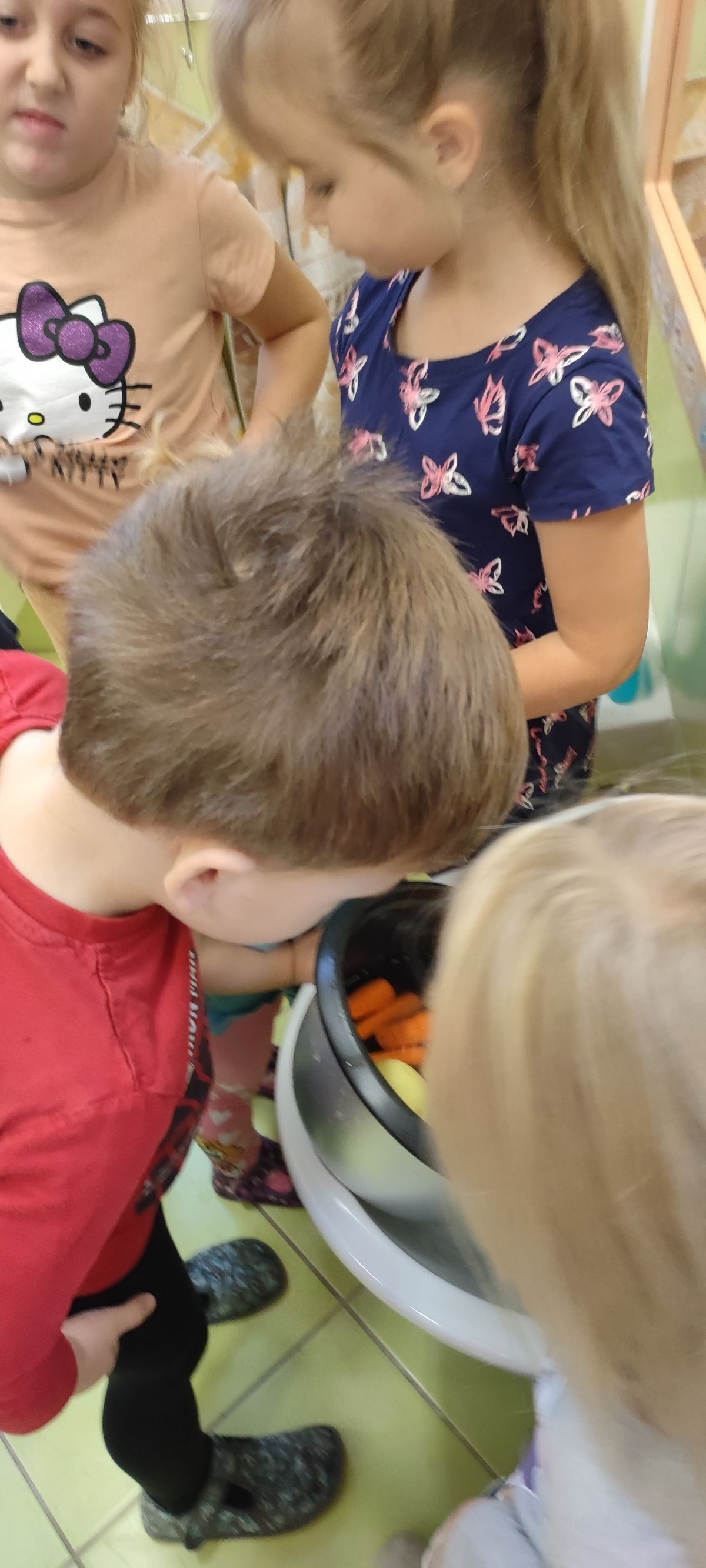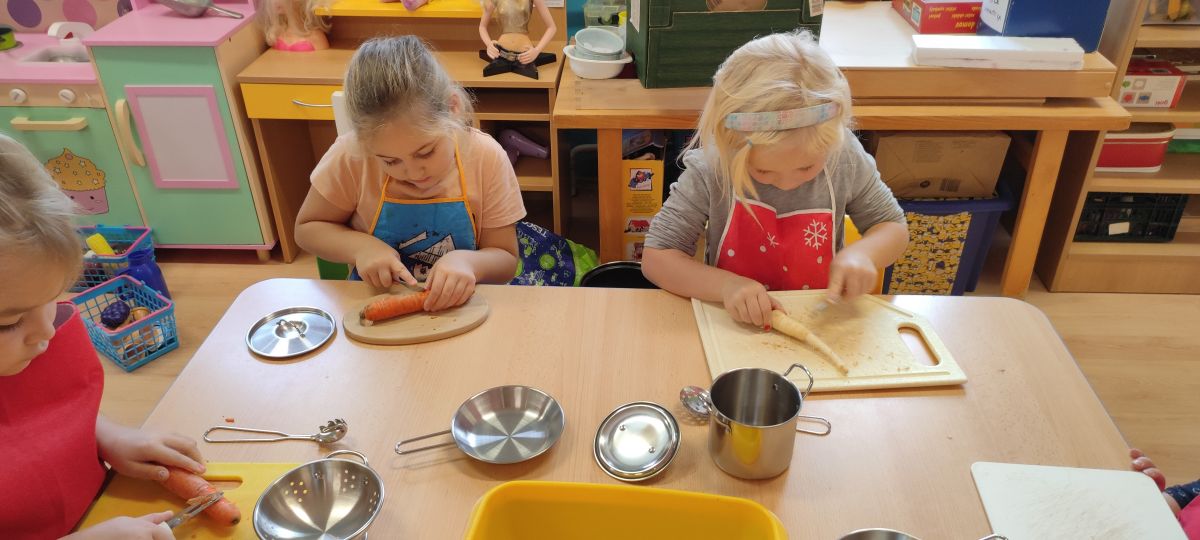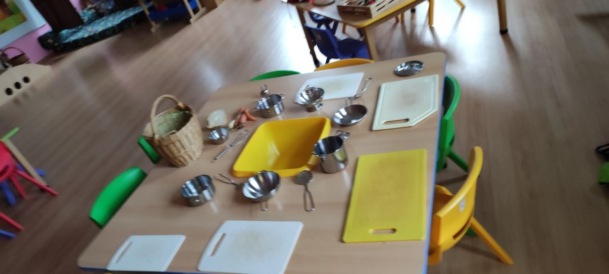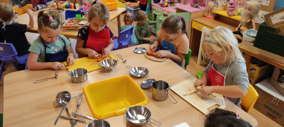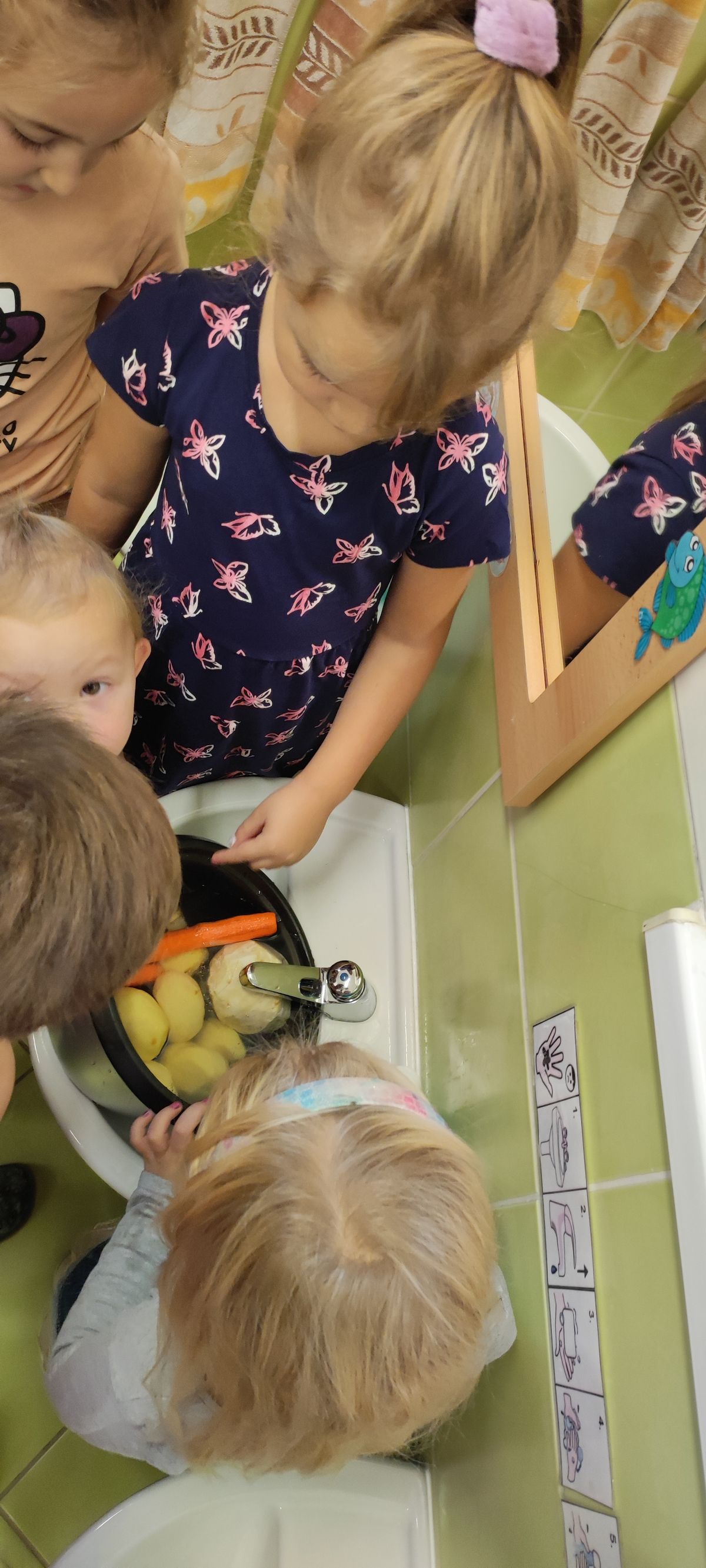 Nejprve jsme si přečetli pohádku, seznámili se s příběhem a pojmenovali si potraviny, které Pejsek s Kočičkou přidali do dortu. K zapamatování si ingrediencí jsme využili i naši robotickou pomůcku. Počítali a trénovali jsme čísla 1 a 2. Zpívali jsme písničky Kočka leze dírou a narozeninovou písničku s doprovodem na hudební nástroj. Vyprávěli jsme si také, jak se různě mohou slavit narozeniny a co k tomu patří. Například takový bramborový salát. No, a tak jsme se rozhodli, že si takový salát uděláme také. Než jsme se pustili do samotného vaření, vyrobili jsme si každý svou barevnou zástěru. Na přípravu našeho salátu si paní učitelky připravili obrázkový recept, ingredience (celer, mrkev, petržel, brambory). Děti určovaly, co do našeho salátu patří a co ne. Polovinu ingrediencí jsme dali vařit do samovarného hrnce. Pozorováním jsme zjistili že z hrnce uniká pára, která se vysráží na studeném okně a jako kapky stékají dolů. A hle, byl tu i pokus s koloběhem vody v přírodě. Po vychladnutí si děti samy zkoušely rozdíl mezi krájením syrové a vařené zeleniny, předávaly si zkušenosti sebou, hodnotily a komentovaly činnost. Nakonec všechnu zeleninu promíchali a ochutili solí, octem a špetičkou cukru. Hotový salát všem moc chutnal a nezapomněli dát ochutnat také školákům a paním učitelkám.