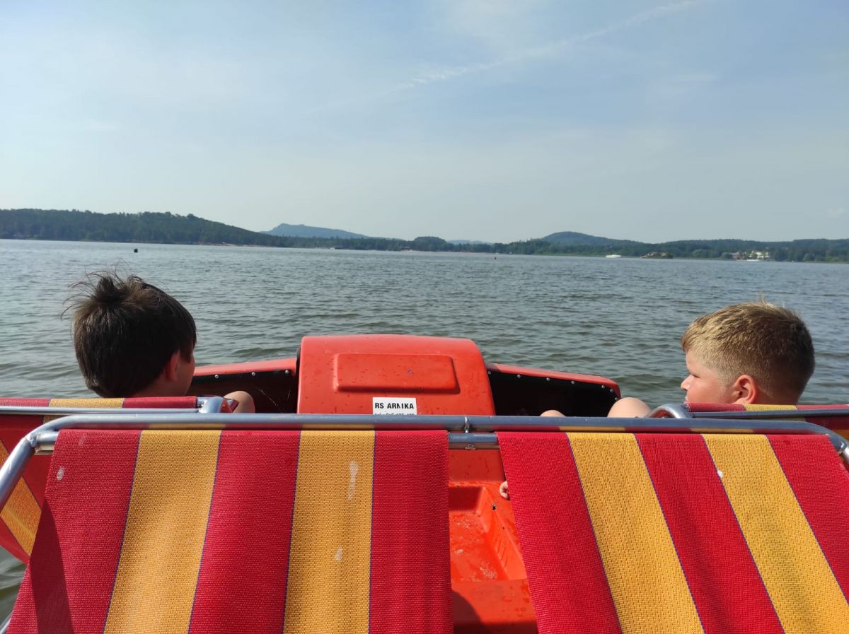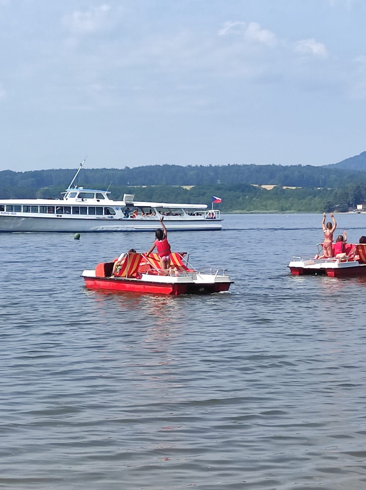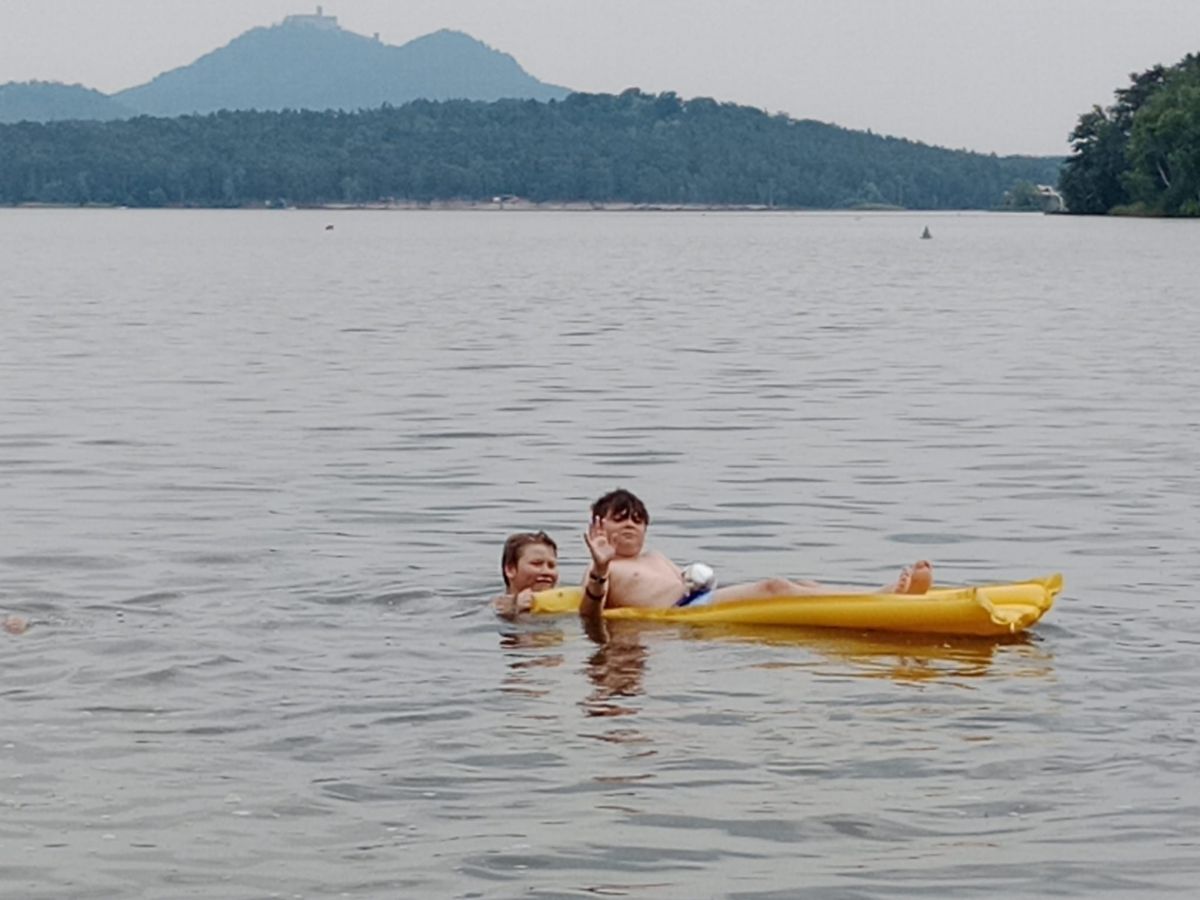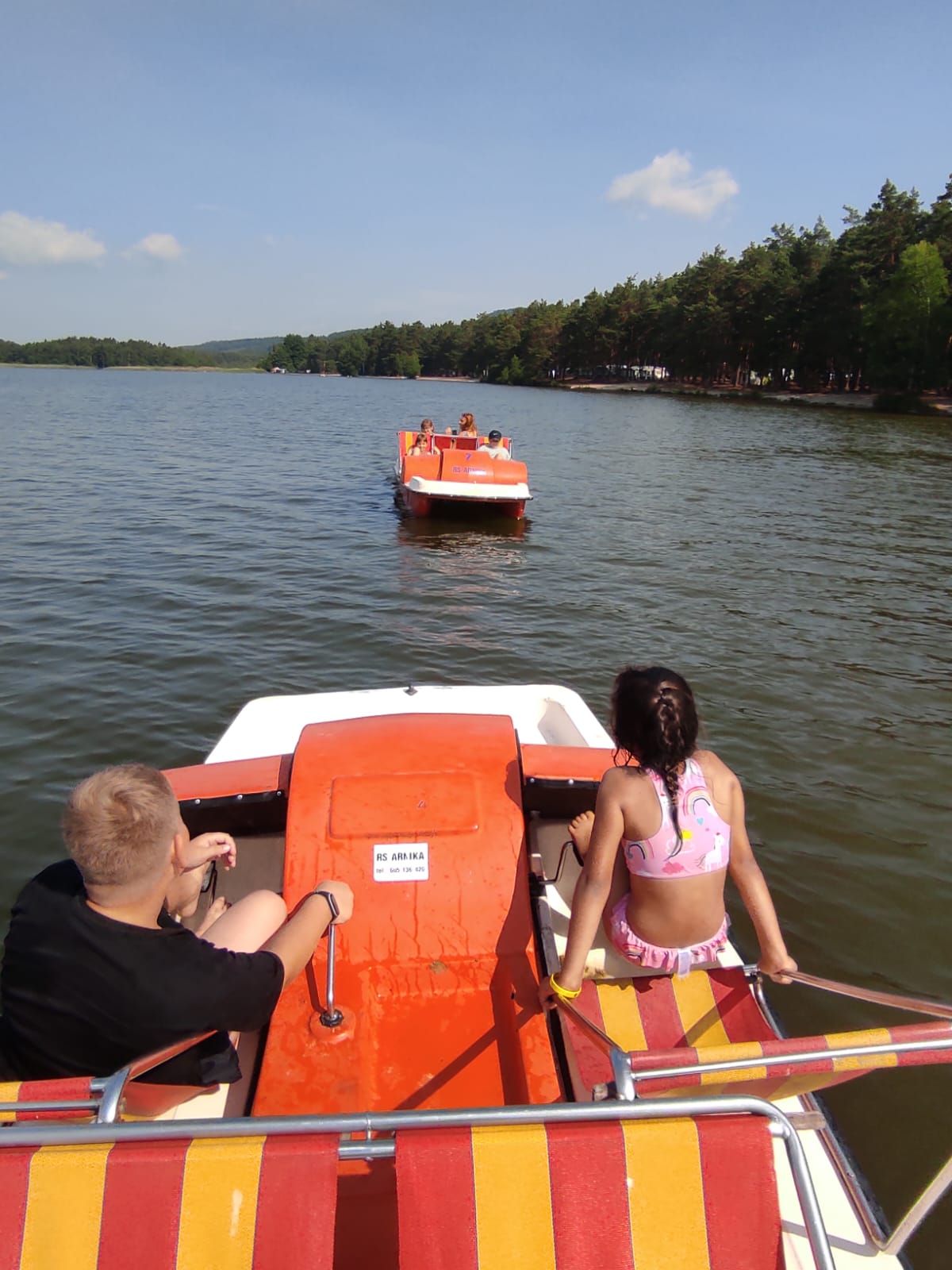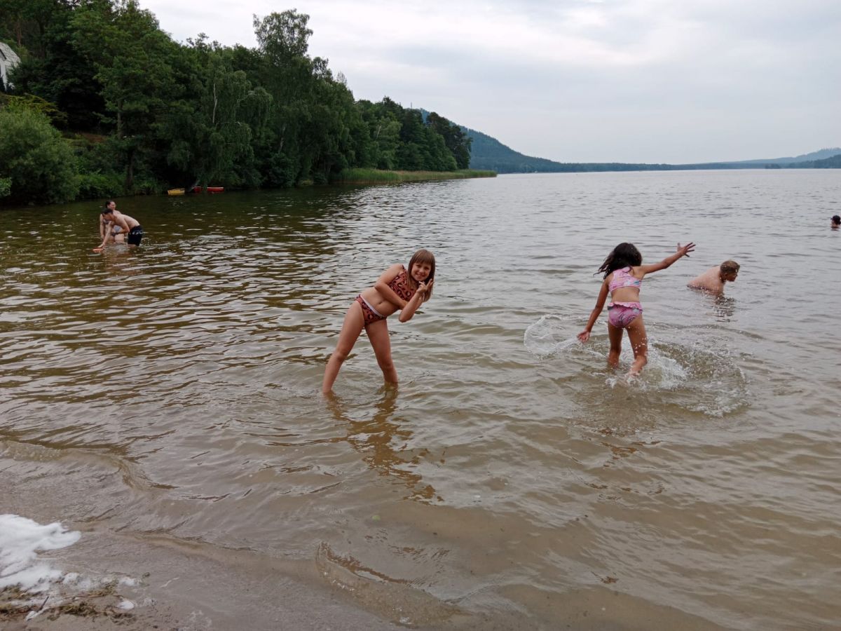 Výlet do Starých Splavů se nám pěkně vydařil. Prošli jsme se jedinečným borovým lesem, kde jsme si natrhali sladké borůvky dokonce i ve společnosti datlů. Po vydatném obědě jsme vyrazili k Máchovu jezeru, kam se děti moc těšily na vodní hrátky a bylo obtížné je dostat z jezera ven. Poté jsme jako správní trempové postavili stany, nasbírali dřevo a uvařili guláš v kotlíku. Večer byl poněkud strašidelný. Děti výtvarně znázornily bytosti, kterých se bojí a také se namaskovaly, aby se mohly vydat na stezku odvahy. Tam na ně čekala strašidla a plnění různých úkolů. Děti byly odvážné a výzvy výborně zvládly. Zkušeně ukořistily poklad a odměnou jim byly medaile a diplomy s pasováním na superhrdiny a nebojsy. Druhý den nám počasí opravdu přálo, tak jsme podnikli vyjížďku na šlapadlech. Výlet jsme si náramně užili. Děkujeme paní Vtipilové za možnost být v malebném prostředí chaty a skvělou spolupráci.